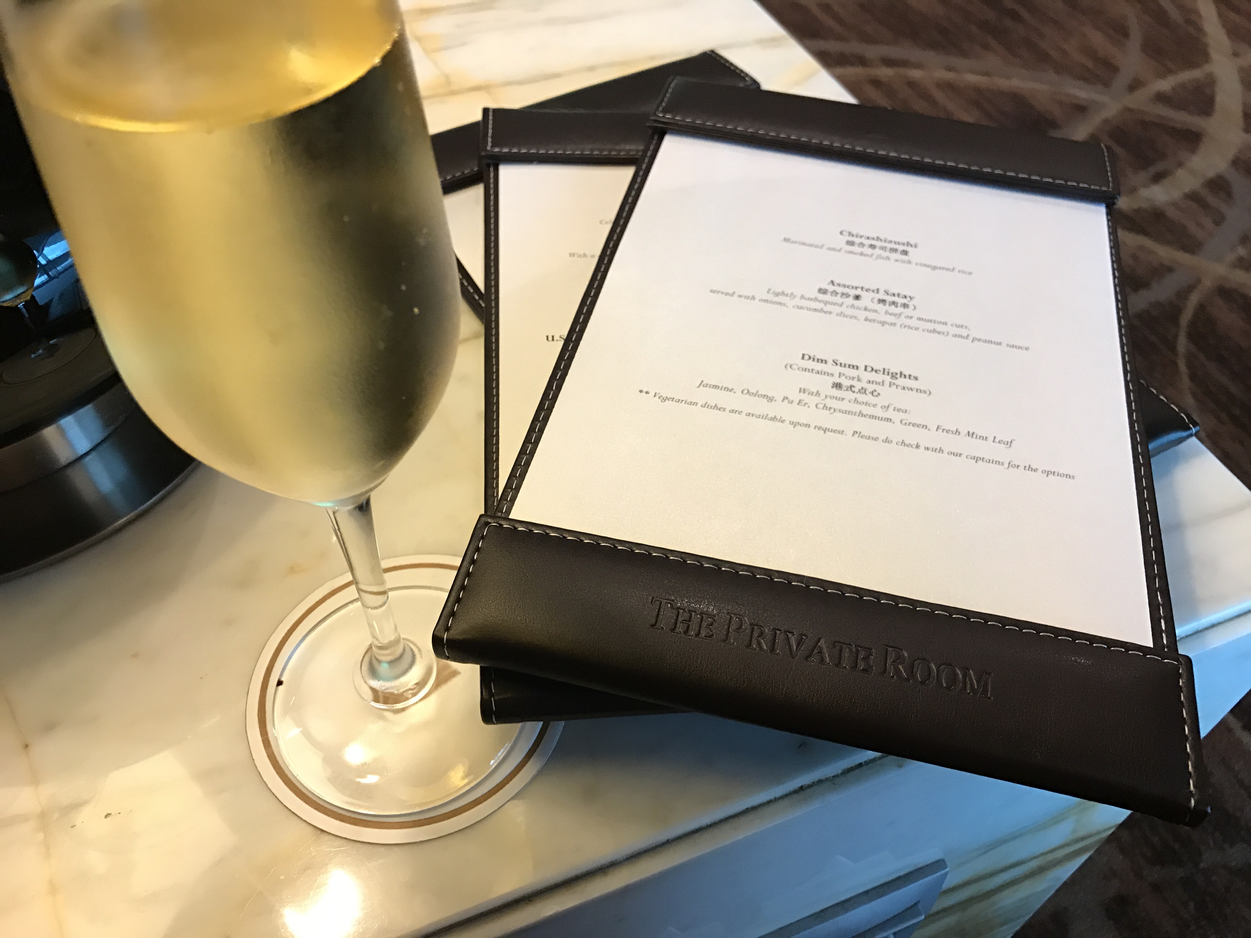 We initially sat by the window to get a good view of the tarmac. Upon sitting down we were approached by 2 friendly lounge attendants who handed us the wine and dining menus. My companion and I both opted for a glass of champagne. I asked for the Singapore Airlines signature satay, while my companion ordered the burger. We were asked if we wanted to dine in the dining area when the food is ready and we agreed. We were soon brought our champagne, and offered a few refills while waiting for our food.