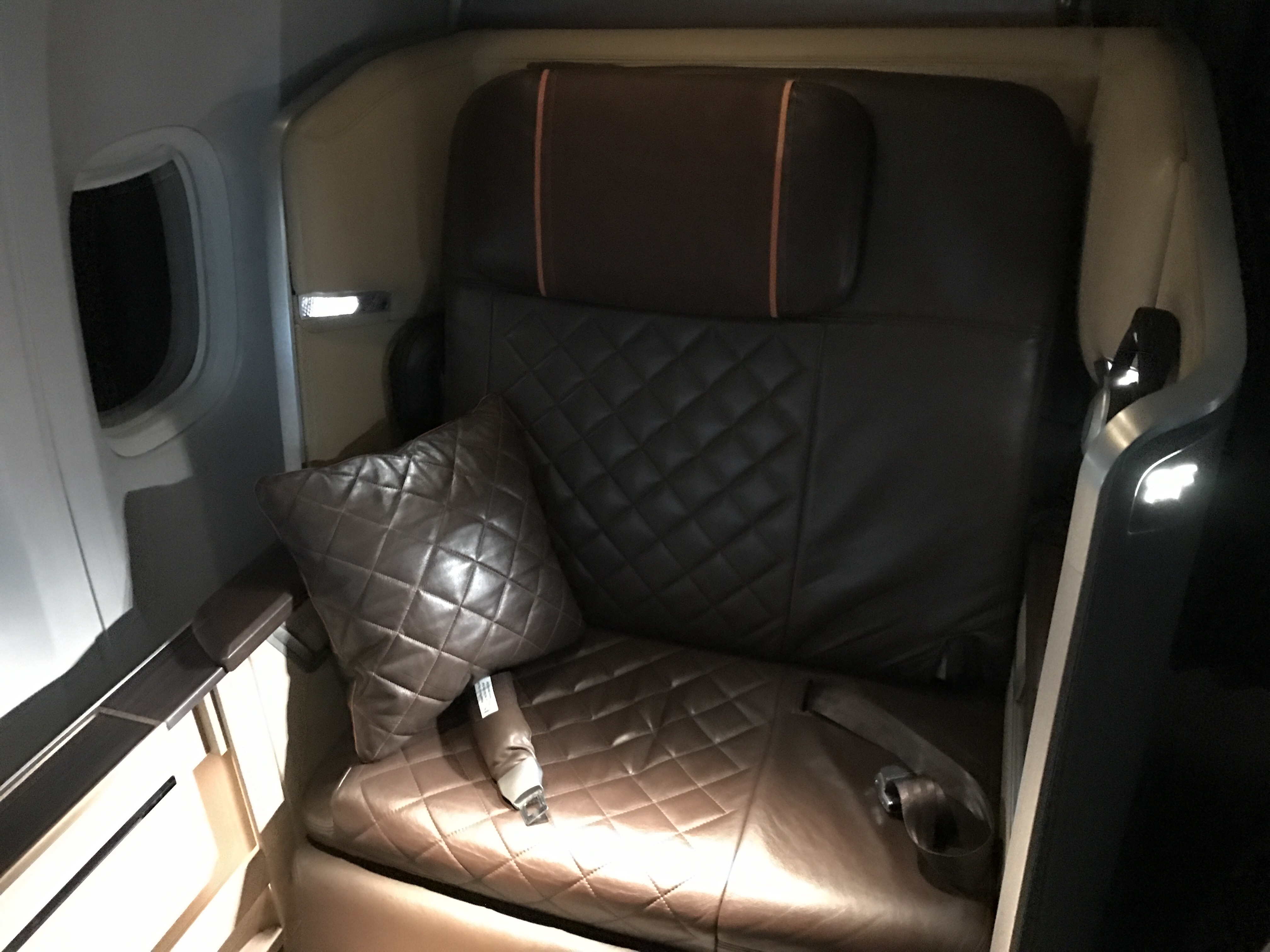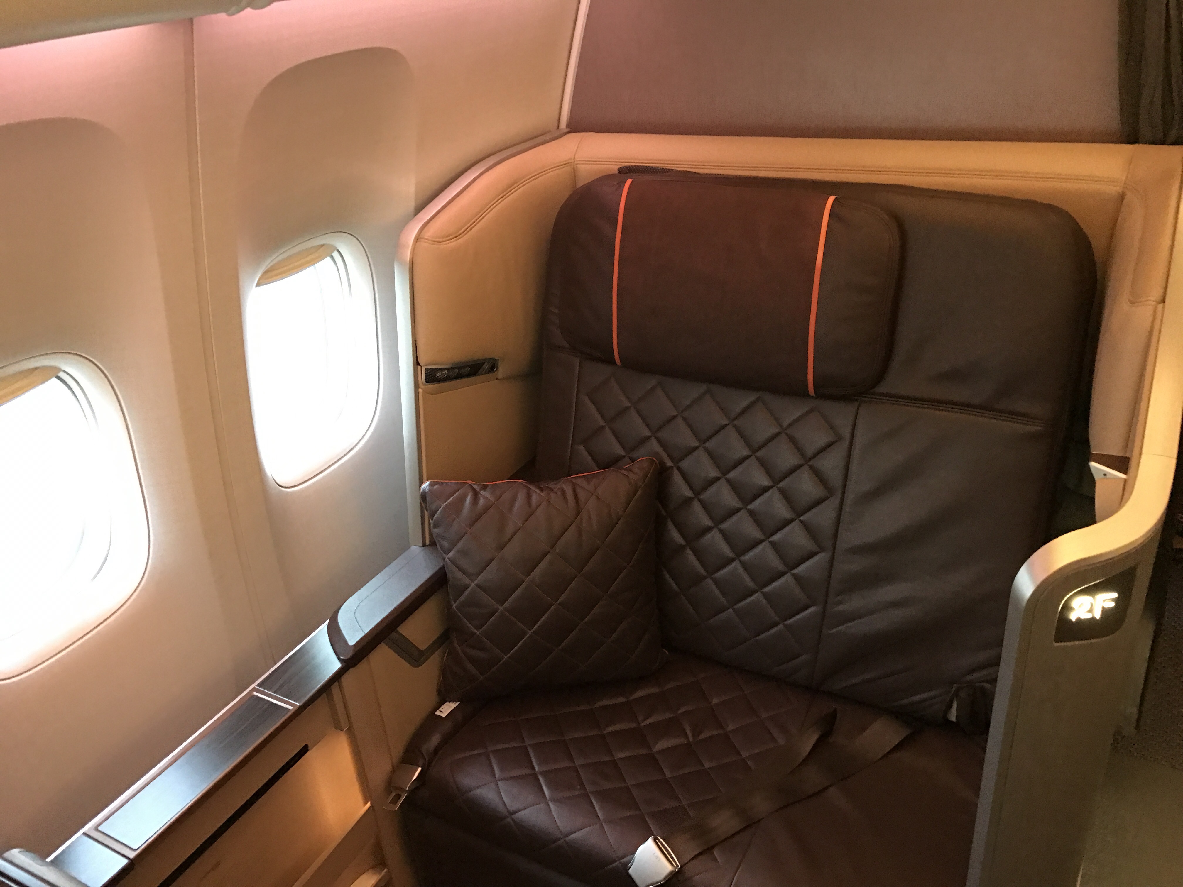 I was seated in 2F, while my companion was in 1F. The first class cabin on Singapore Airlines’ Boeing 777-300ER consists of 8 seats in a 1-2-1 configuration. This aircraft had the new refurbished first class seats. The seats are beautiful, with warm touches consistent with the Singapore Airlines aesthetic. They reminded me of SQ’s wide business class seats, but with slightly better legroom. There were no overhead bins in First Class. Instead, there is space in front of you on the floor where you stow your luggage.