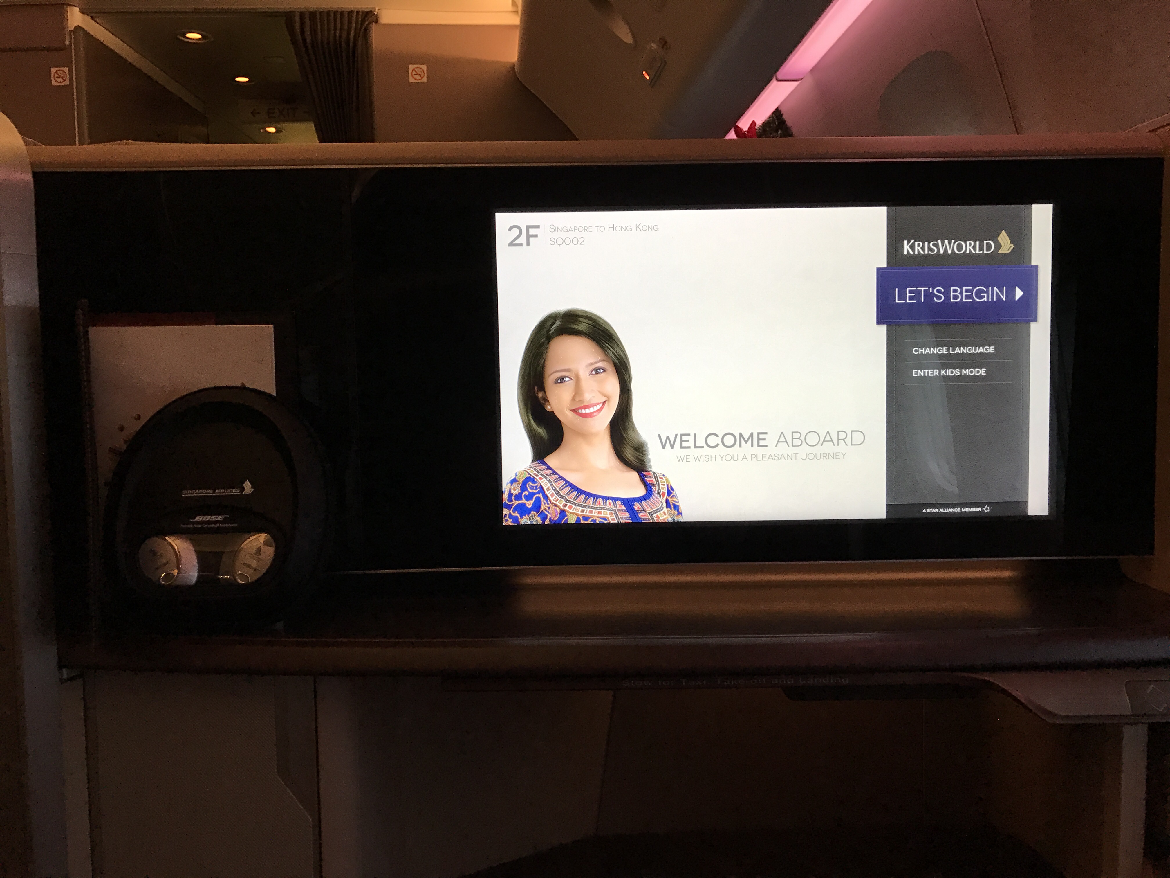 Upon settling in, we were offered a pre-departure beverage, in which I asked for the Krug. The flight attendant soon came back with my order along with a hot towel. I really love how Singapore Airlines offer both Krug and Dom Perignon in First Class. Sadly, since this was a regional flight, no amenity kits, or pajamas were distributed to first class passengers terminating in Hong Kong. Instead, we were offered slippers and socks. Also waiting at our seats were the dining menu and Bose Noise Canceling Headphones.