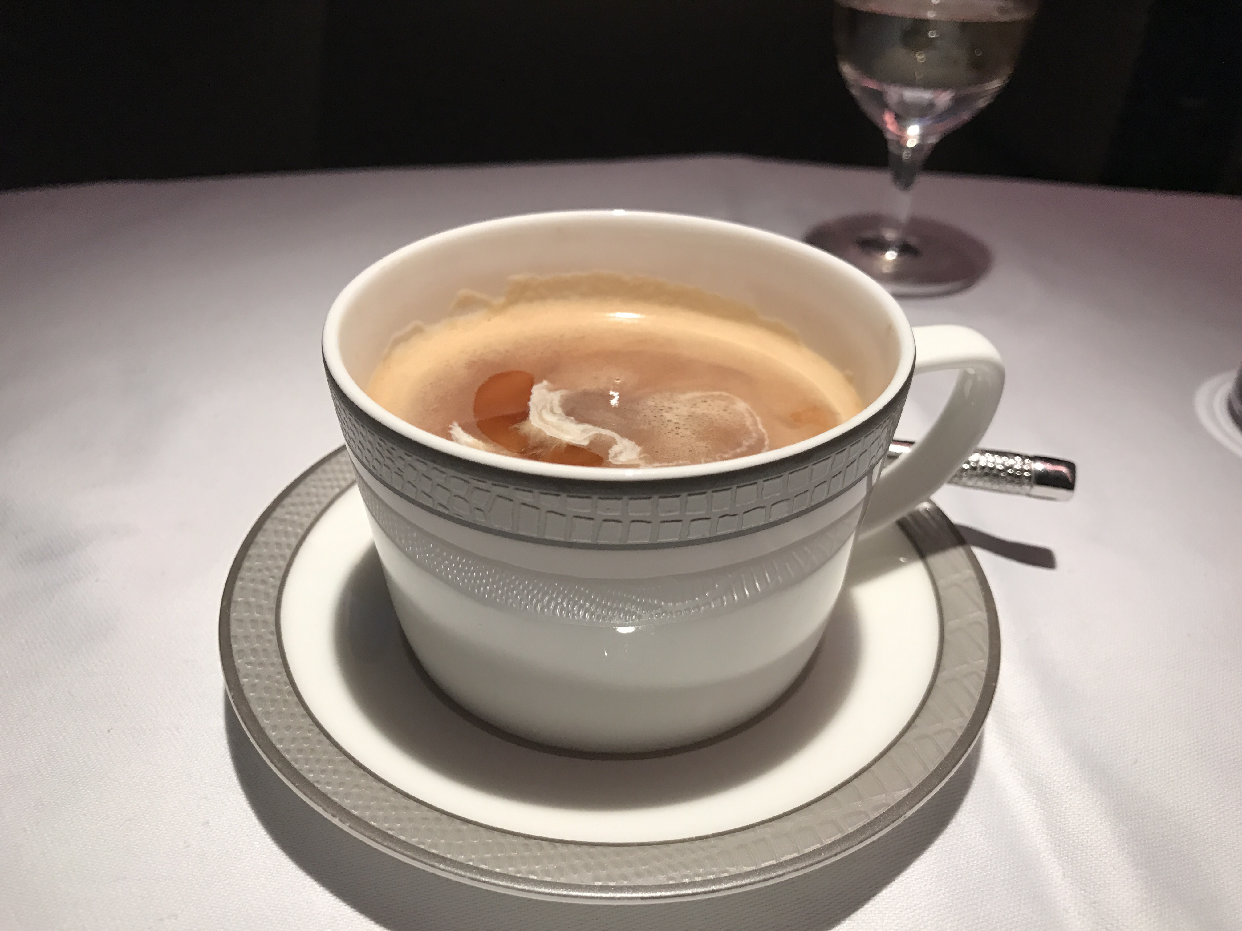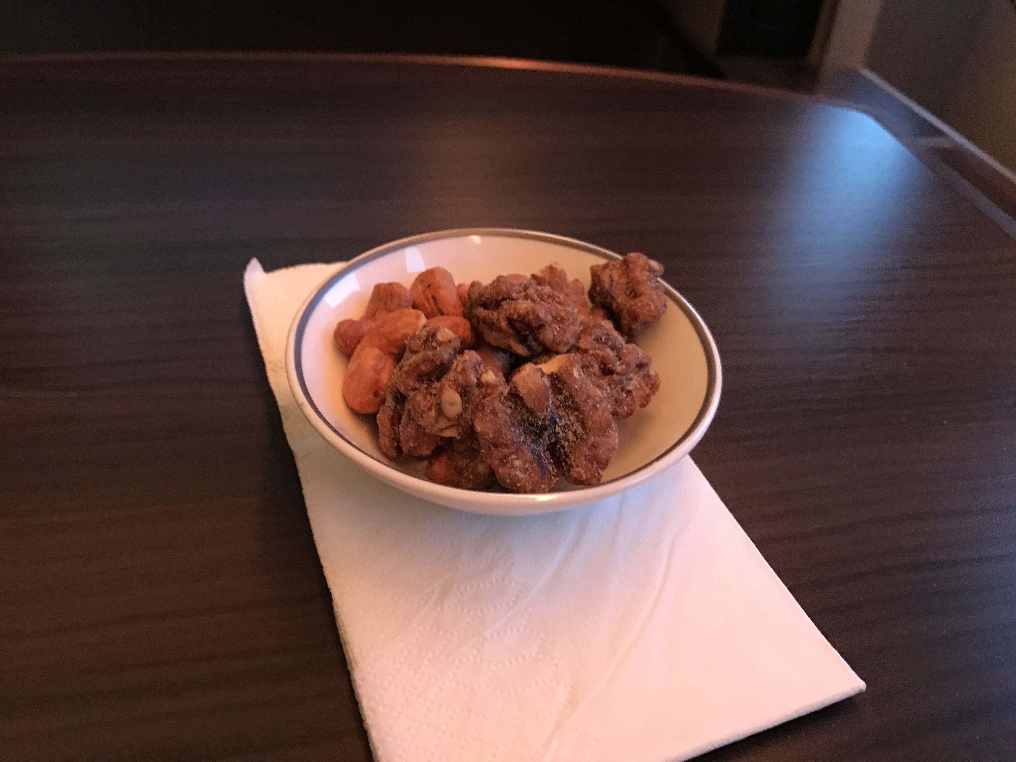 A few minutes later, the seatbelt sign was turned off, and the meal service began. The flight attendant came back with another hot towel and asked what I wanted to drink. I said that I would just continue on with the Krug. She soon came back with my order along with some warm nuts.