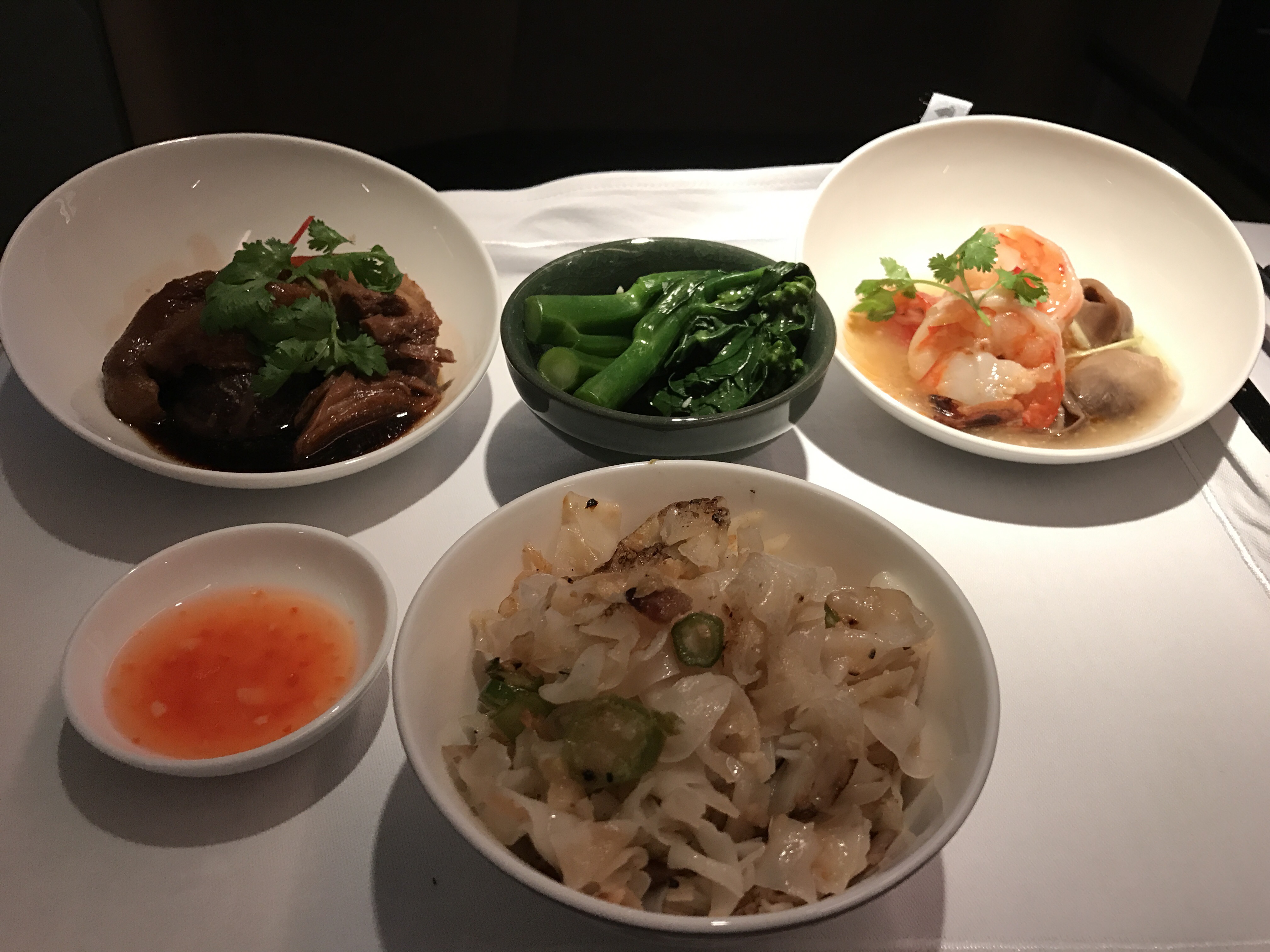 The next course was the main entrée tray, it was Char Kway Teow with side dishes of roast duck, prawns, and gai lan. This was possibly one of the best main entrées I’ve ever eaten on a plane.