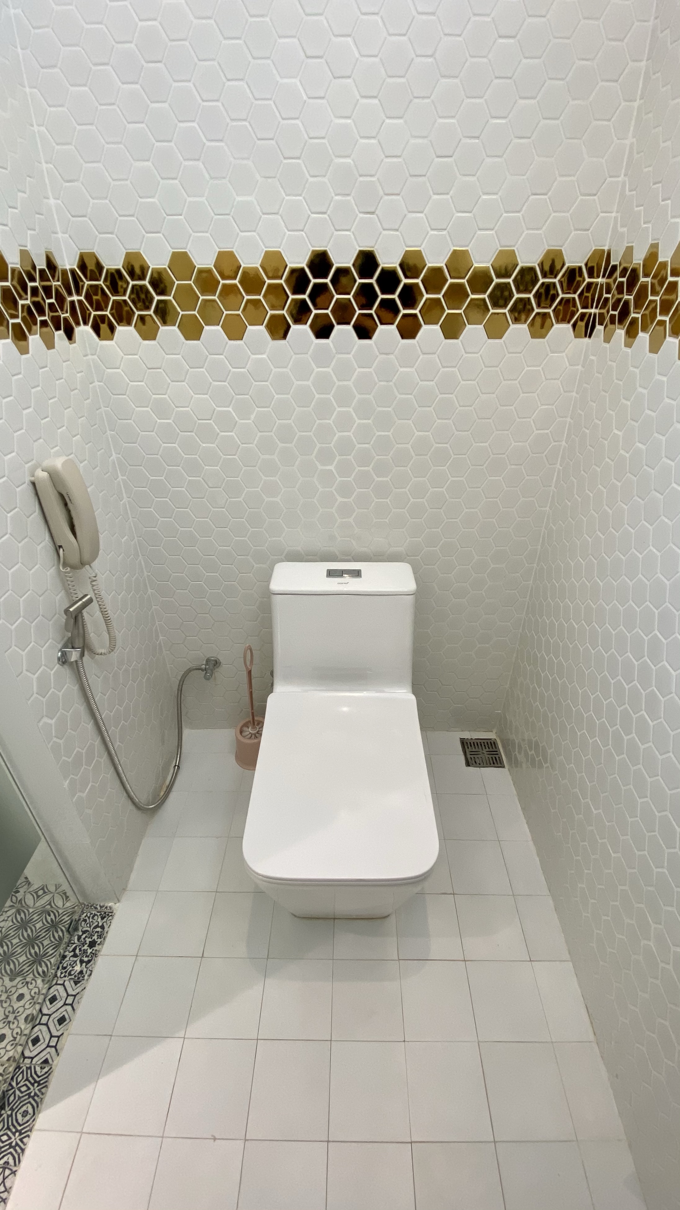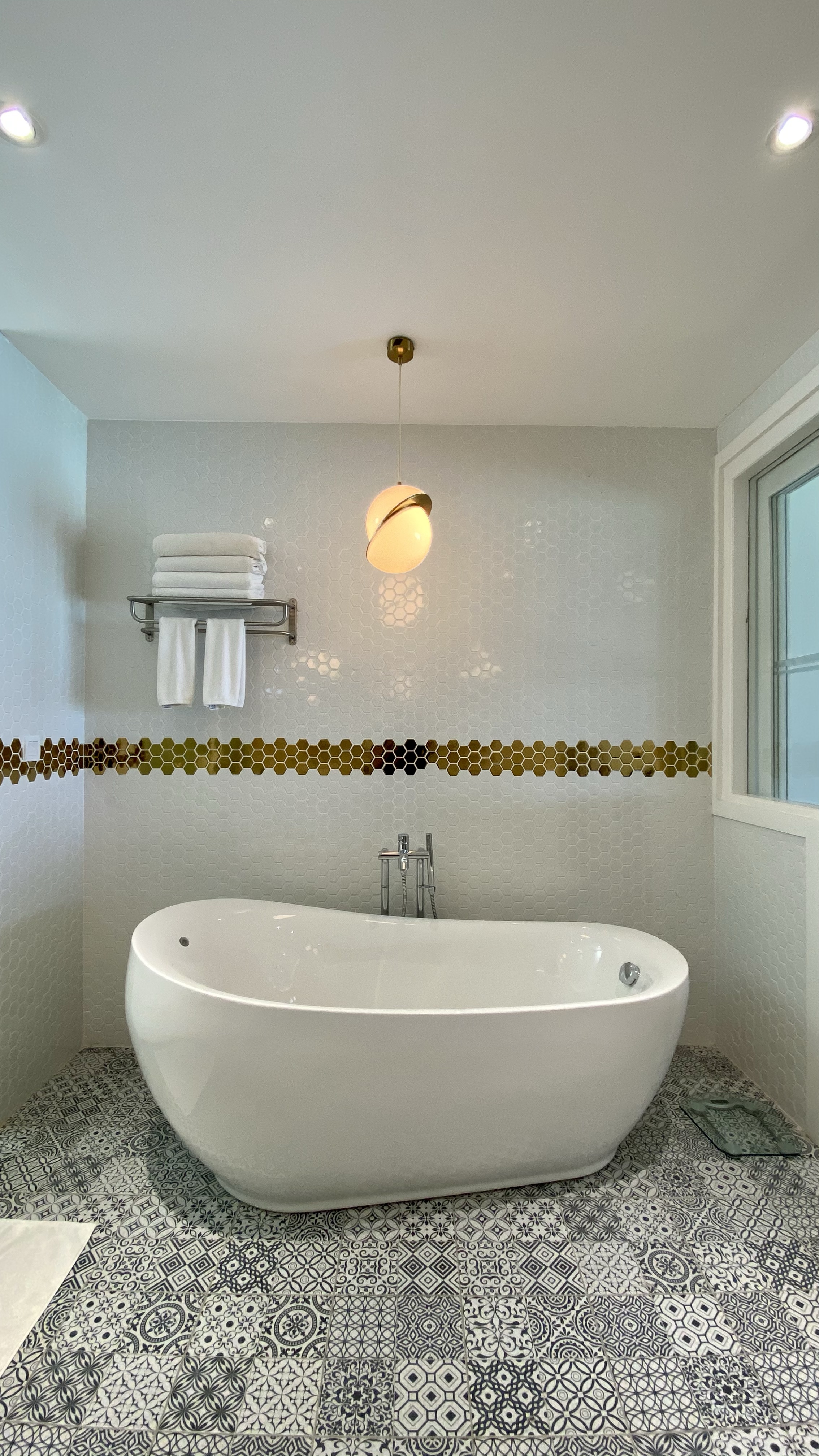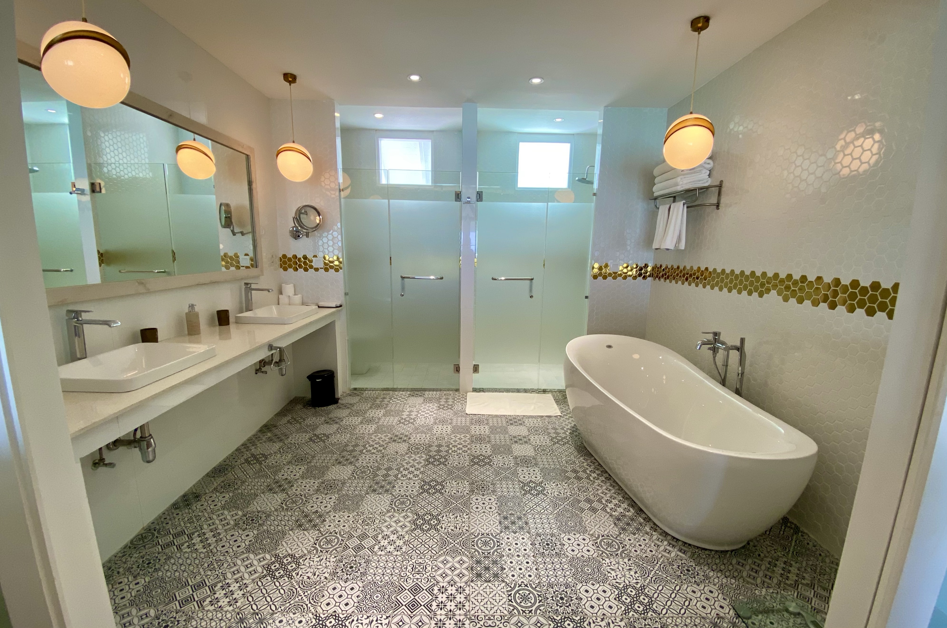 The bathroom was bright and a good size with a free-standing bathtub, 2 sinks, a separate toilet with spray bidet (douchette), and shower. Shampoo, conditioner, body wash and hand soap were provided. The resort does not use single-use plastic toiletries, which is very much appreciated. There was a weird smell in the toilet on our first day, which I believe was due to the drain. We sprayed the floor with the douchette and the smell went away. The shower was also very slow to drain during our stay, which wasn’t an issue for us but could be for others.