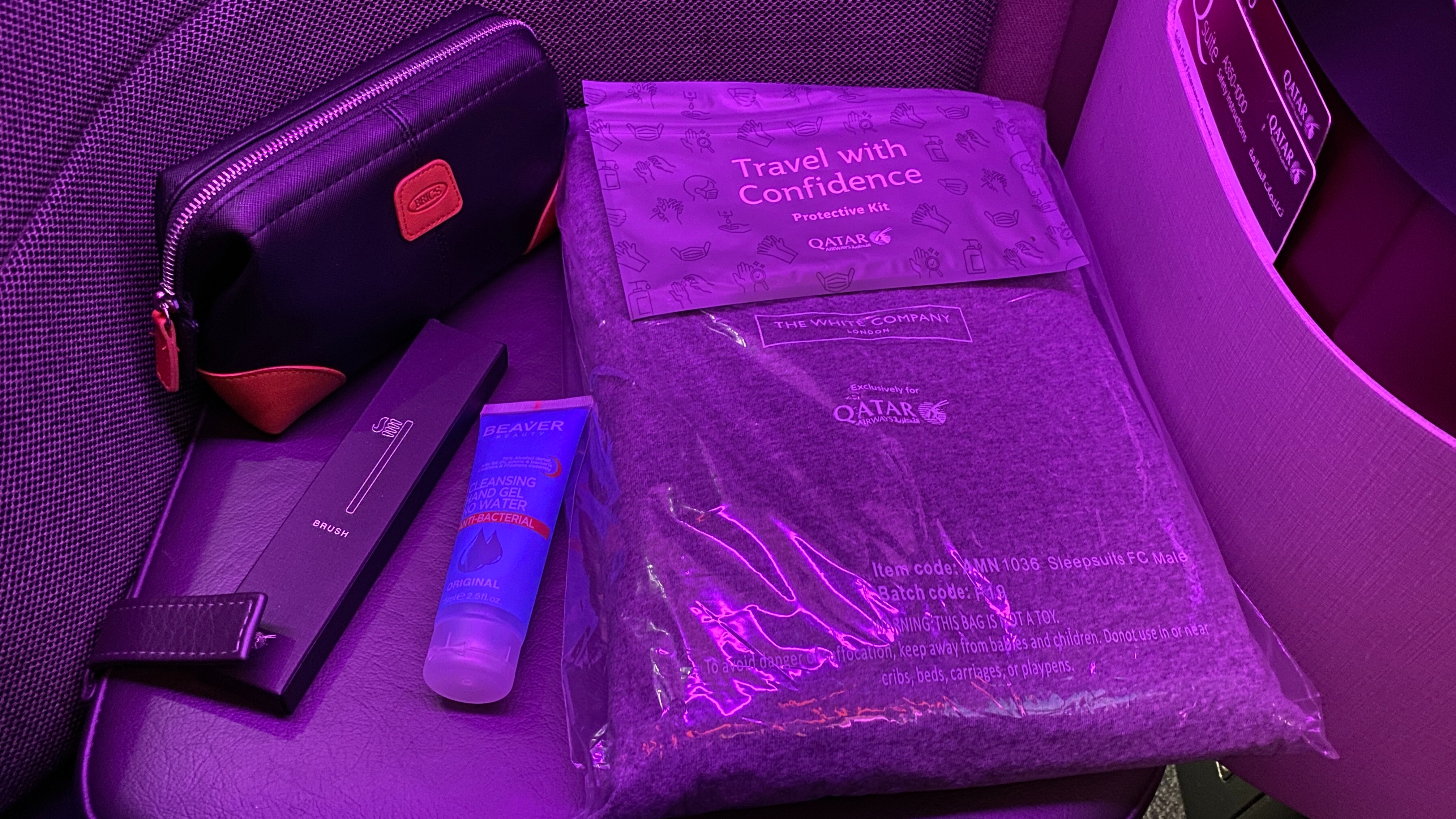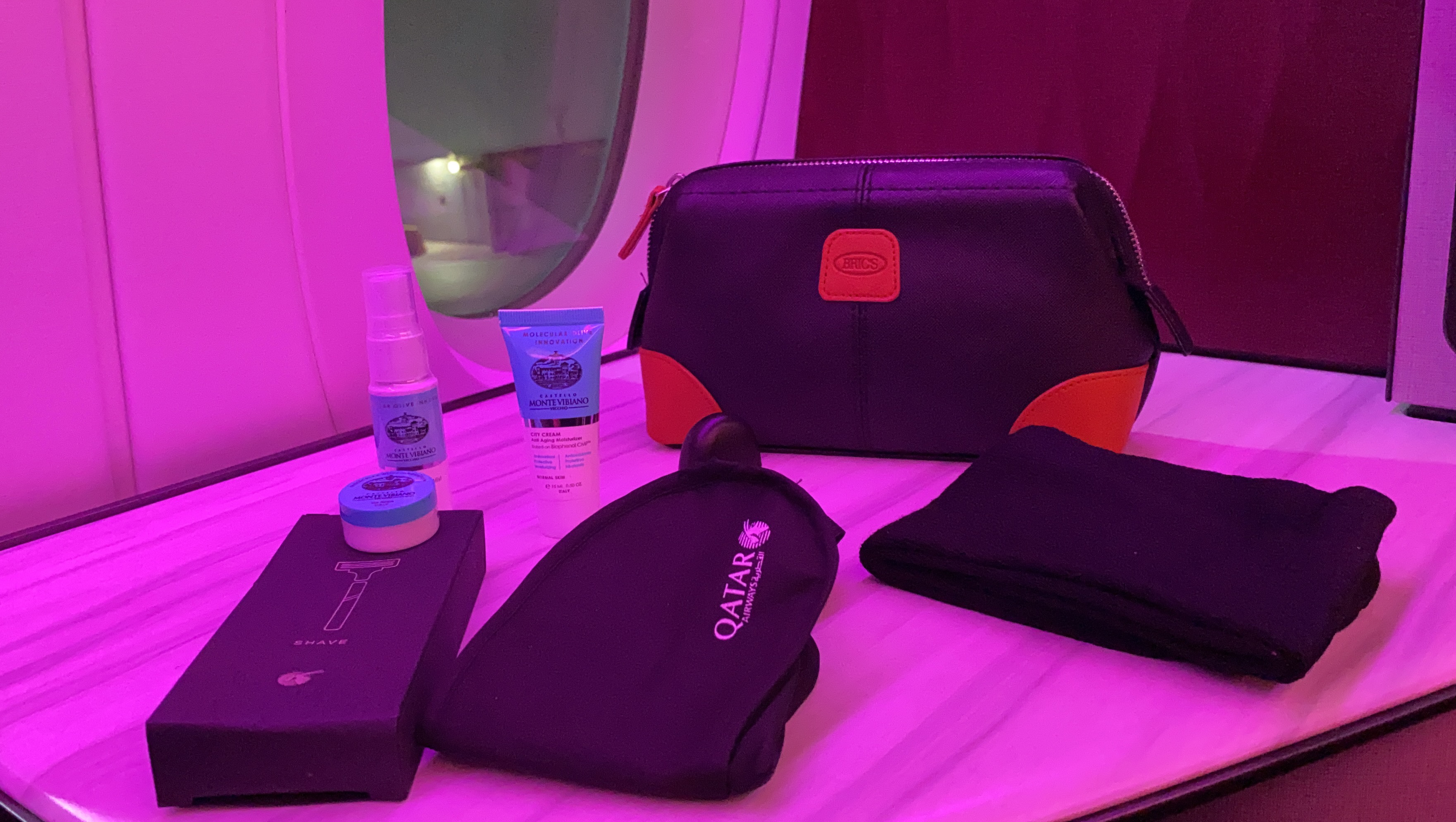 The amenities – Qatar offers excellent business class amenities. All passengers are offered a Bric’s amenity kit with Castello Monte Vibiano Vecchio toiletries, and pajamas by The White Company London. A bottled water, and noise canceling headphones are available at each seat. A full-size pillow, a thick and comfortable duvet, and mattress pad are fitted on the seat during turndown service. The lavatories are also very clean and fully stocked with Rituals toiletries.