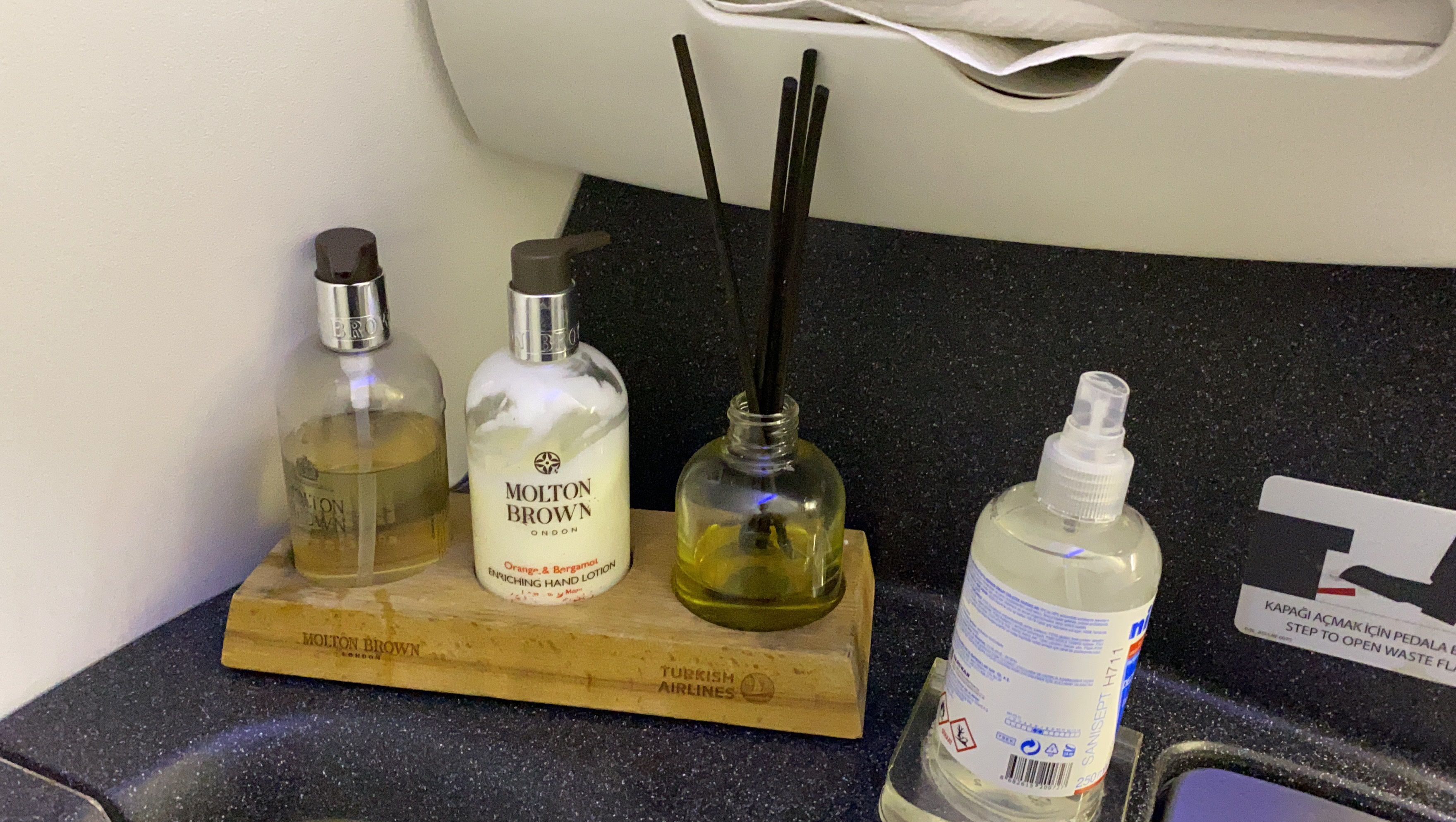 The amenities – Only the personal hygiene kit containing a mask and sanitizing wipes were provided. No pillows or blankets were offered either. Though I was happy to see that they had Toiletries in the lavatory.