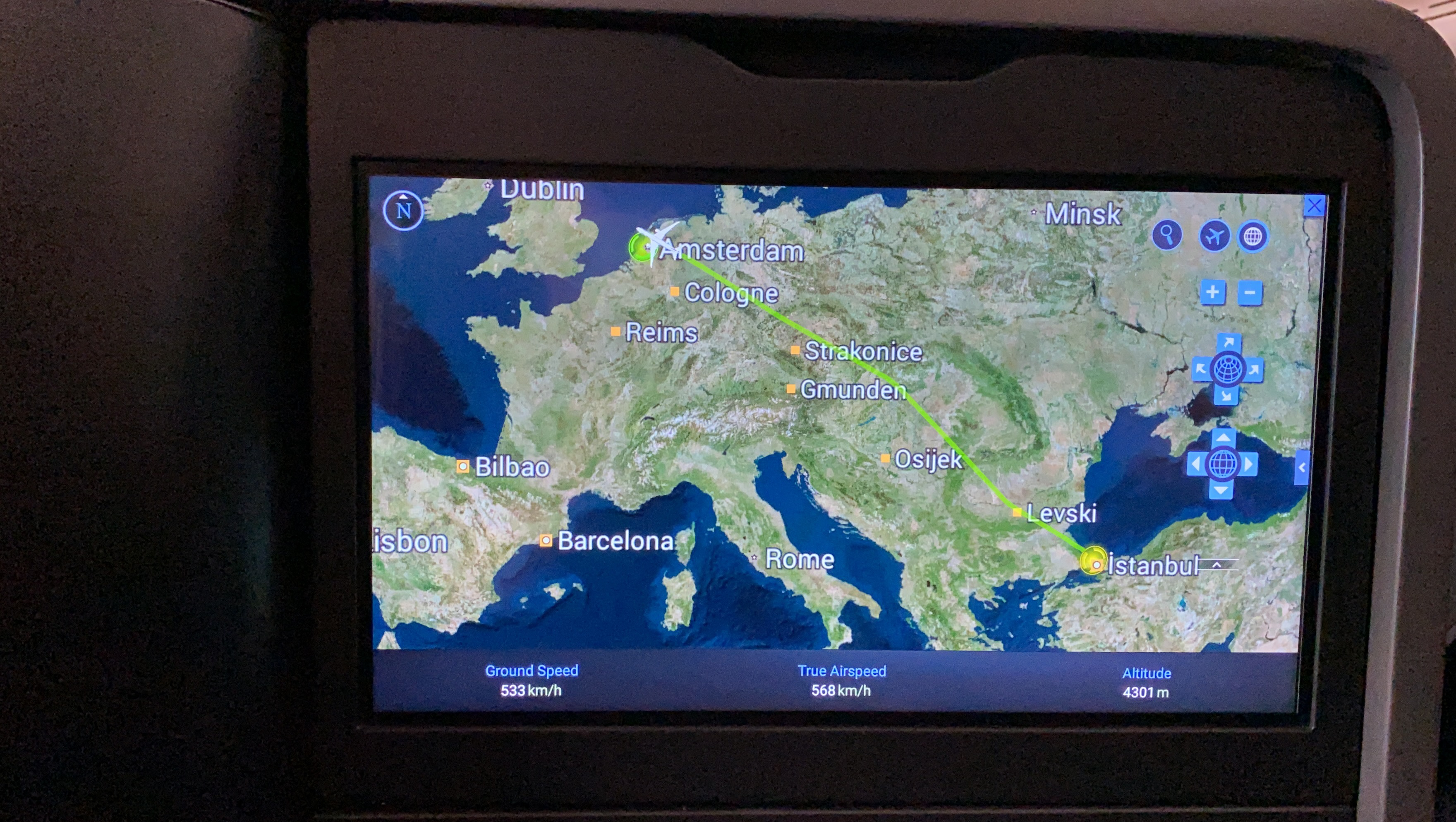 The IFE – Turkish offers a very good in-flight entertainment system. The interface is easy to use and is responsive. There was also plenty of media content and my favorite Voyager moving map app to keep me occupied during the 3-ish hour flight to Amsterdam. They also offer live TV broadcasts and 2 outside camera feeds (not as good as the one on the A350).