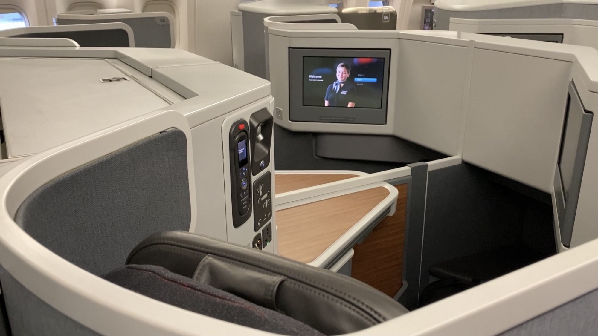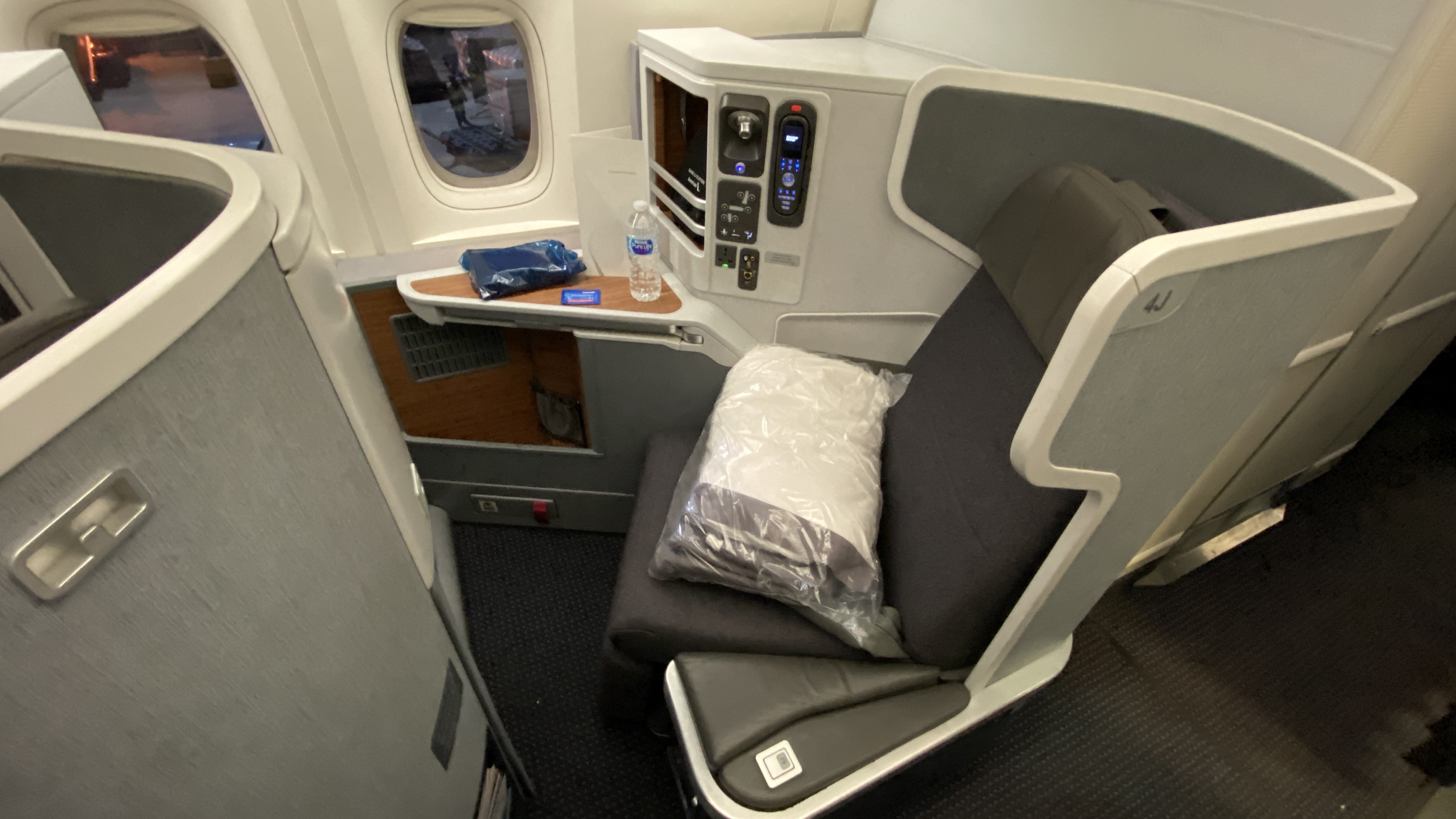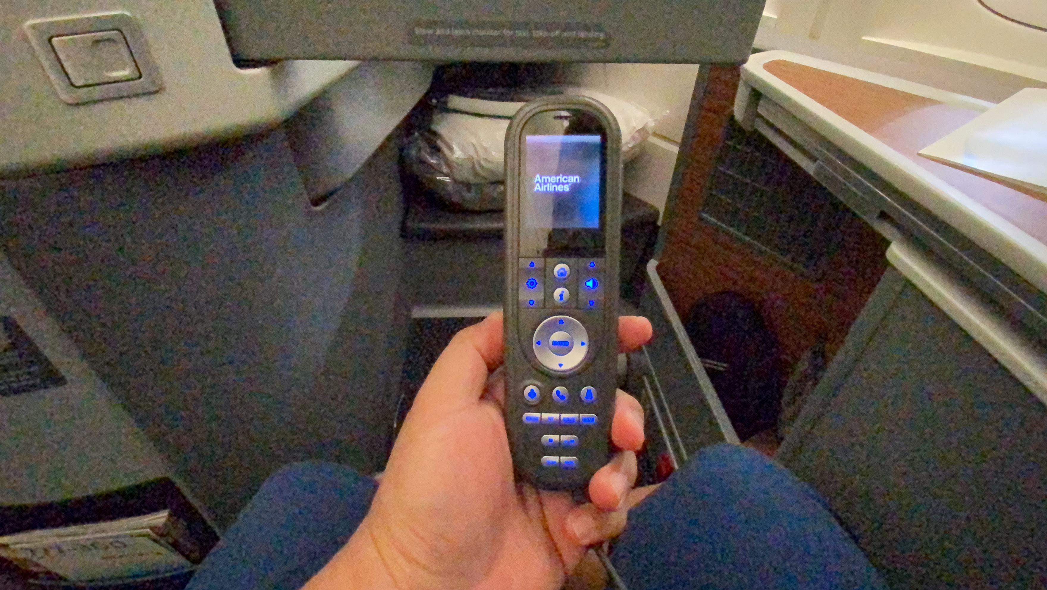 The seats – I really like American’s Safran Cirrus seat. While not fully enclosed and private the seat is spacious and intuitively laid out. It was comfortable for lounging, dining upright. For sleeping, I like that my there’s nothing above my knees to hit when rolling over to my side. And yes, there are also personal air nozzles on this aircraft to keep me cool. –Score!
