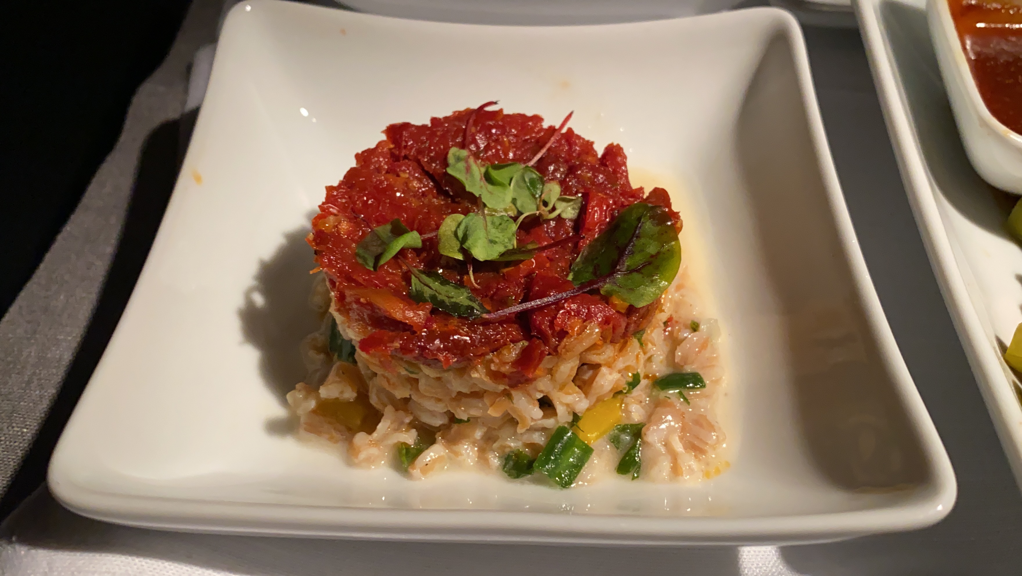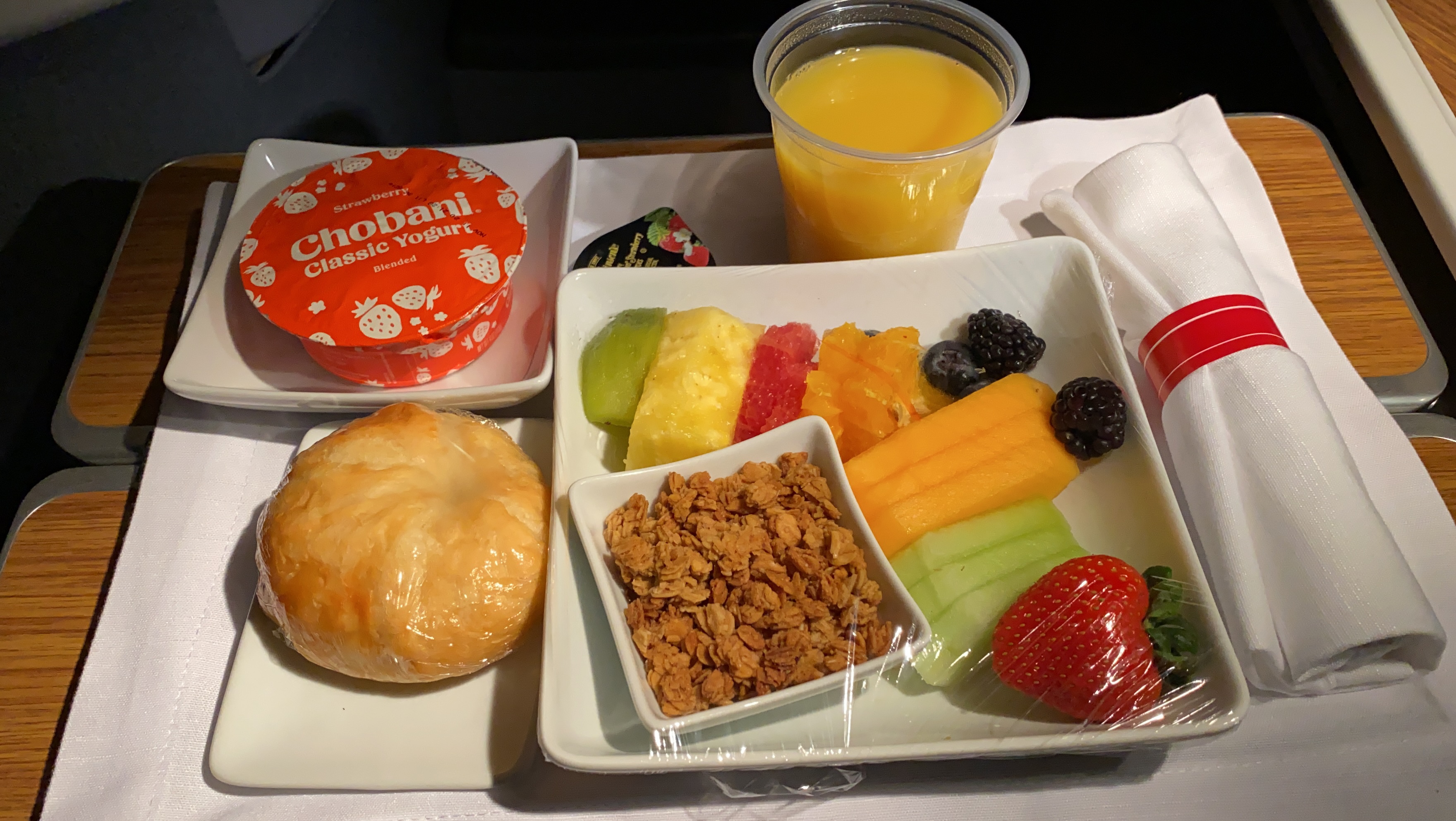 The food – The catering on this flight was surprisingly very good. The starter dish tasted light and tasty. The mains we ordered were perfectly cooked, well-seasoned, and not dried out, and the fruit bowl during the pre-arrival meal was quite fresh. Good Job, AA!