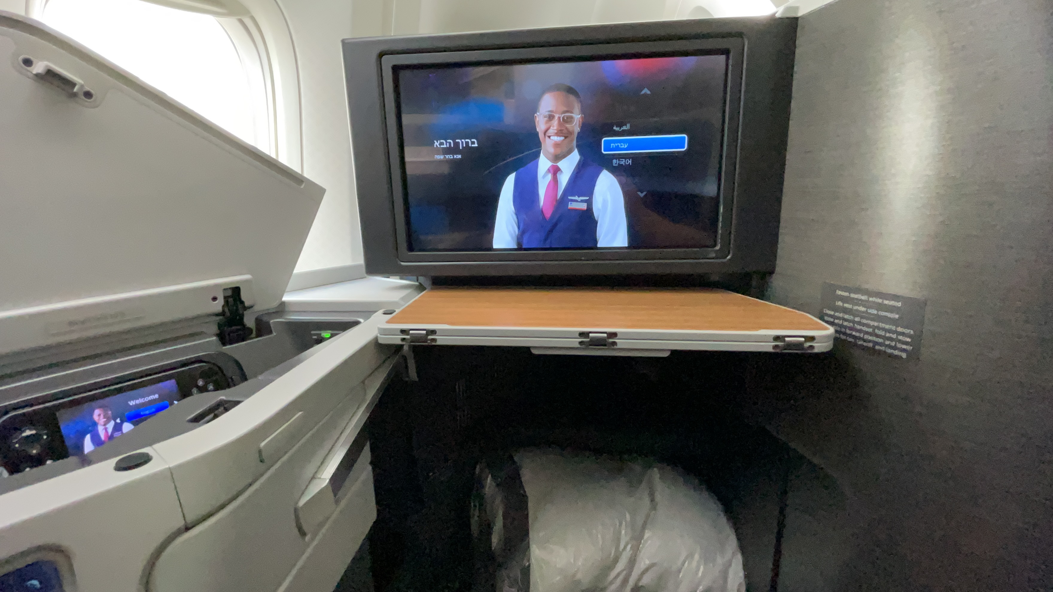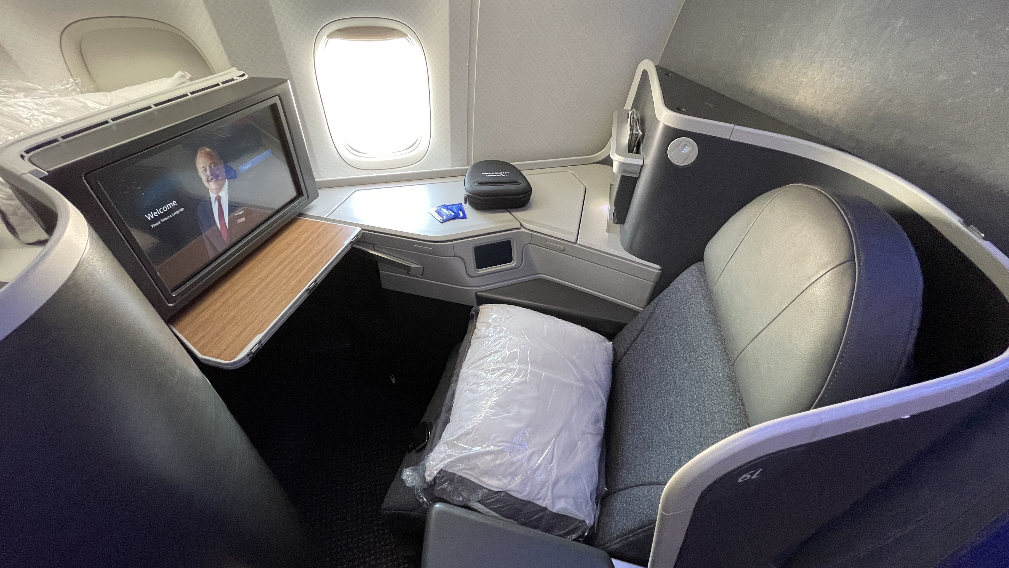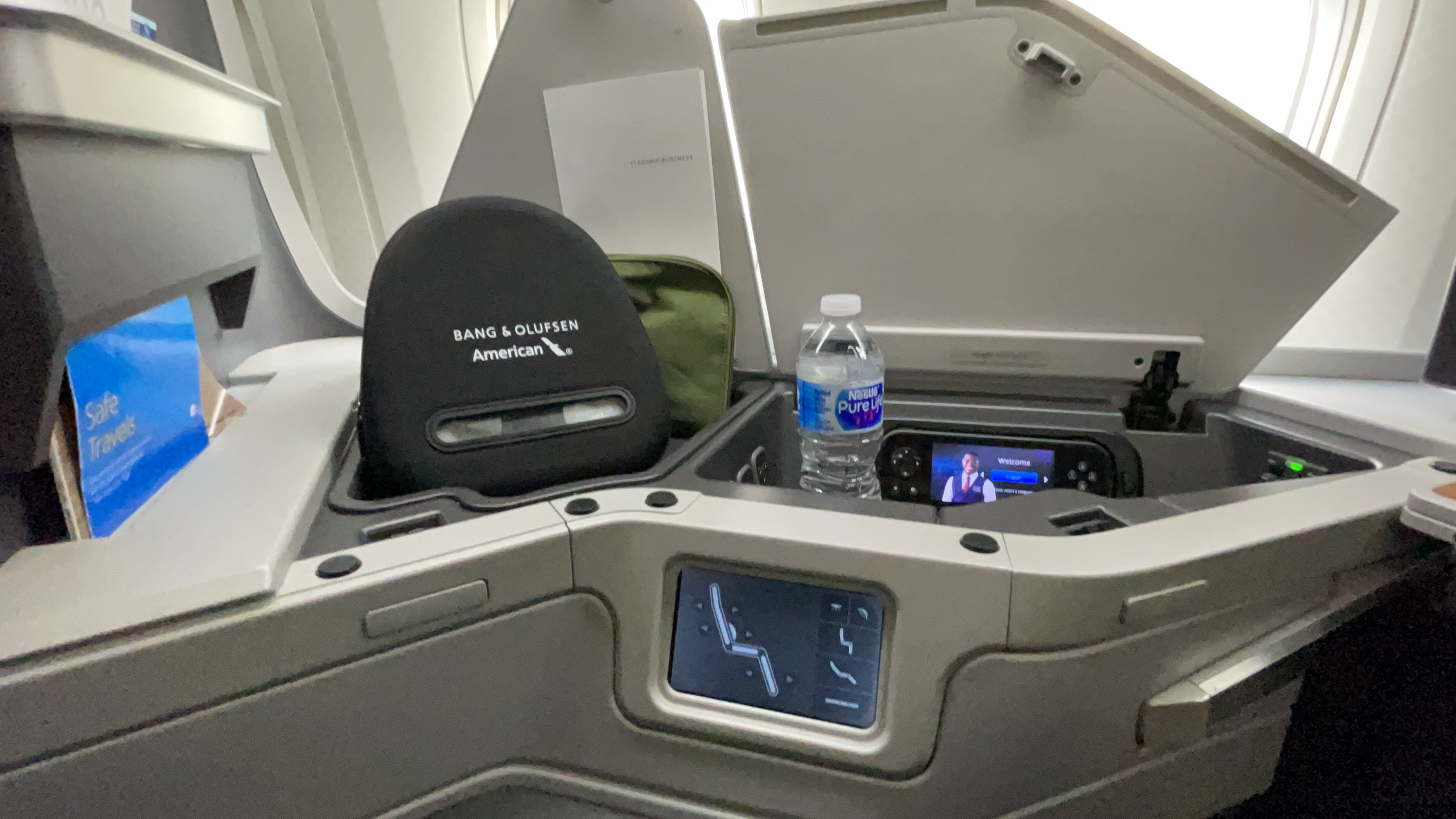 The Amenities – AA offers a business class amenity kit, Bang and Olufsen noise canceling headphones (collected 45 minutes before landing), bottled water, and a full-size pillow and duvet set. I typically like American’s Business Class Amenity kit, but I’m not too fond of this new Shinola kit. I thought the amenity bag is cheaply made and nothing compared to previous kits.
