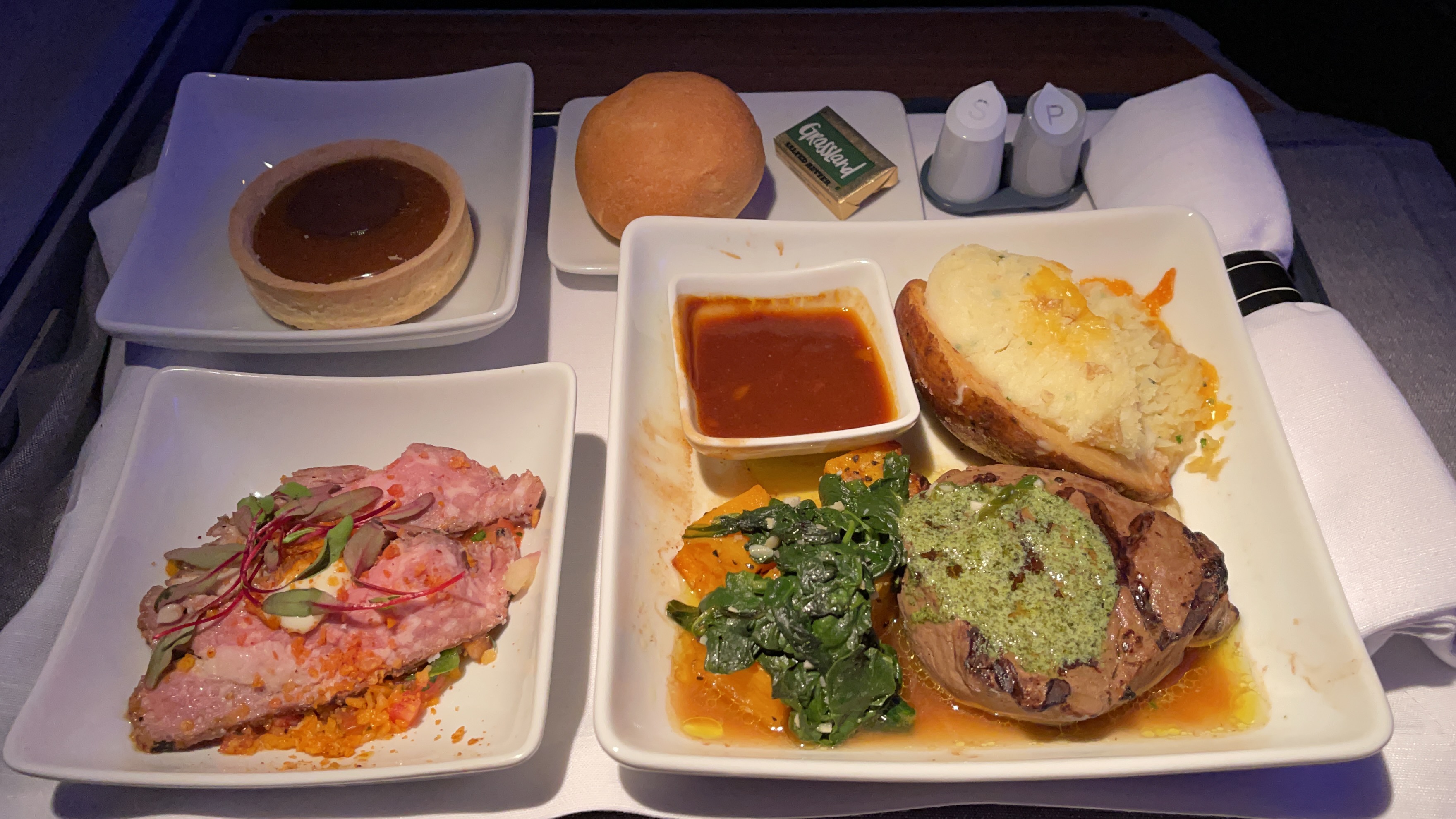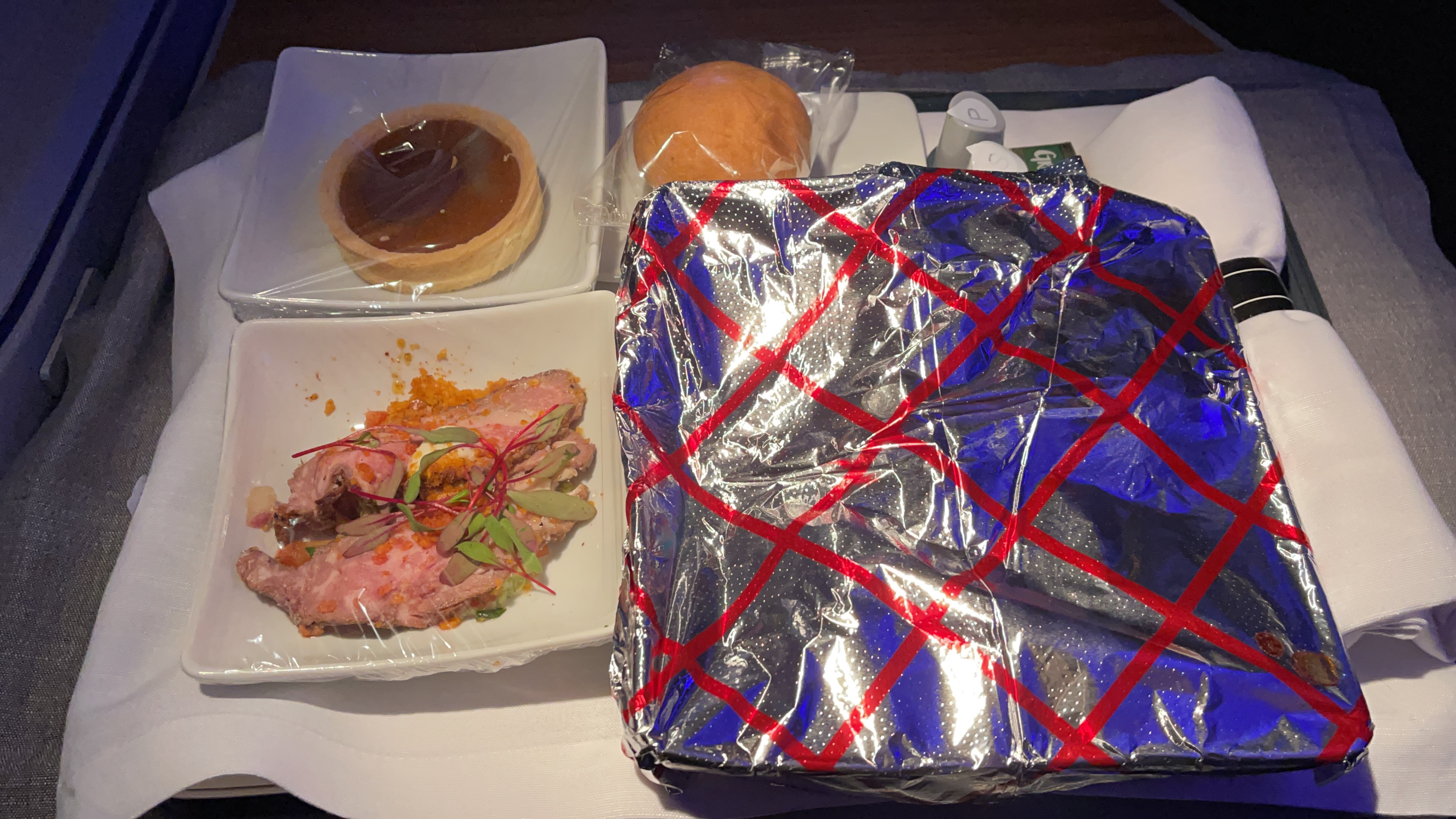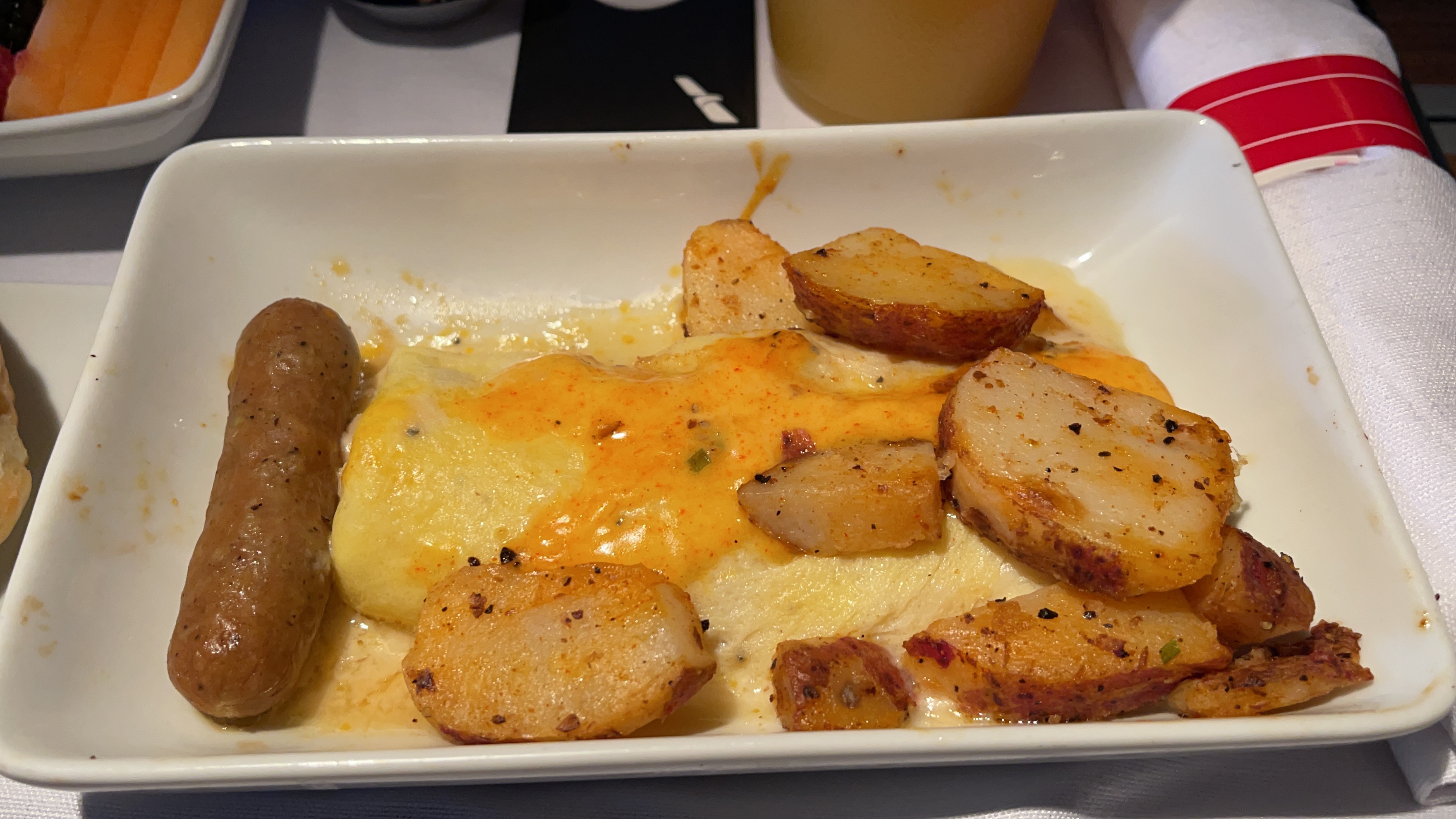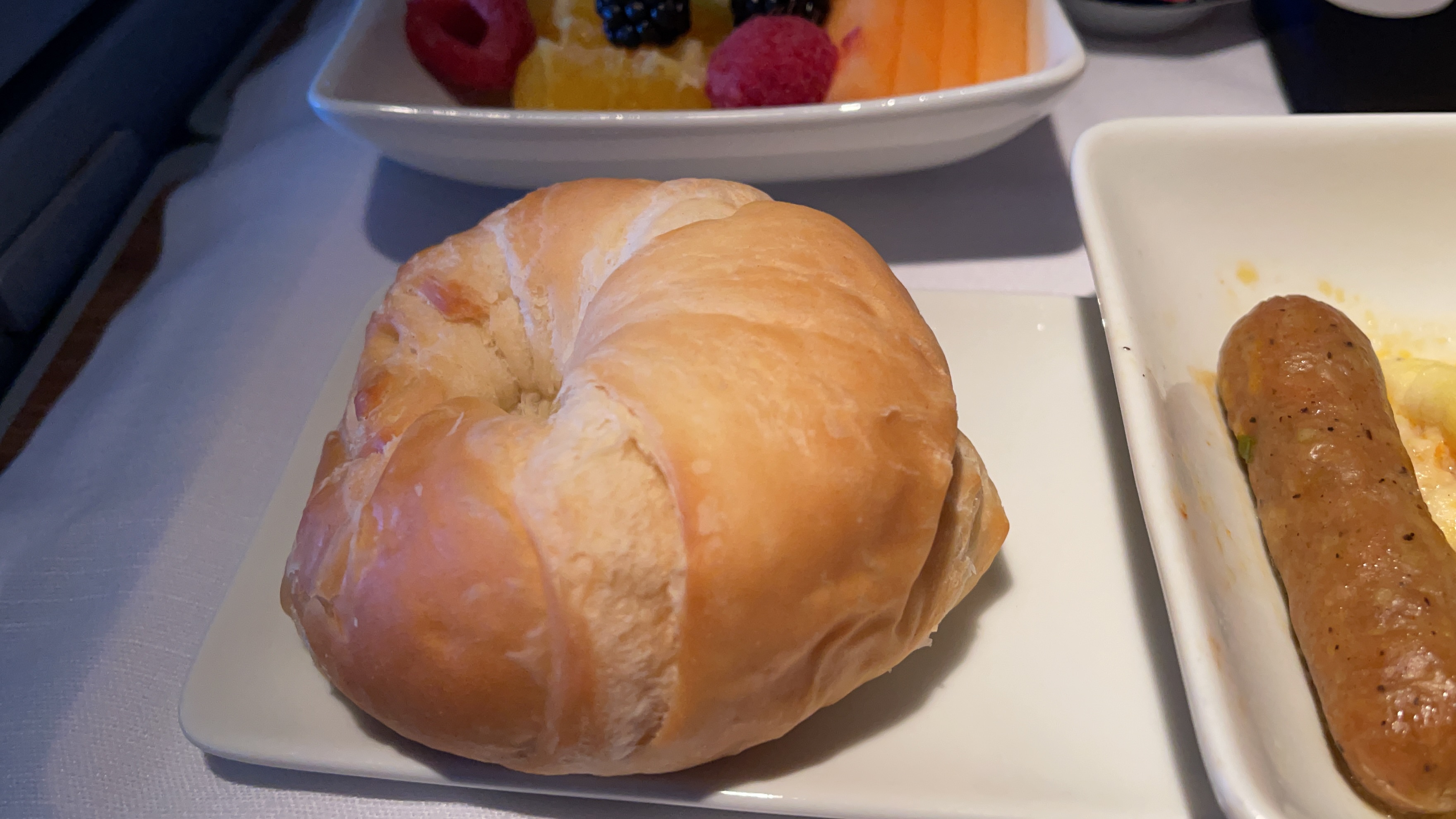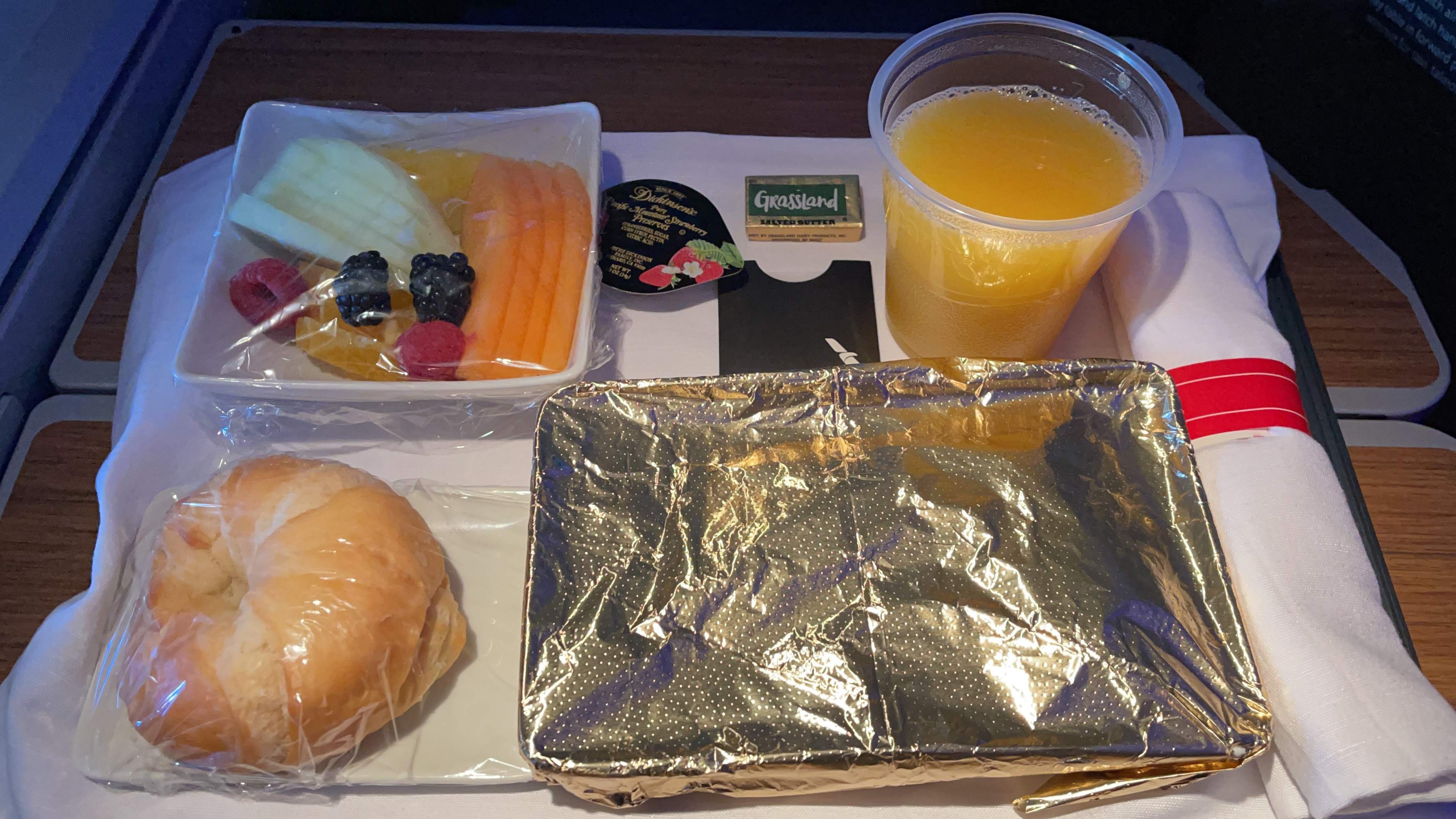 The Food – The catering on this flight was OK. The steak I pre-ordered tasted pretty good and cooked to a nice medium. The breakfast choice was either a hot or cold dish, and I chose the hot which was your typical scrambled eggs. It was meh…
