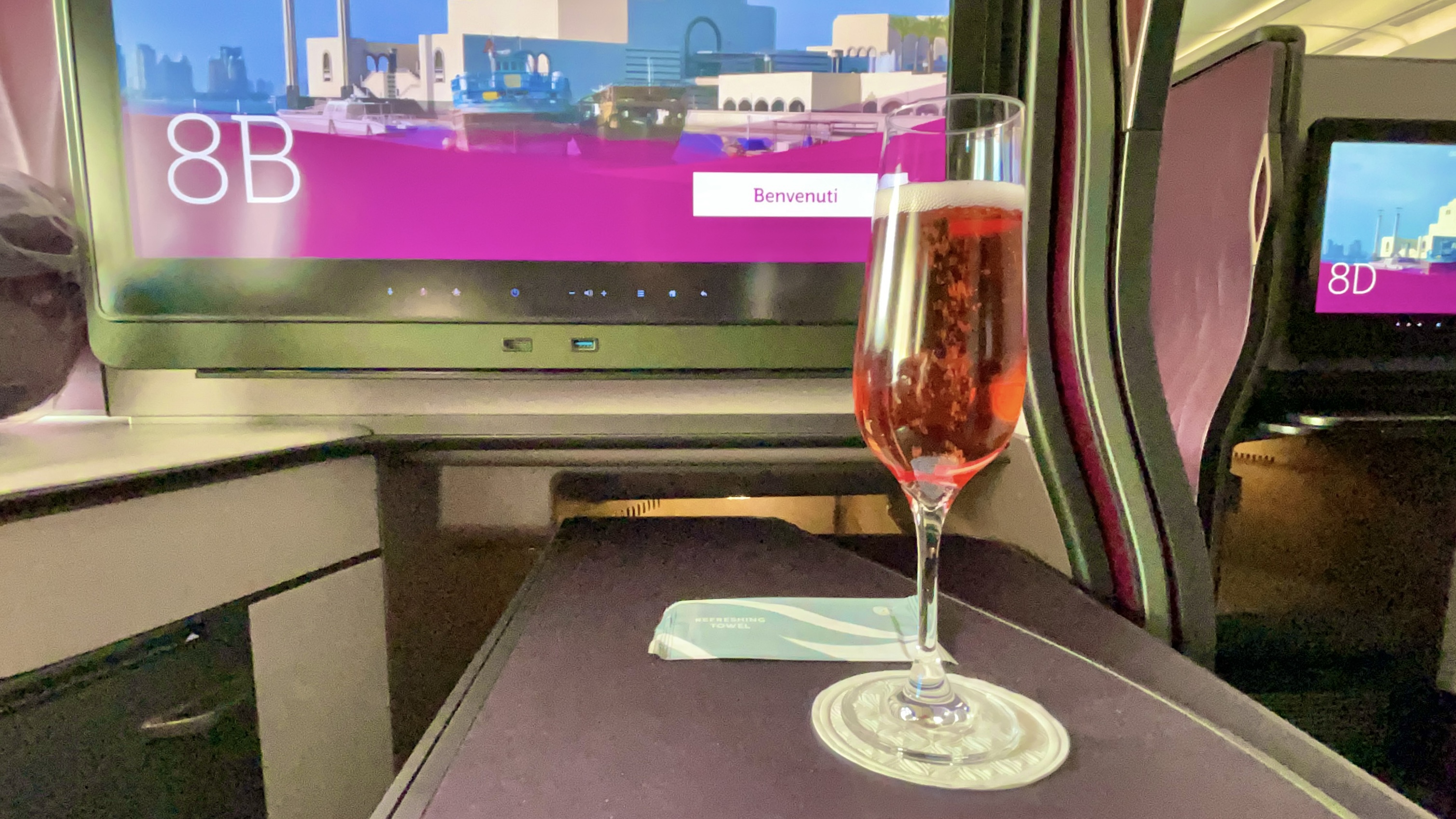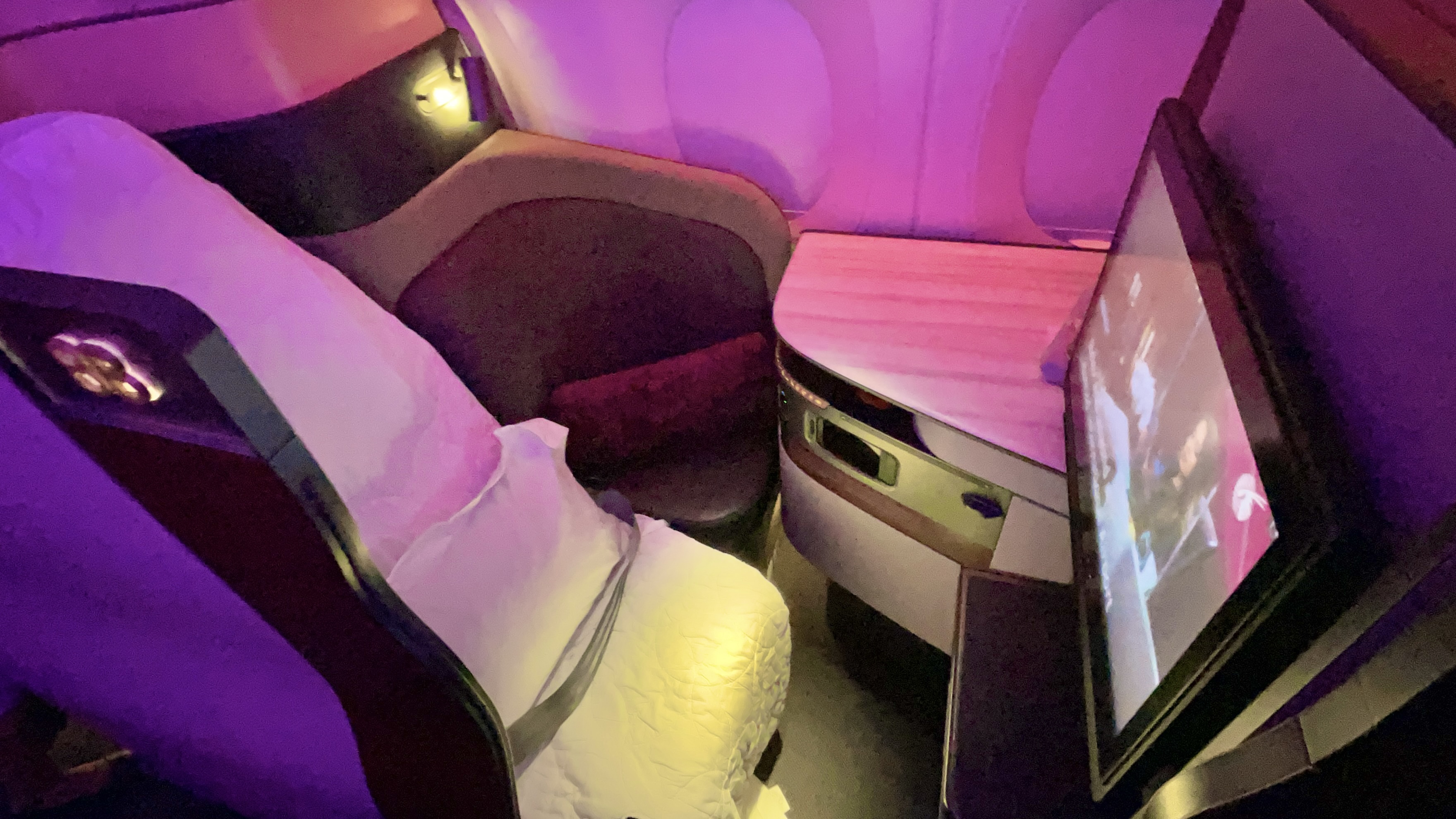 The seats – I really like Qatar’s QSuite product and I think it’s the best business class product available to date. The seat is private, yet spacious and intuitively laid out. It was comfortable for sitting and dining upright. The seat also reclines and converts into a fully flat bed. And yes, there are also personal air nozzles on this aircraft! –Score!