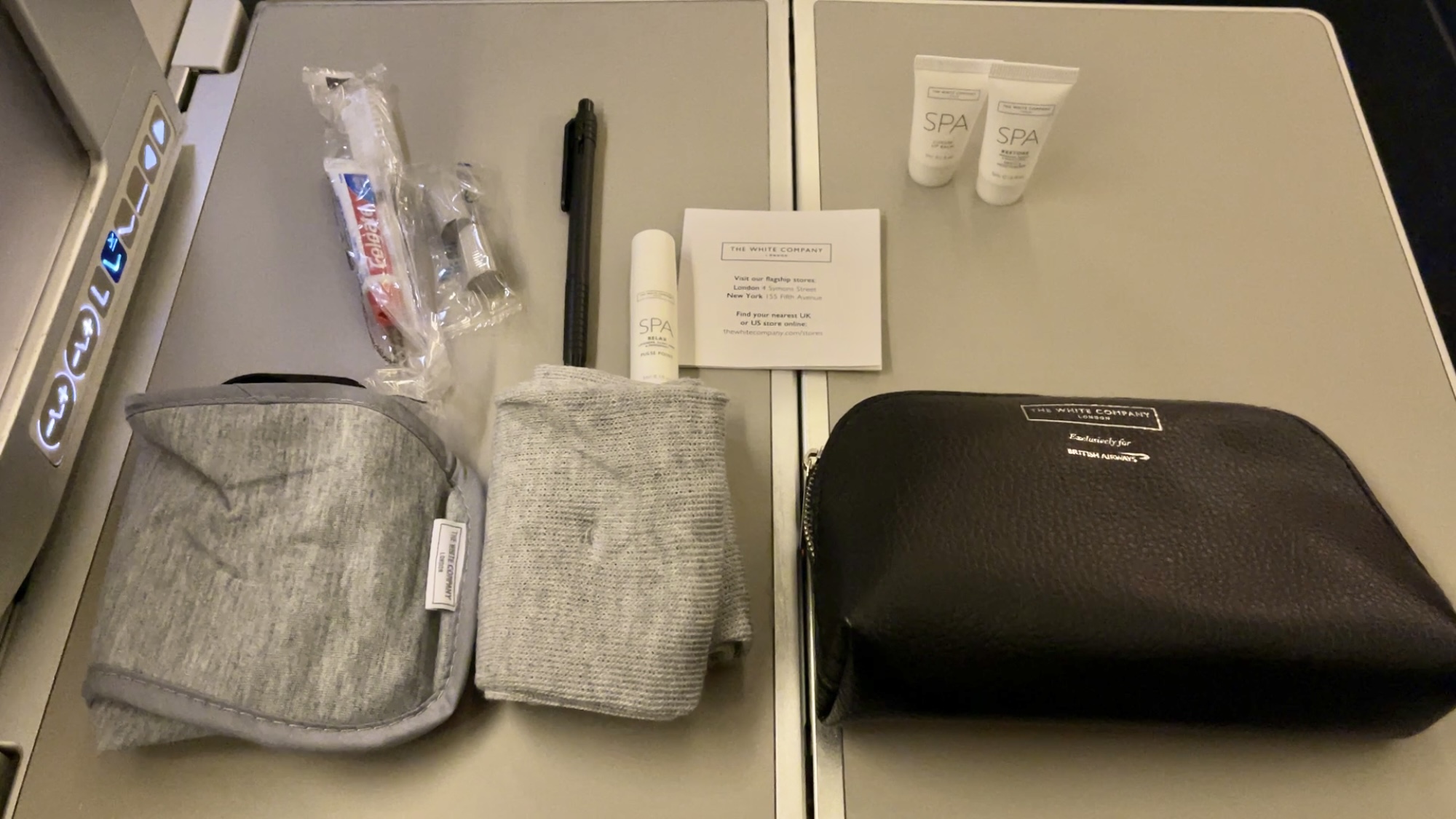 The Amenities – BA does not offer business class passengers pajamas or slippers in business class, but I liked the black mini leather pouch by The White Company London. The bedding was also very good and included a mattress pad for when you make your bed. The lavatories were also clean and nicely stocked with toiletries.