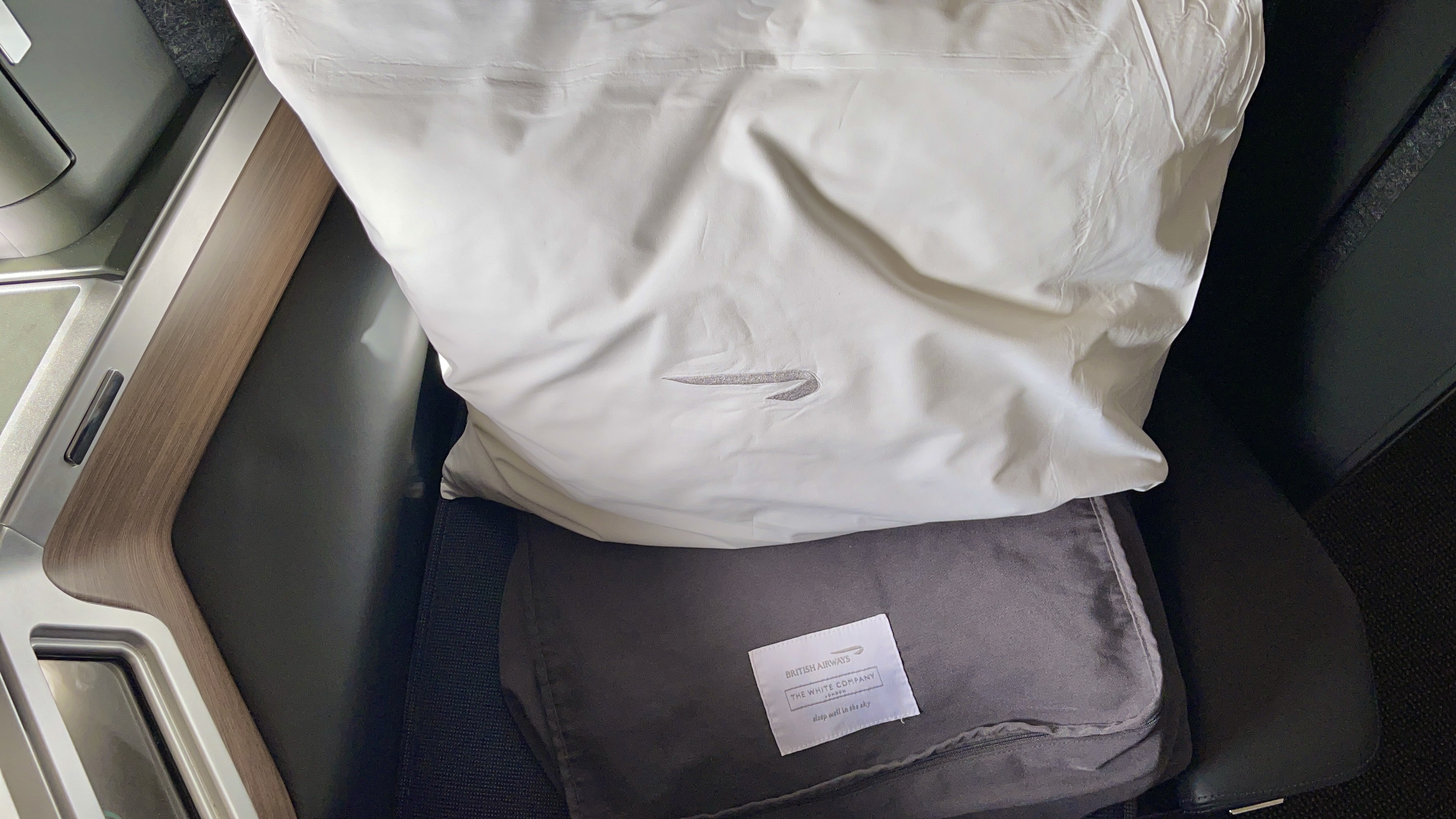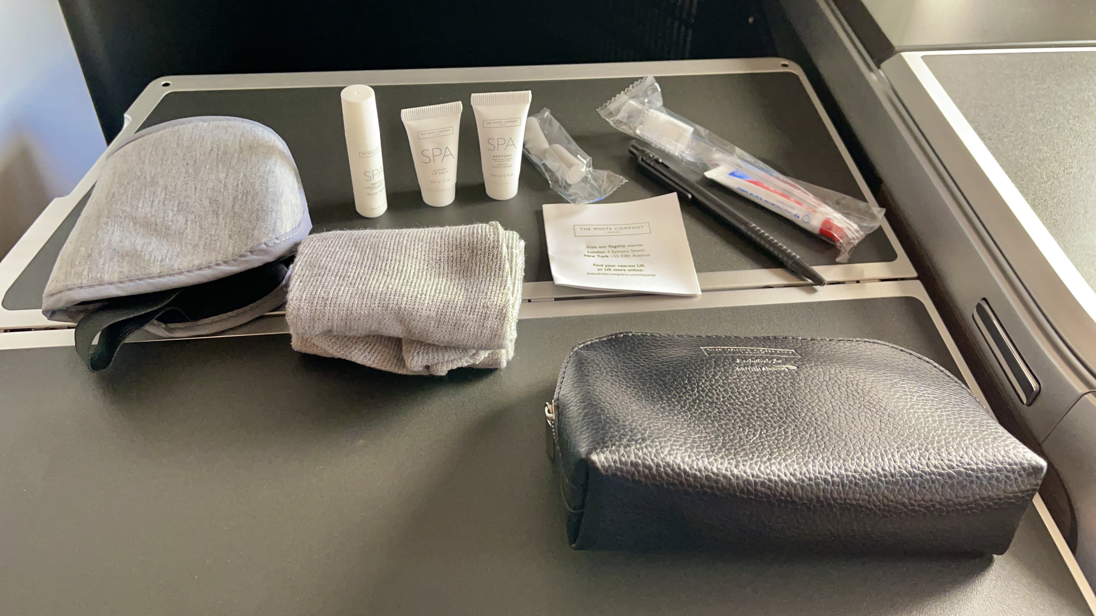 The Amenities – BA does not offer business class passengers pajamas or slippers in business class, but I liked the black mini leather pouch by The White Company London. The bedding was also very good and included a mattress pad for when you make your bed. The lavatories were also clean and nicely stocked with toiletries.