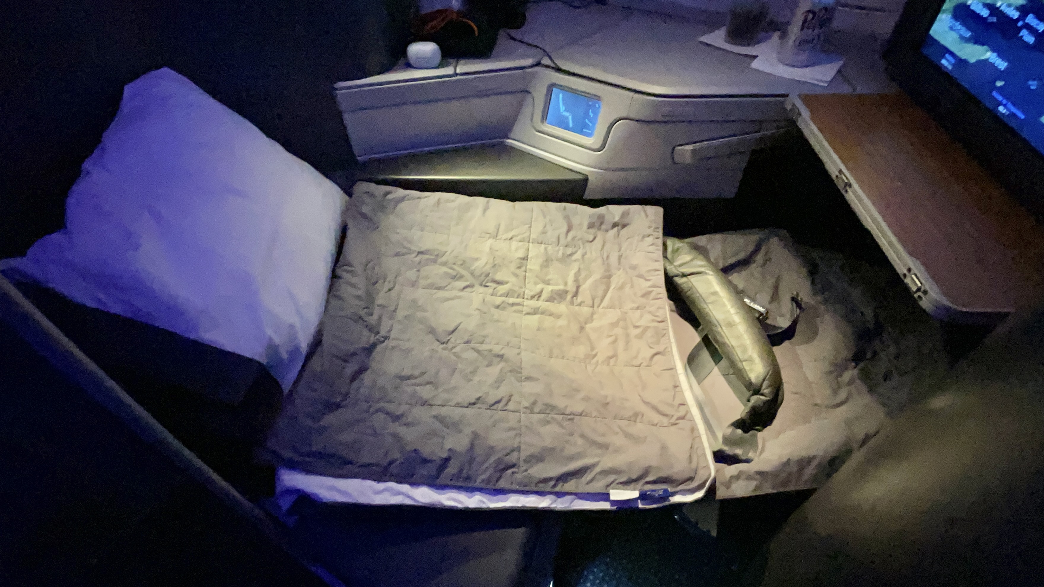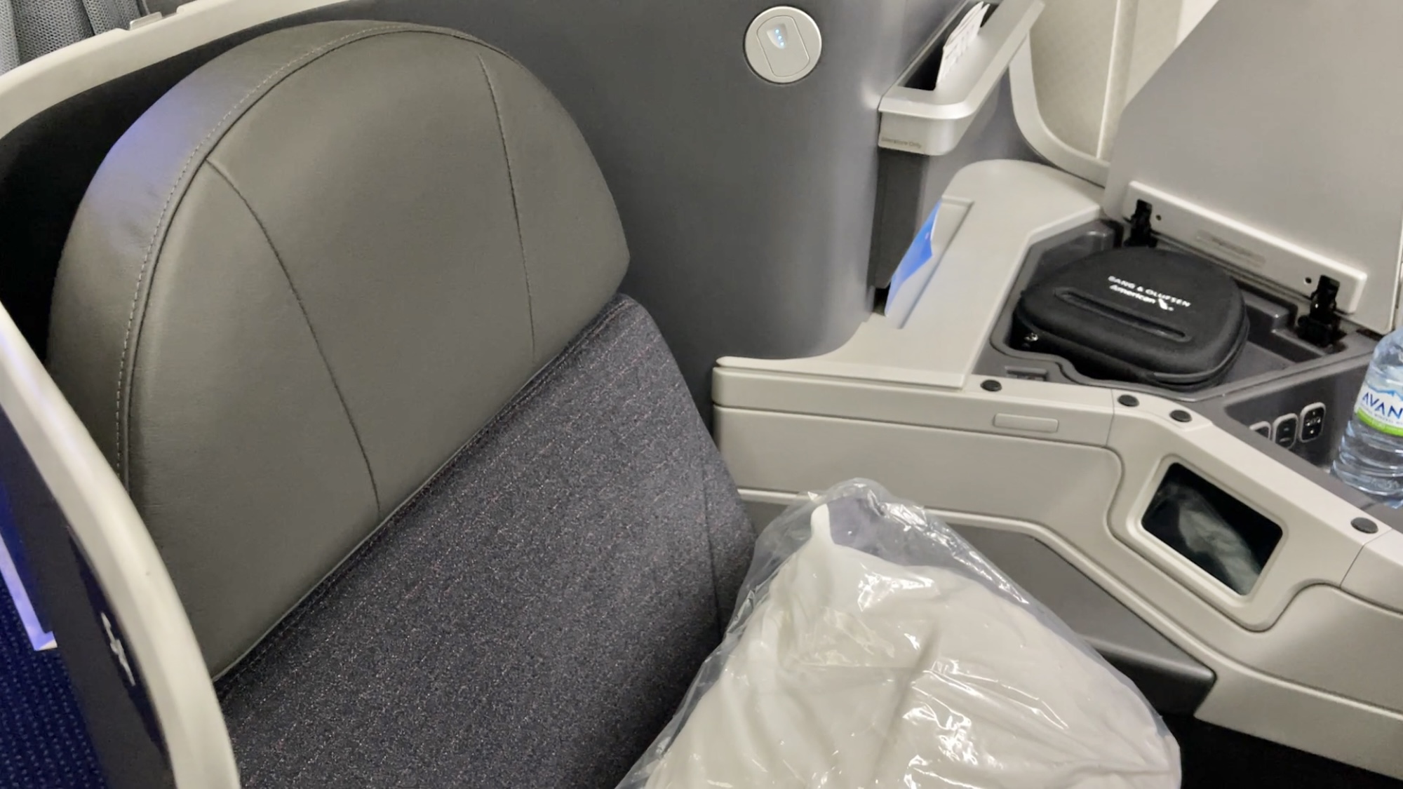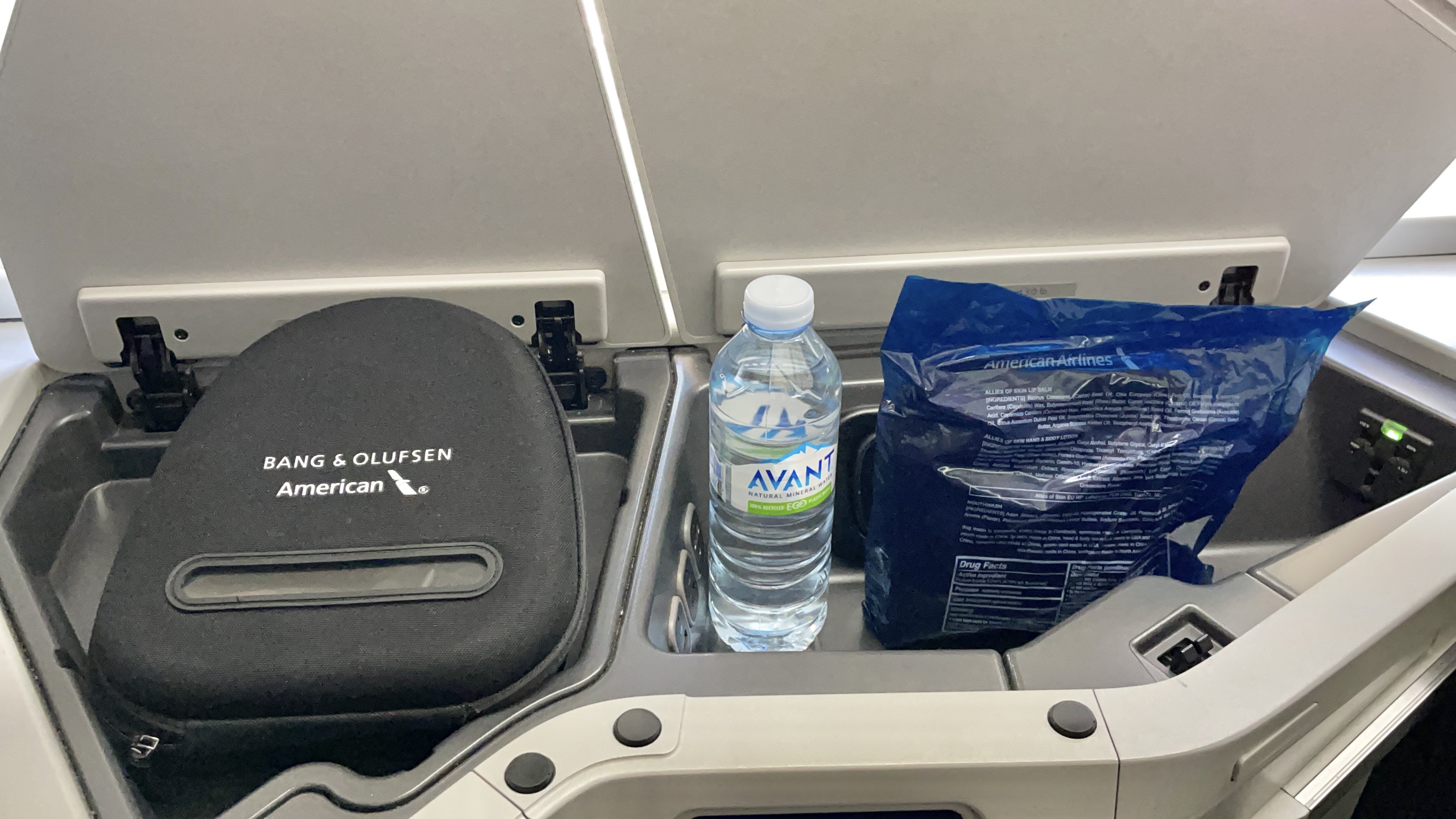 The Amenities – AA offers a business class amenity kit, Bang and Olufsen noise canceling headphones (collected 45 minutes before landing), a business class amenity kit, bottled water, and a full-size pillow and duvet set. No slippers or pajamas on AA though…