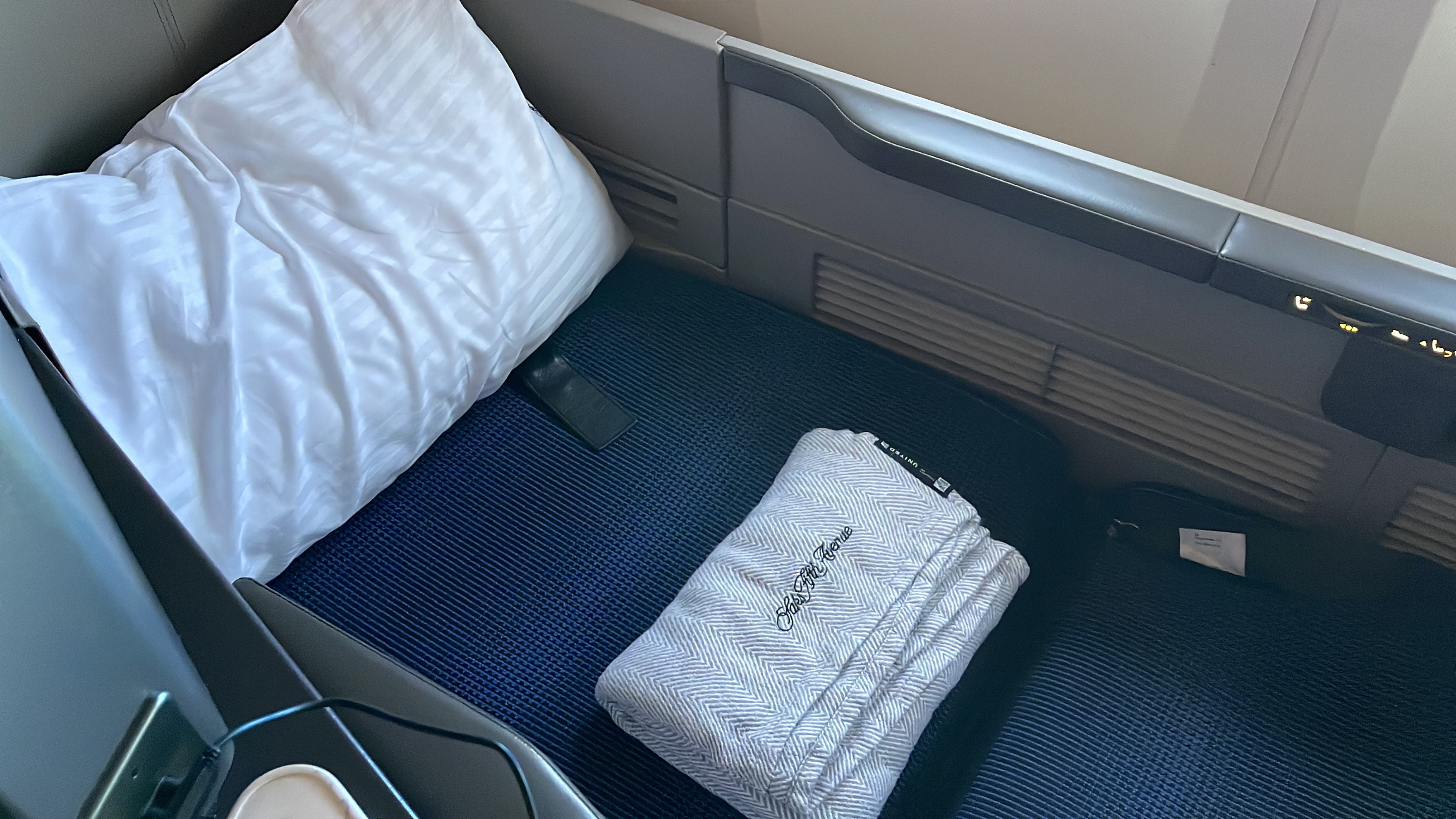 Watered-down Amenities – Although this flight offered the new Polaris seats, sadly the amenities were somewhat lacking. No menus were given to First Class passengers. The amenity kit given to us was as basic as can be, and the Polaris duvet was missing. Although I was glad to see that noise-canceling headphones were available.
