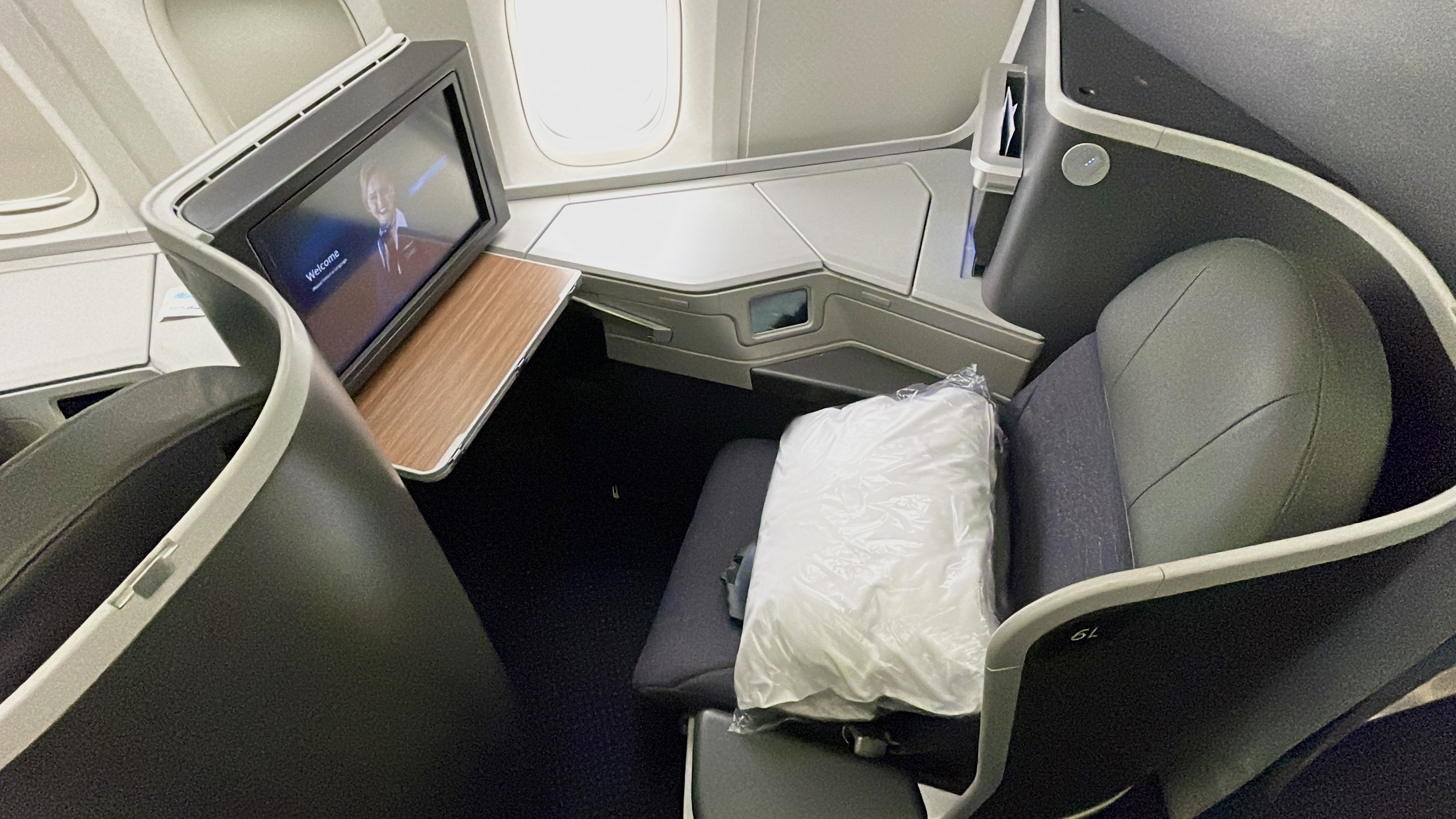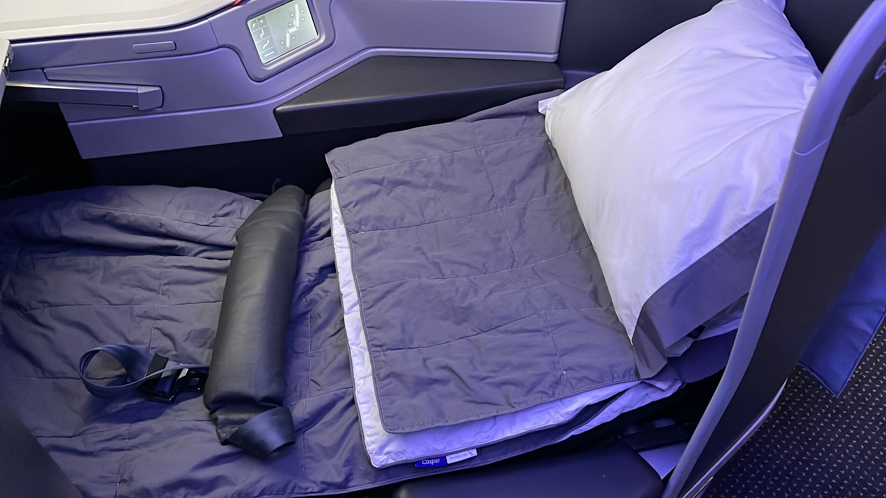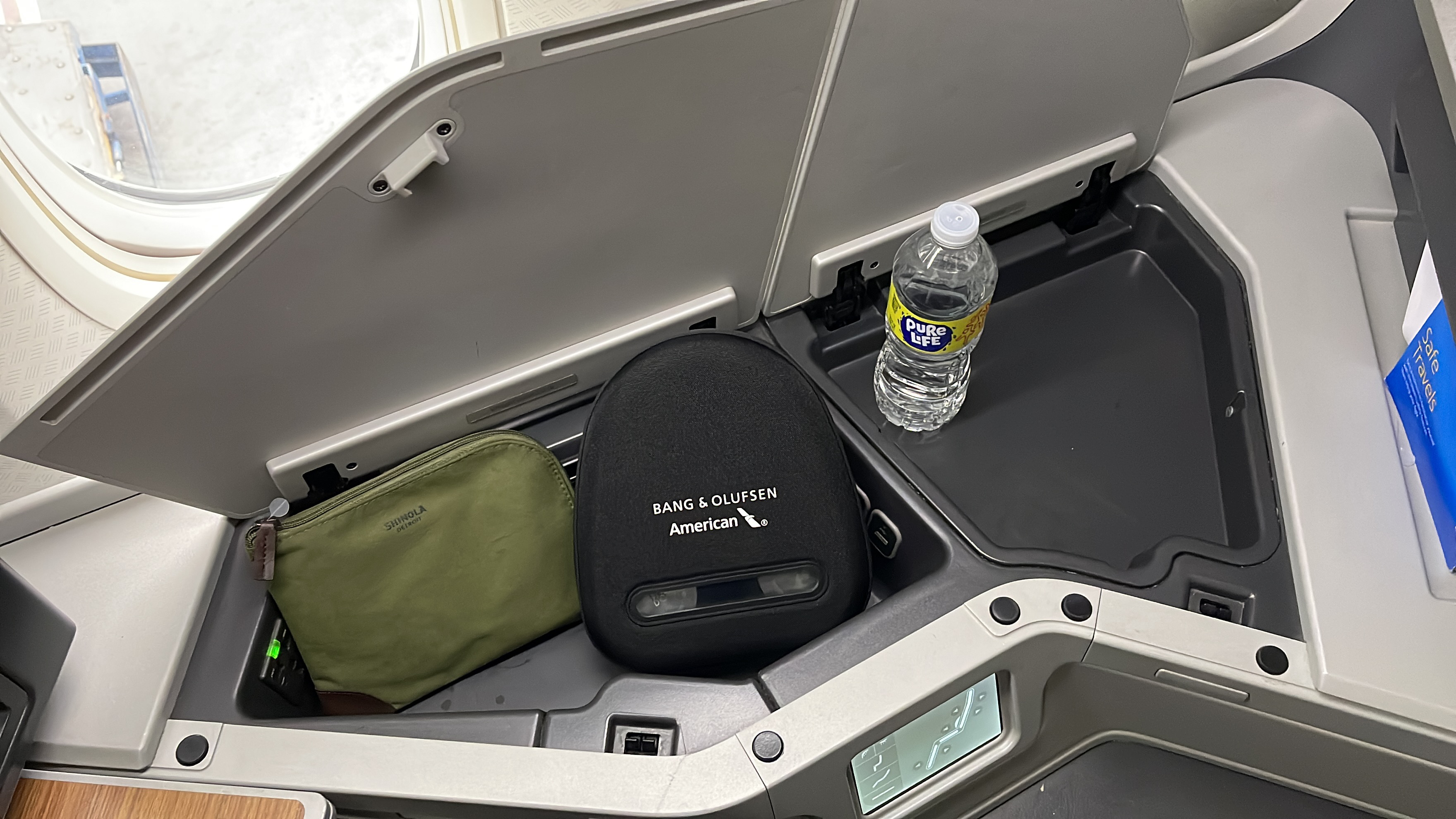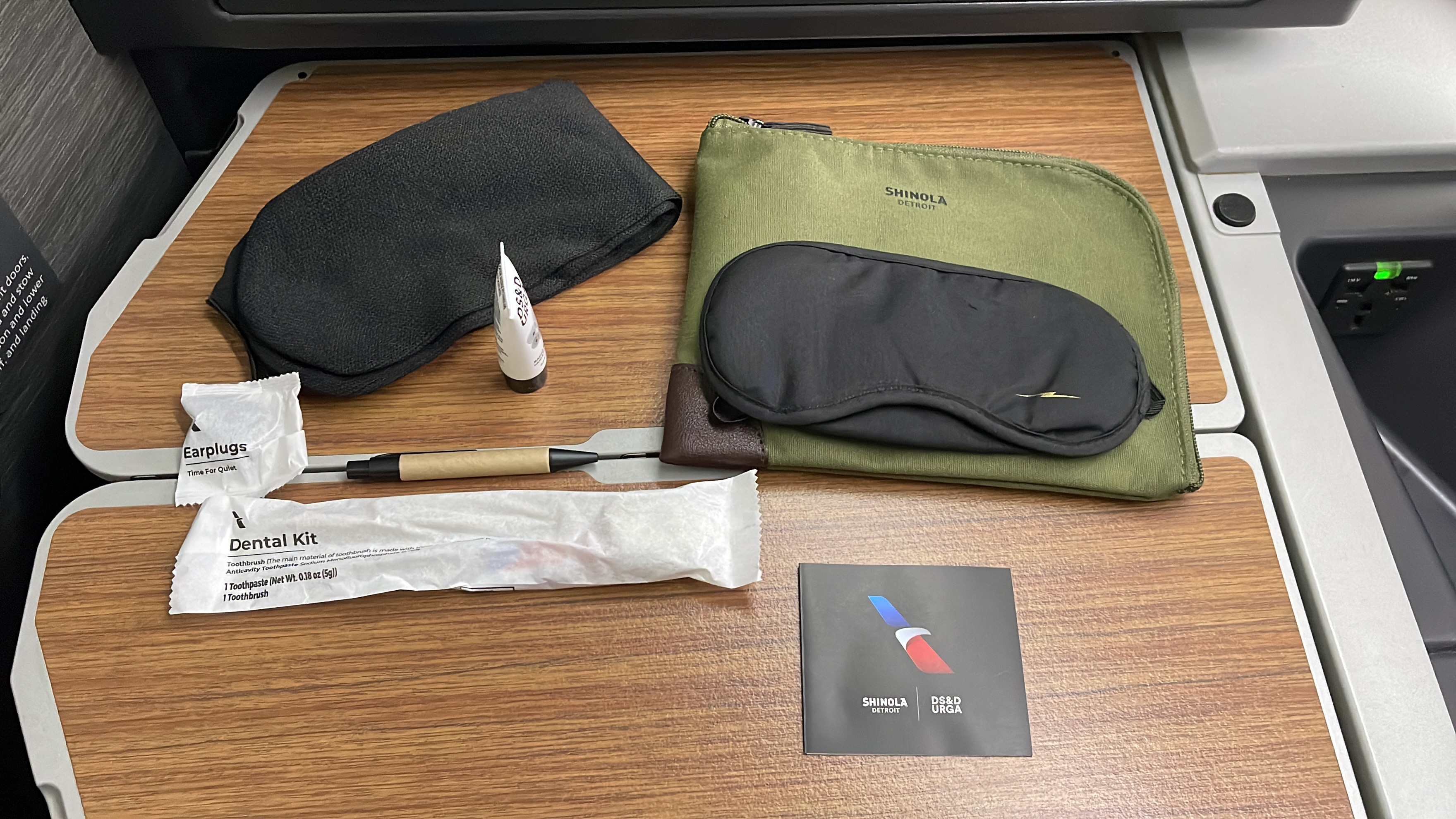 The Amenities – AA offers a Shinola business class amenity kit, which I am not a fan of compared to their previous kits. Bang and Olufsen noise canceling headphones (collected 45 minutes before landing), bottled water, and a full-size pillow and duvet set were also provided. No slippers or pajamas on this route though…