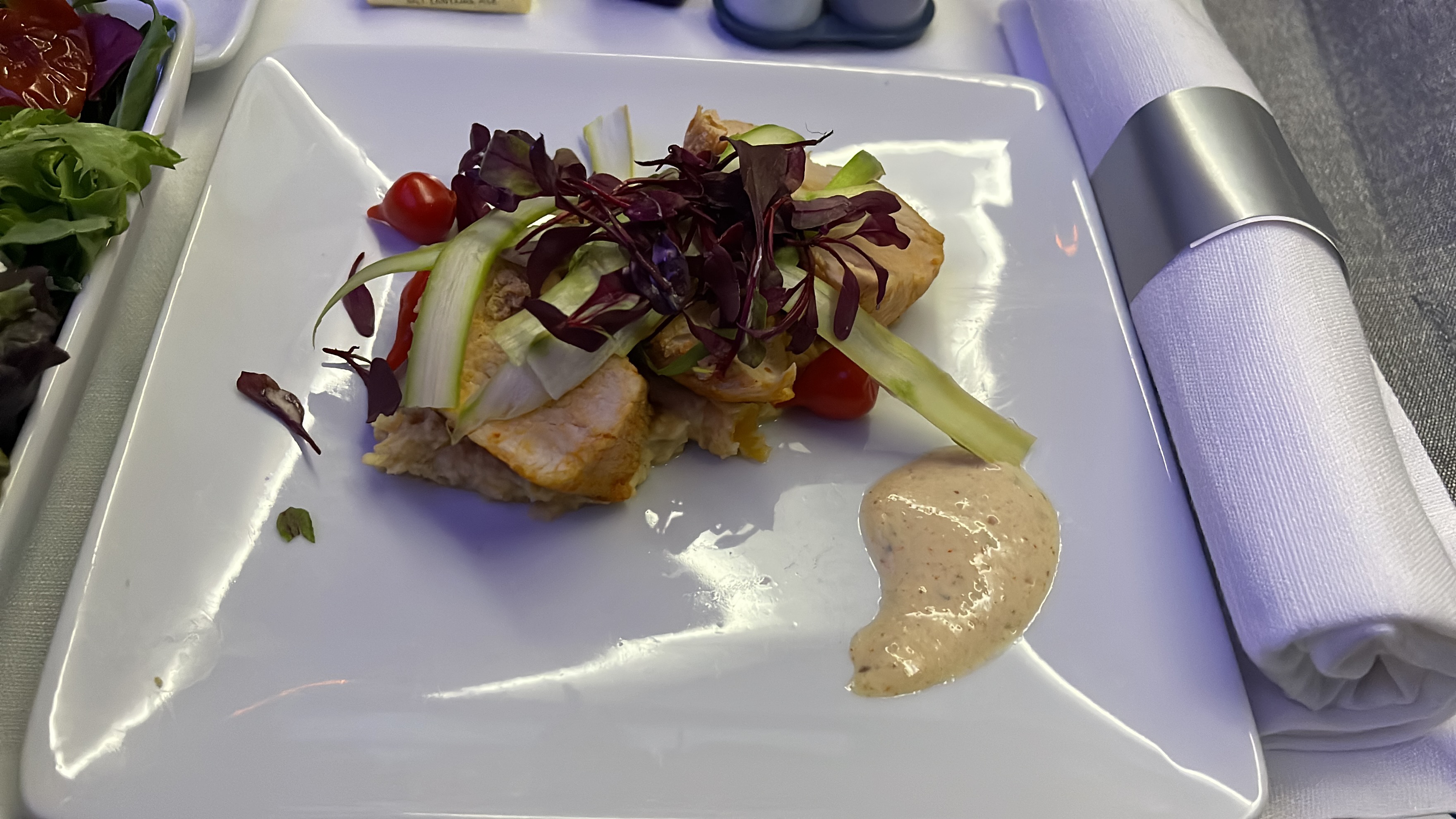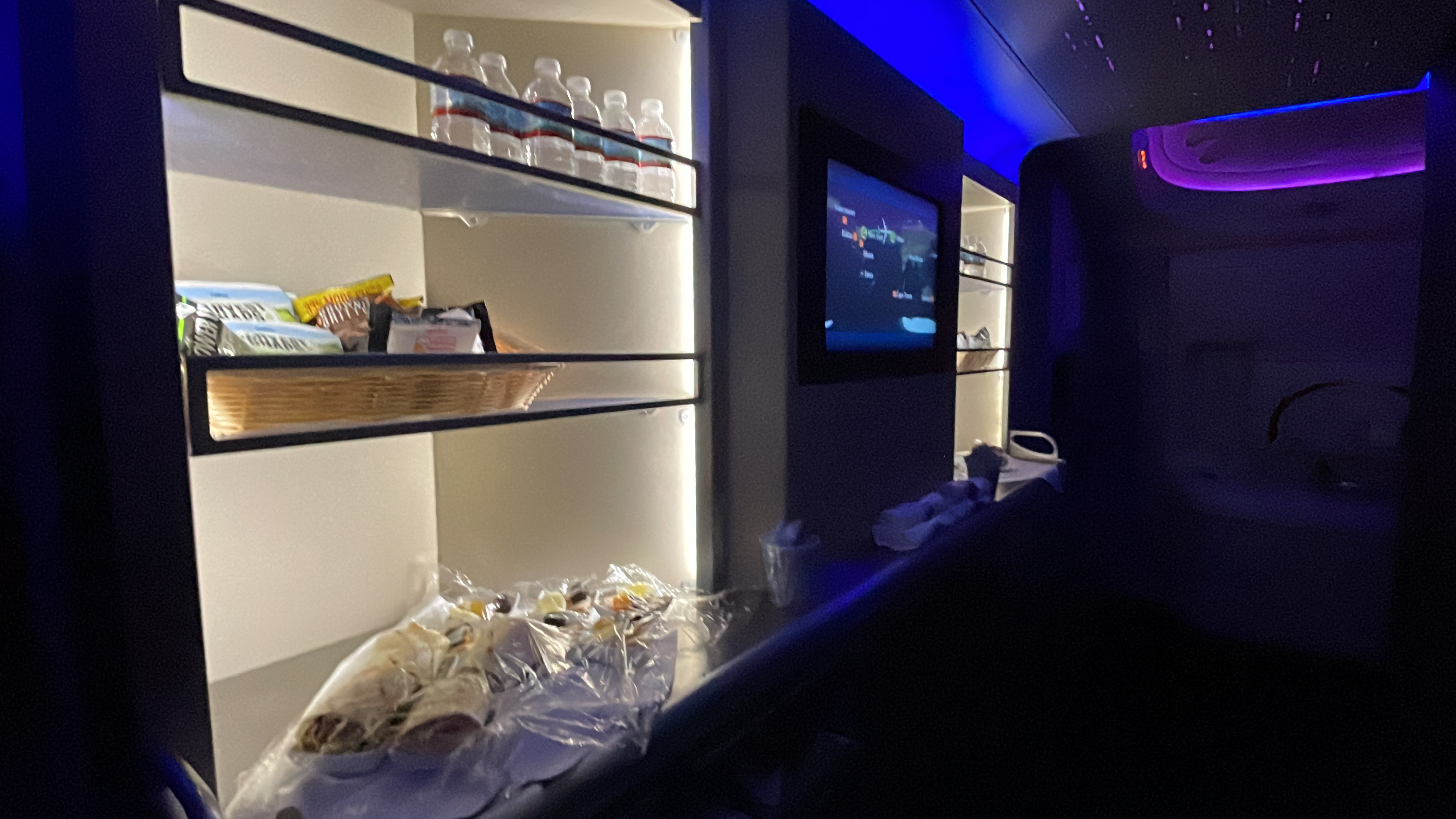 The seats – I like these B/E Aerospace seats, though I’m not sure if I like them better than the business class seats on the 777-300ER. The seat offers plenty of personal space and storage. It was comfortable for lounging, dining upright. For sleeping, I found that I tended to hit hit the pullout table while rolling over to my side. Not a problem for shorter people like me, but could be a huge nuisance for taller folks. I also liked that there were personal air nozzles available to keep me cool during the flight.