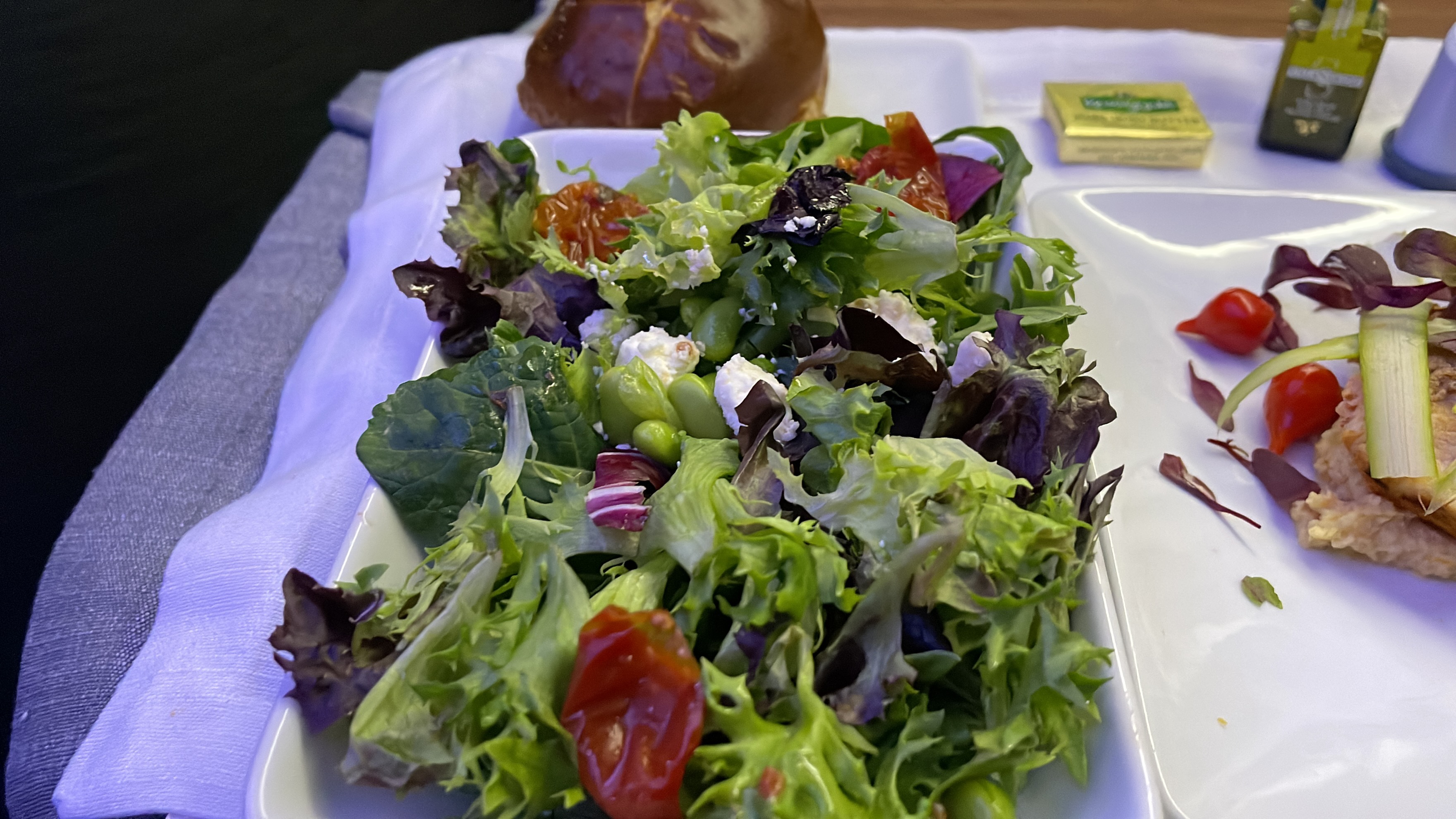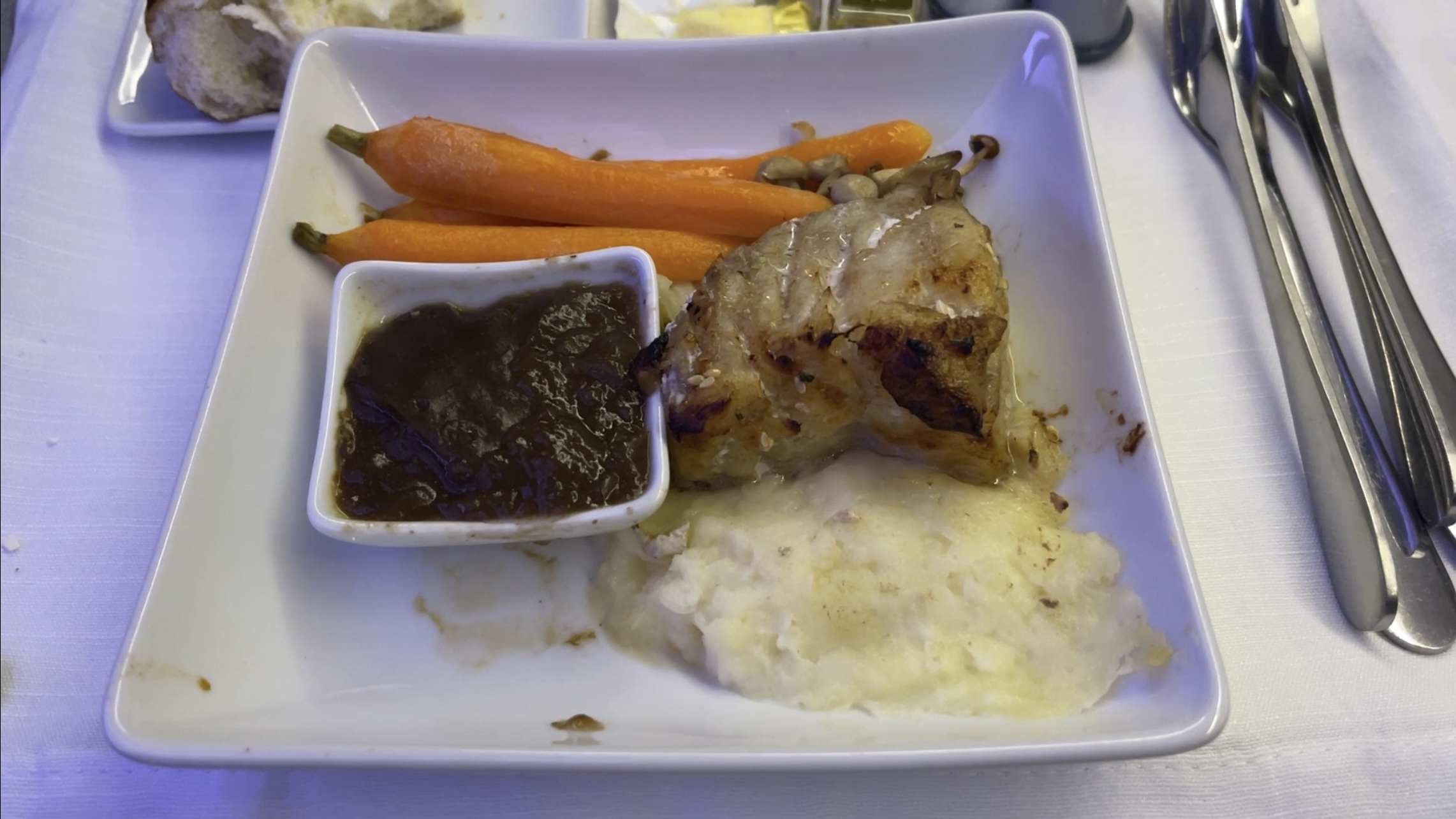 We got lucky that the aircraft operating our flight had the B/E Aerospace seats instead of the “shaking” Zodiac Concept D seats on this outbound flight from JFK. Then to our suprise, it appears that the pre-pandemic AA service was back. Pre-departure beverages were offered to business class passengers. During the flight, hot towels were also offered in addition to the service in addition to the 3 course meal service. Oh and the ice cream sundae is back! Per usual, the in-flight catering was was edible, but could be better in terms of presentation.