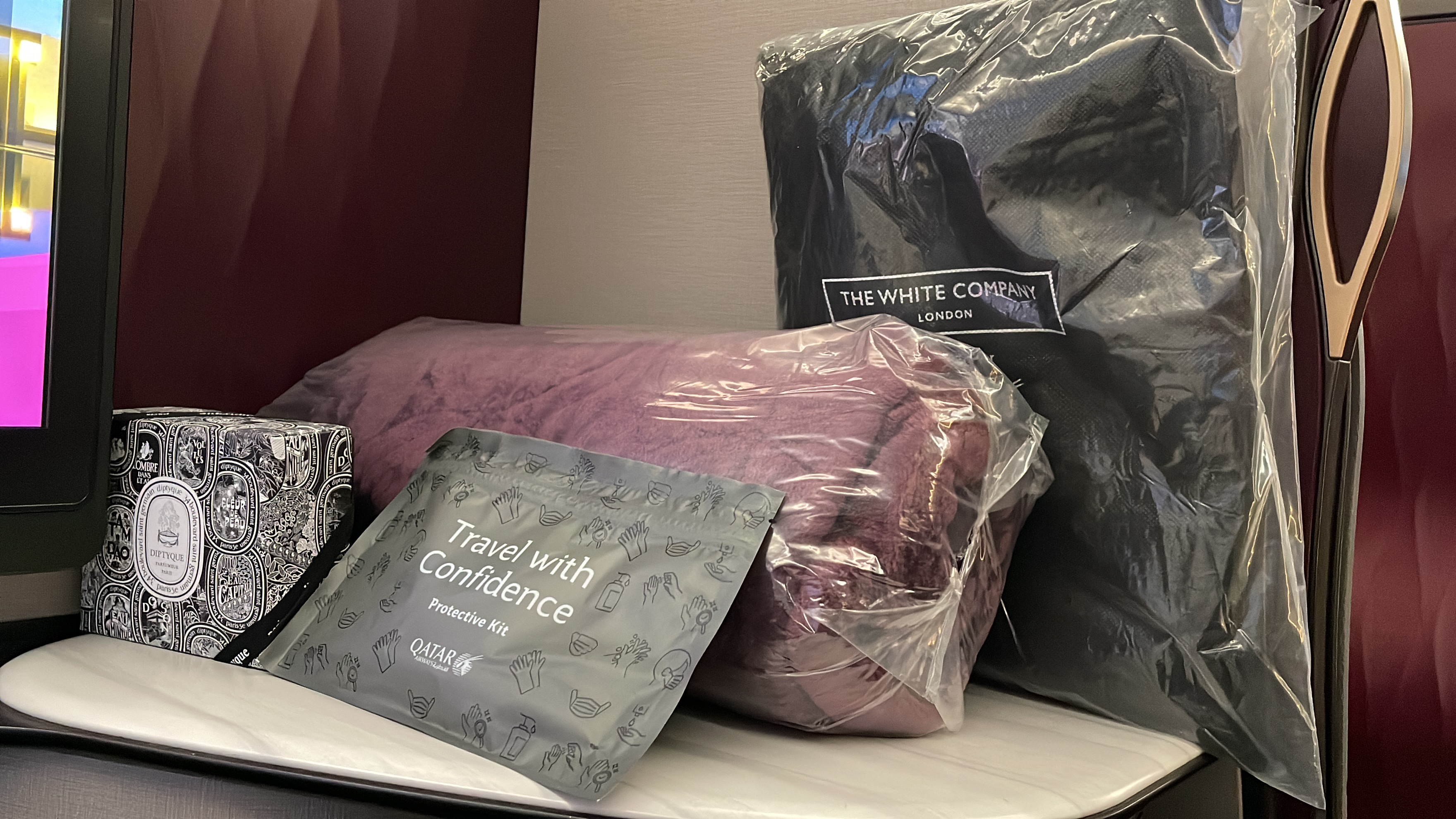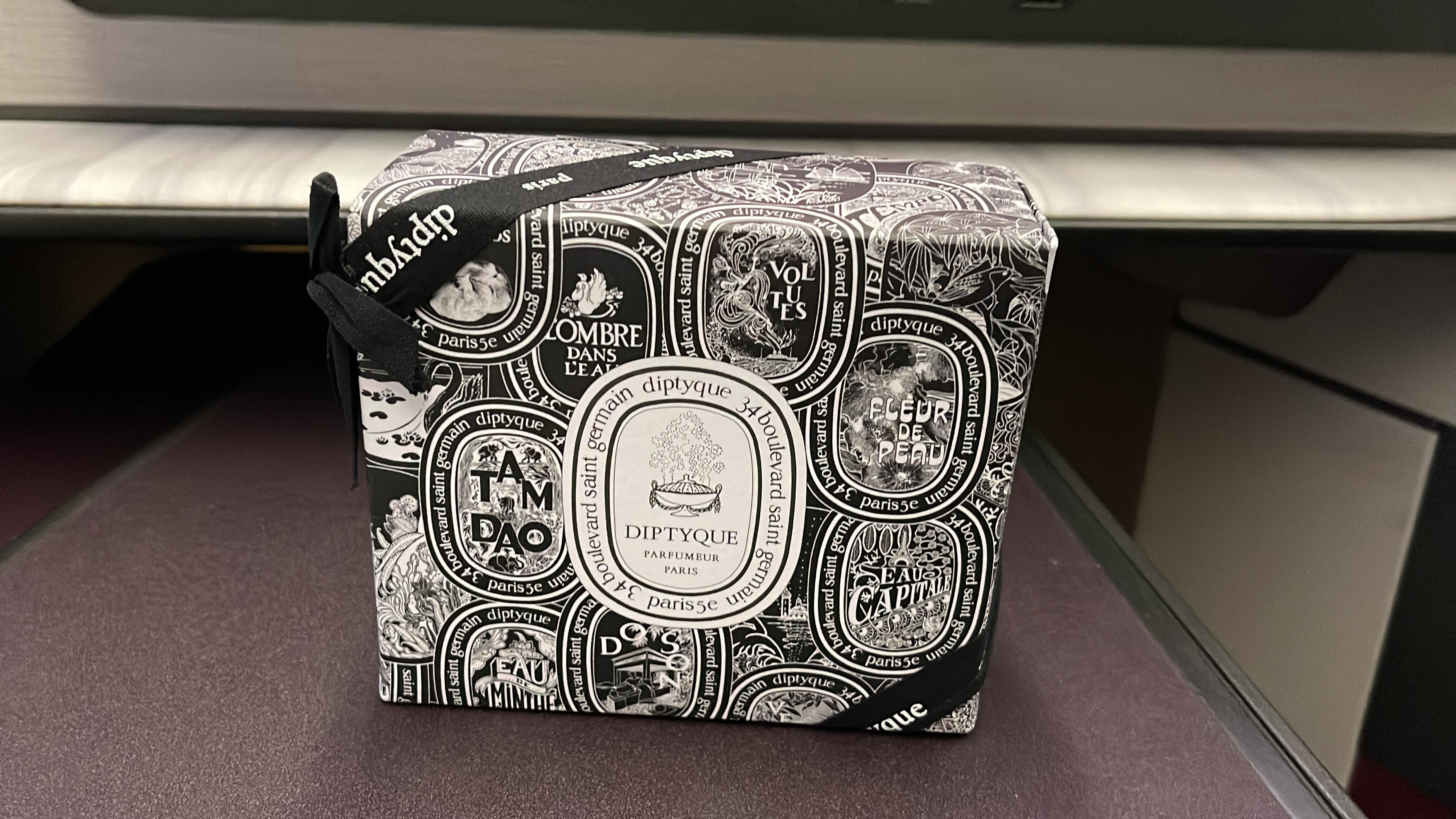 The Onboard amenities – A protective kit including mask, latex gloves, and hand sanitizer were offered to all business class passengers in addition to the Diptyque amenity kit, and loungewear by the White Company London. The lavatories were regularly cleaned by the crew and offered toiletries like facial must and hand lotion. Disposable razors and toothbrushes were also available in the lavatories.