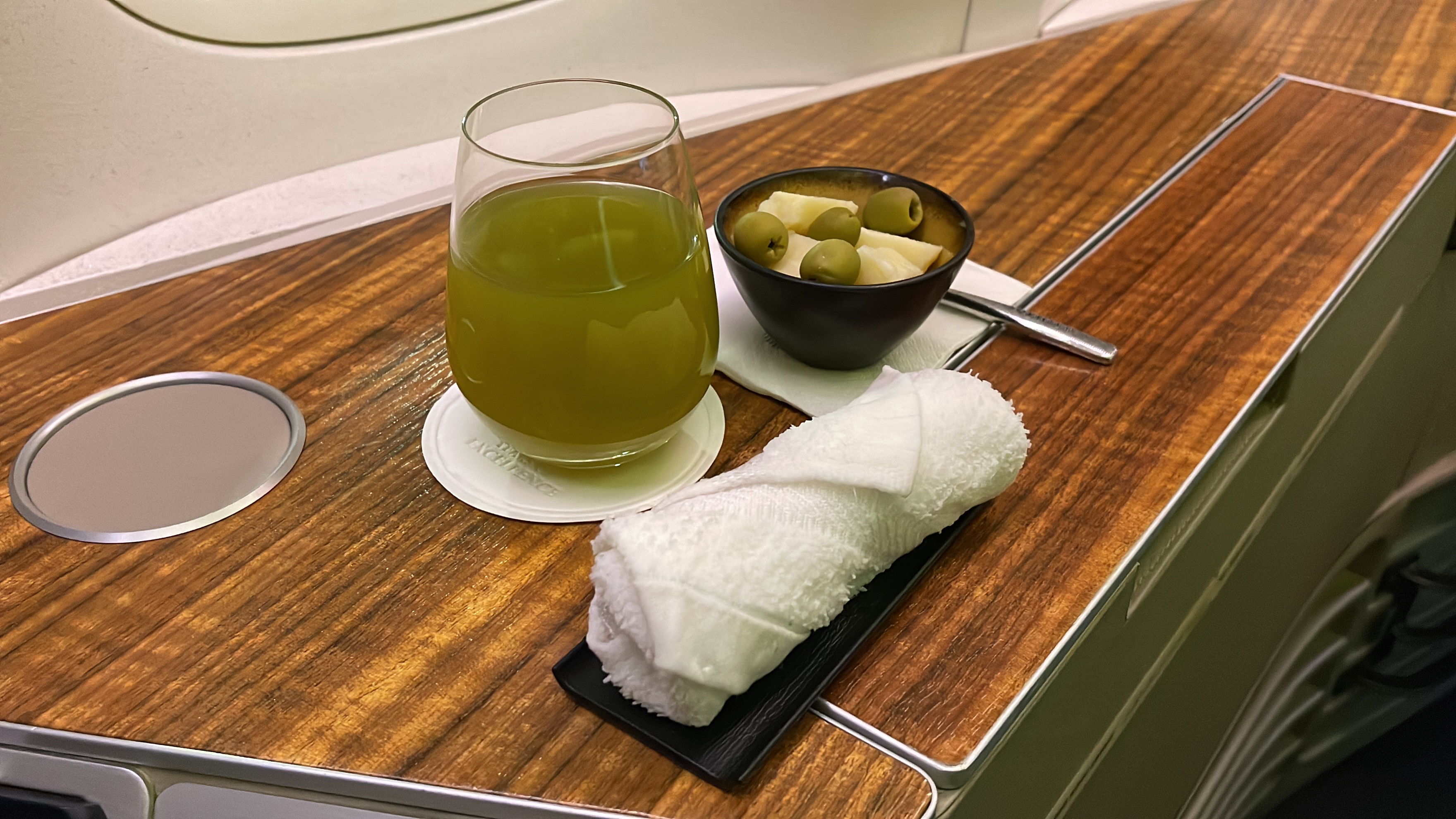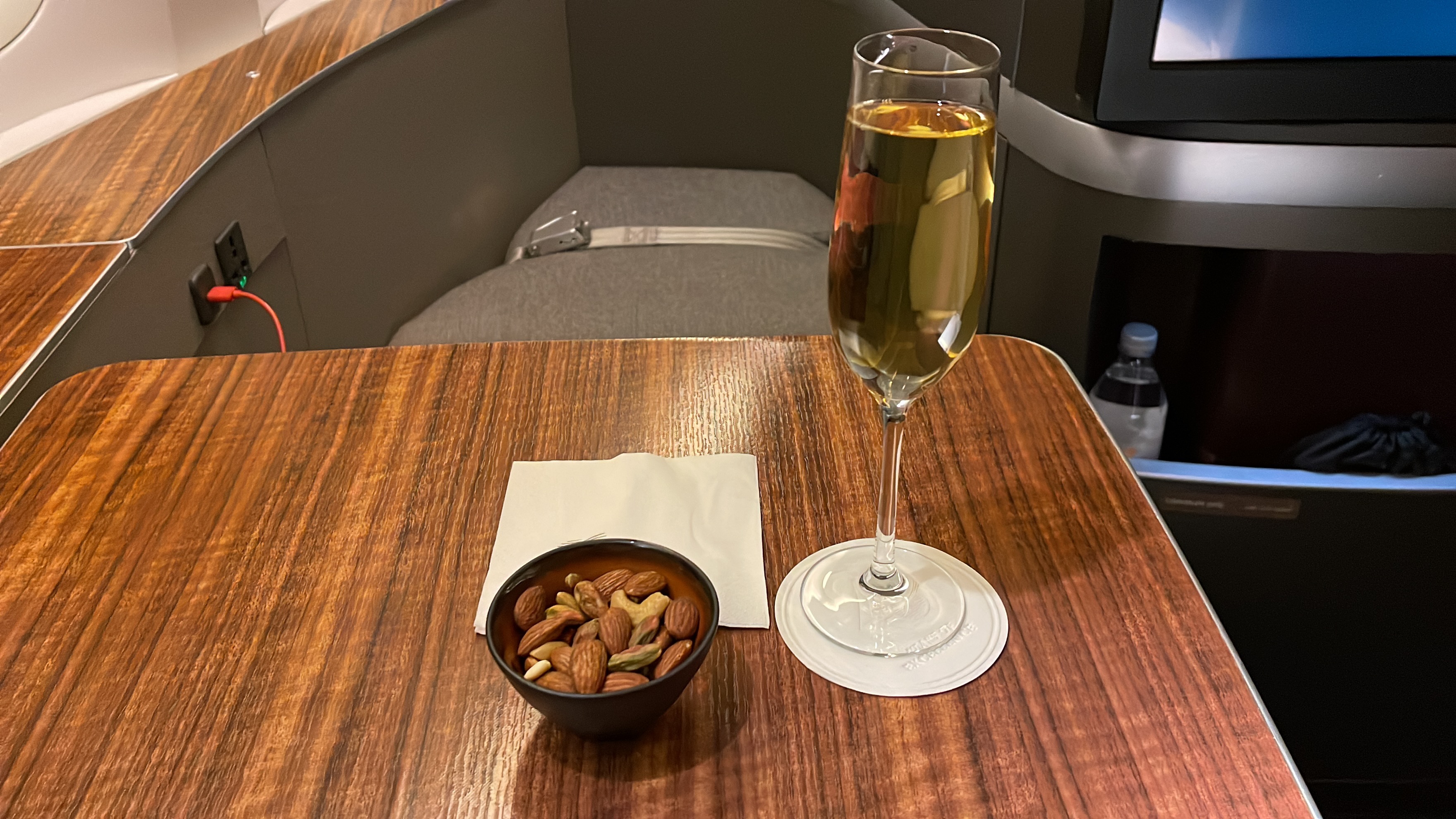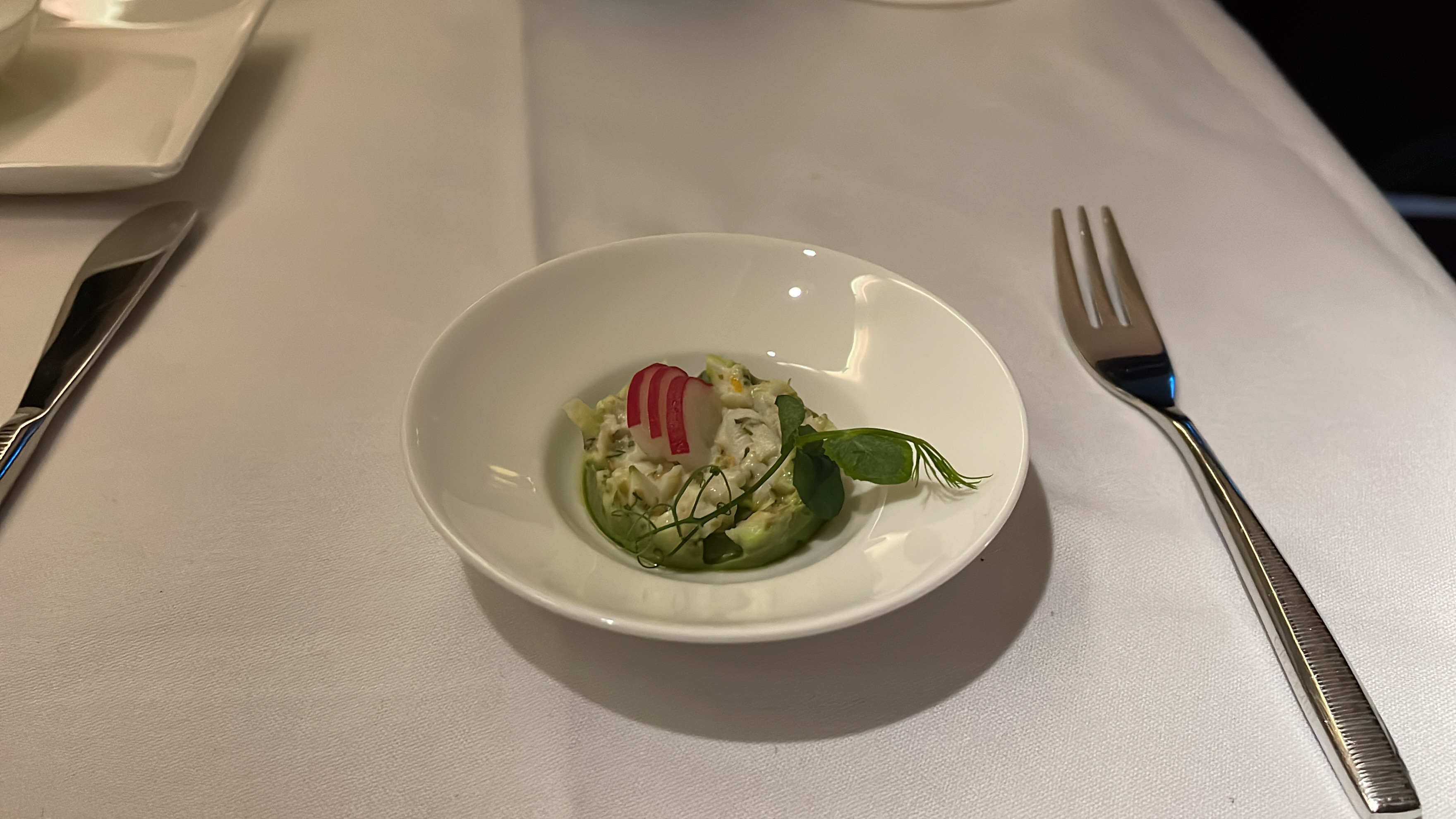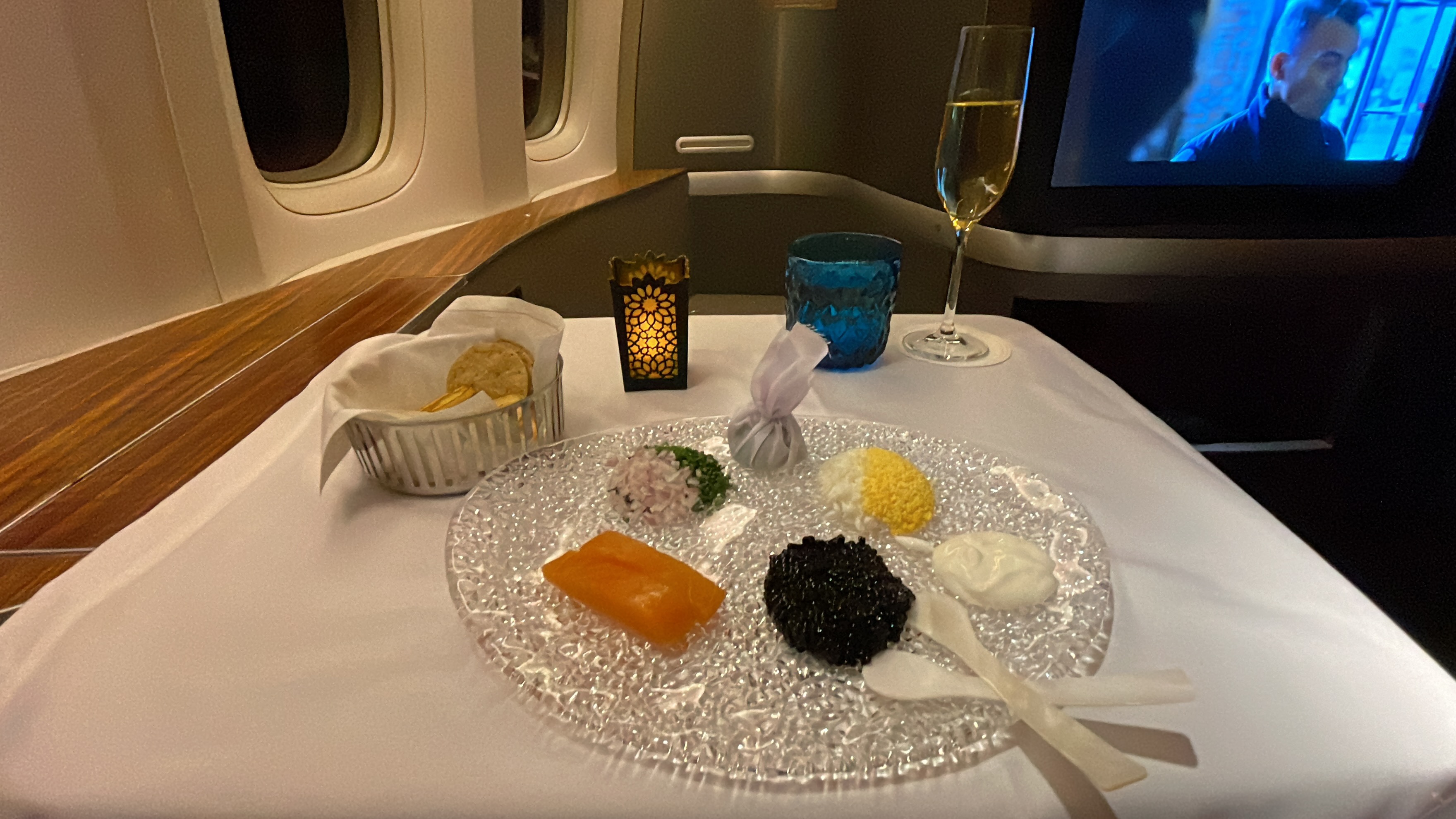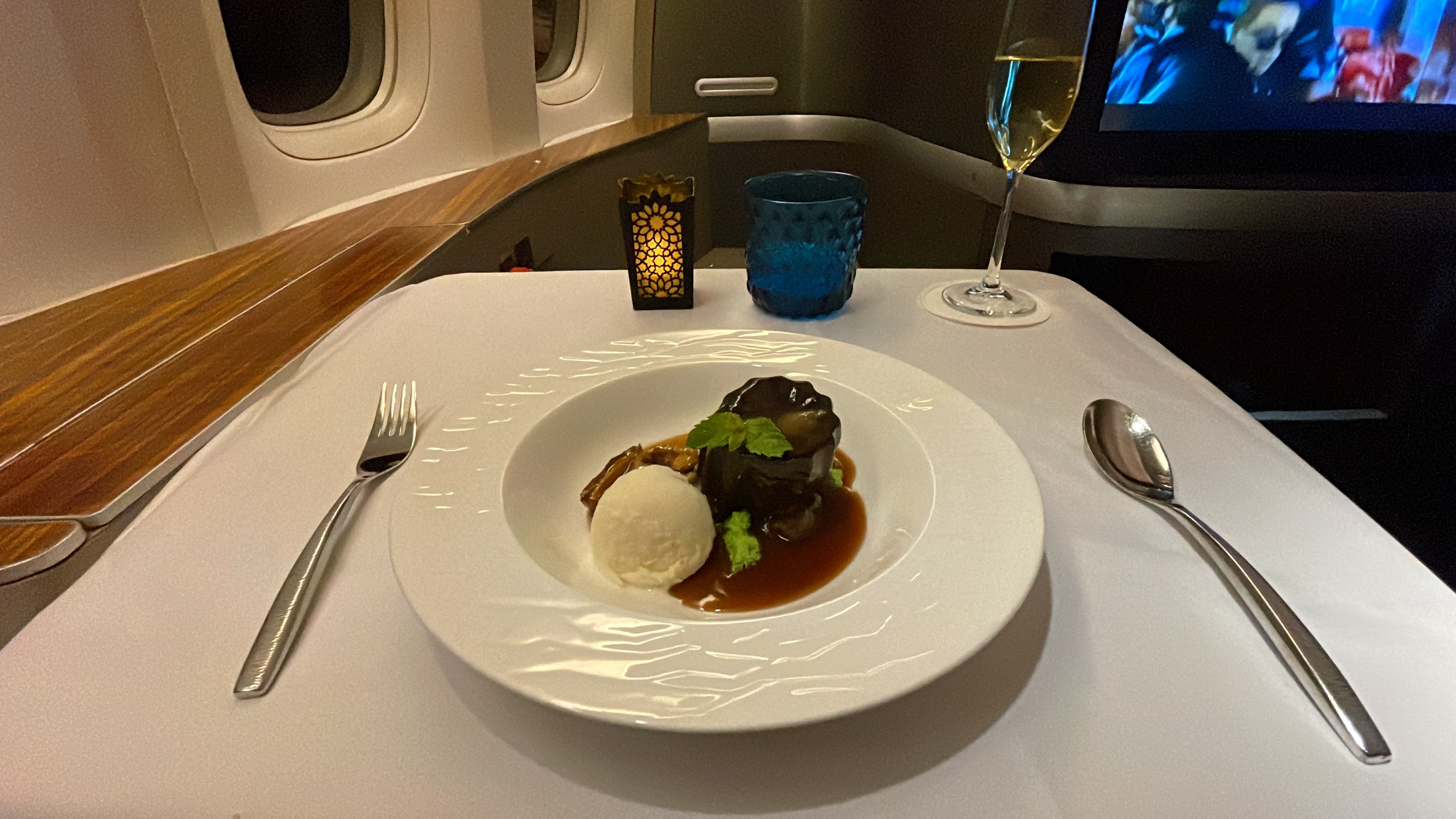 The Food – The catering on this flight was absolutely scrumptious! The meal service started with a caviar course, followed by an amuse bouche, bread service, main, and dessert. It’s worth noting that Krug (vintage) champagne was also available on their wine list, which we took full advantage of. We were very satisfied (and full) with the meal service on board.