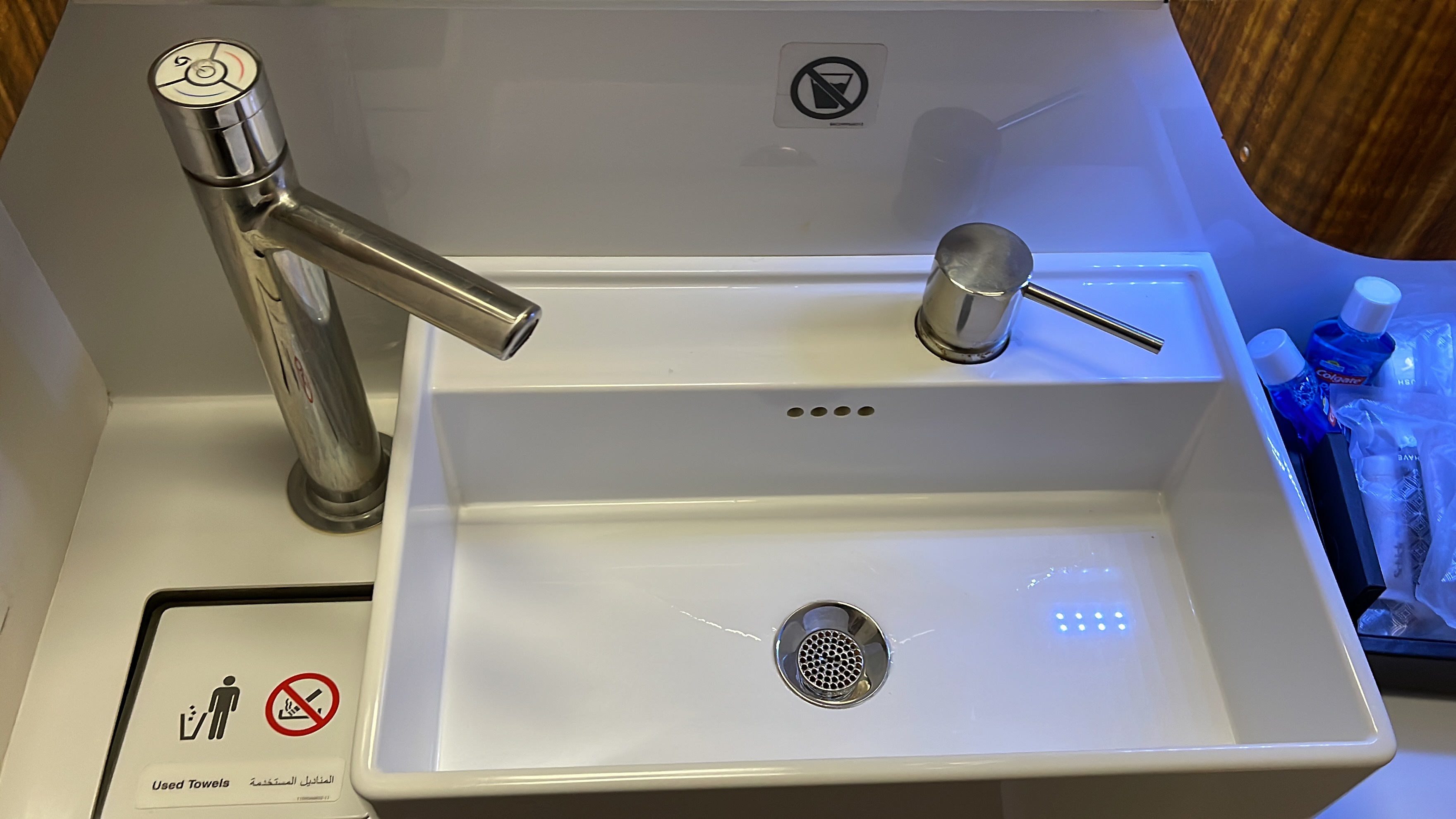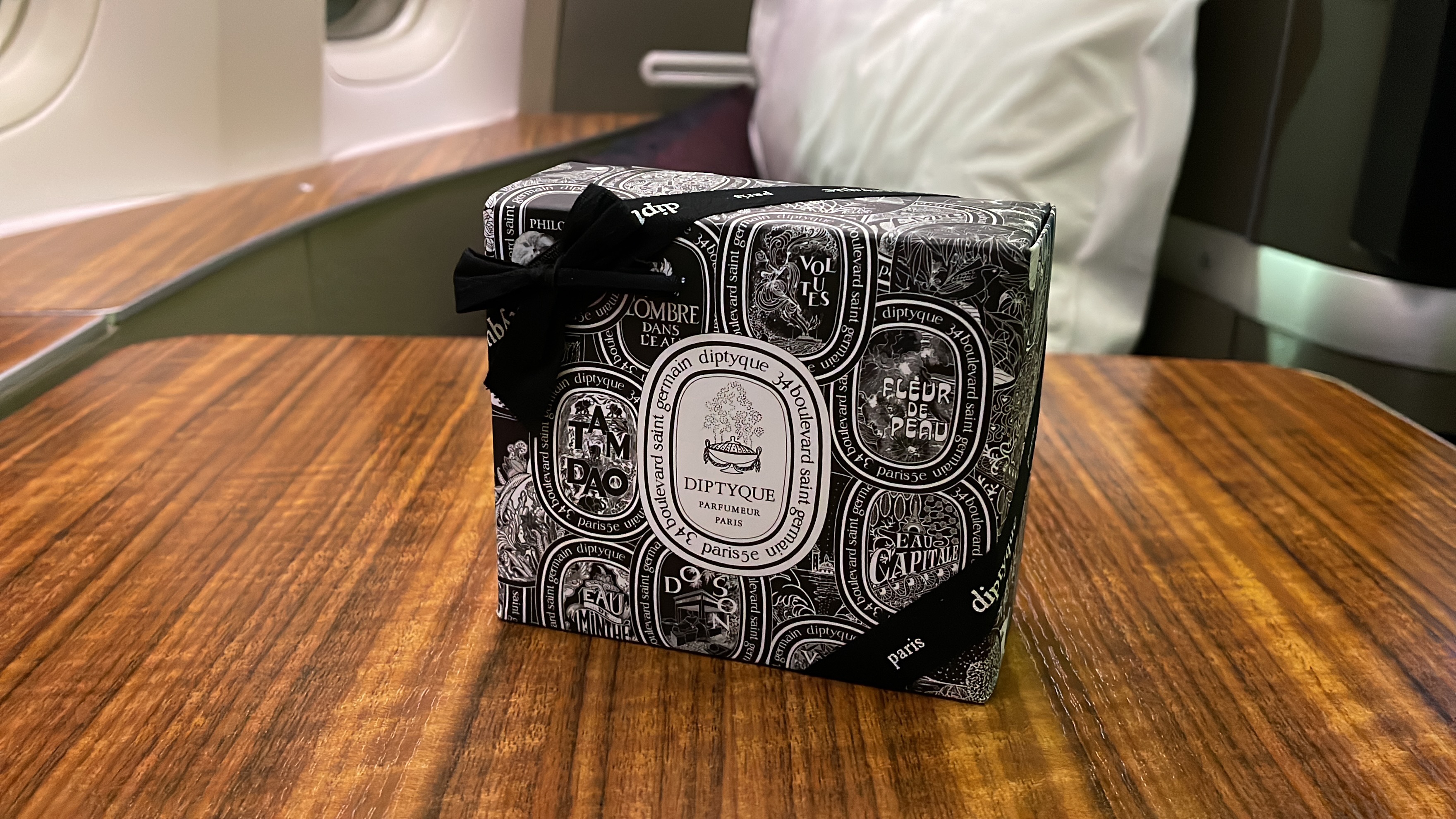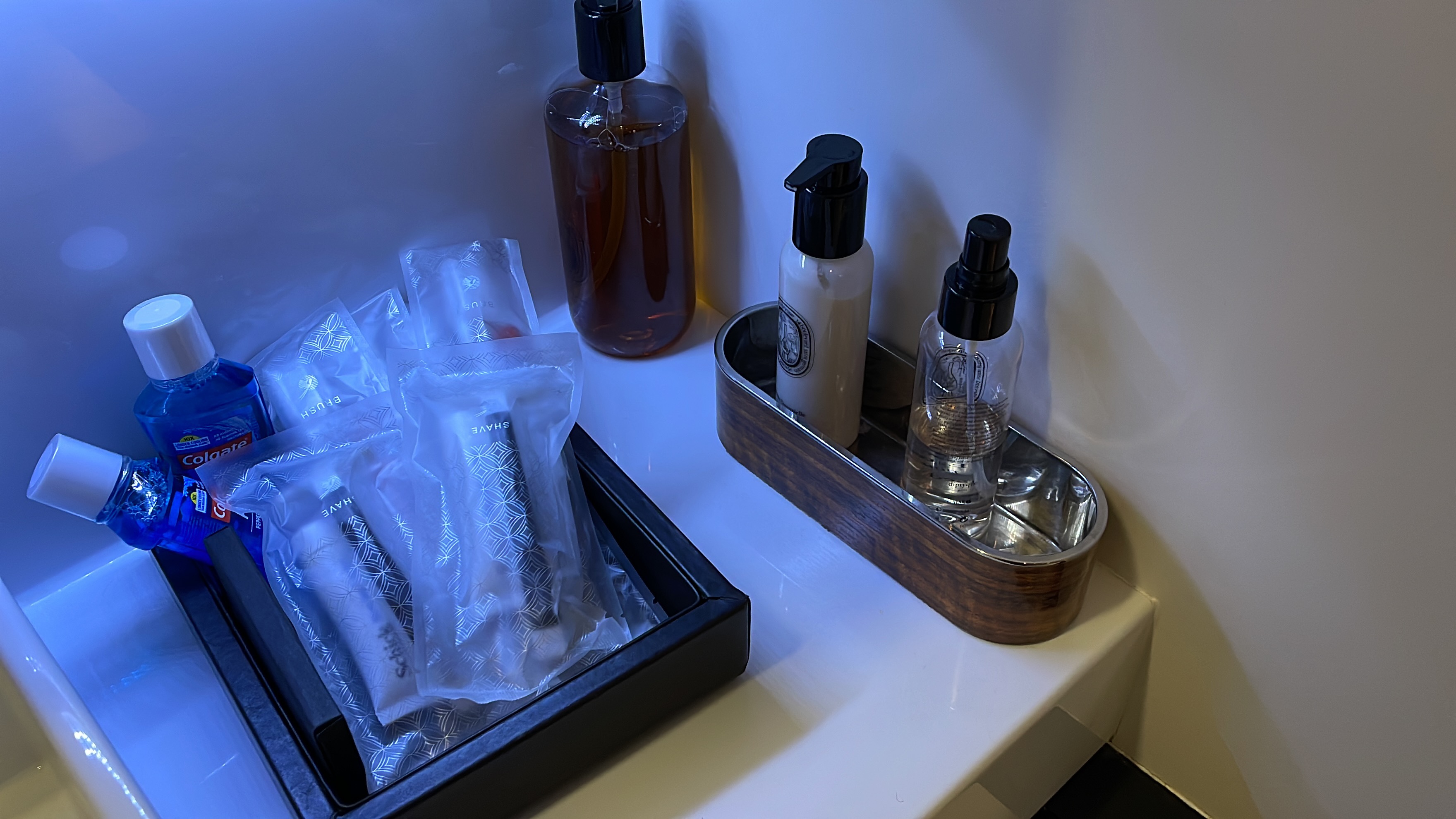 The Onboard amenities – A Diptyque Amenity Kit, Loungewear by the White Company London, and protective kit including mask, latex gloves, and hand sanitizer were offered to First Class passengers. These items are normally only offered on long haul business class flights, so it was quite a treat to get them on a 4-hour flight. The lavatories were clean, and offered toiletries and amenities like toothbrushes, mouthwash, and razors.