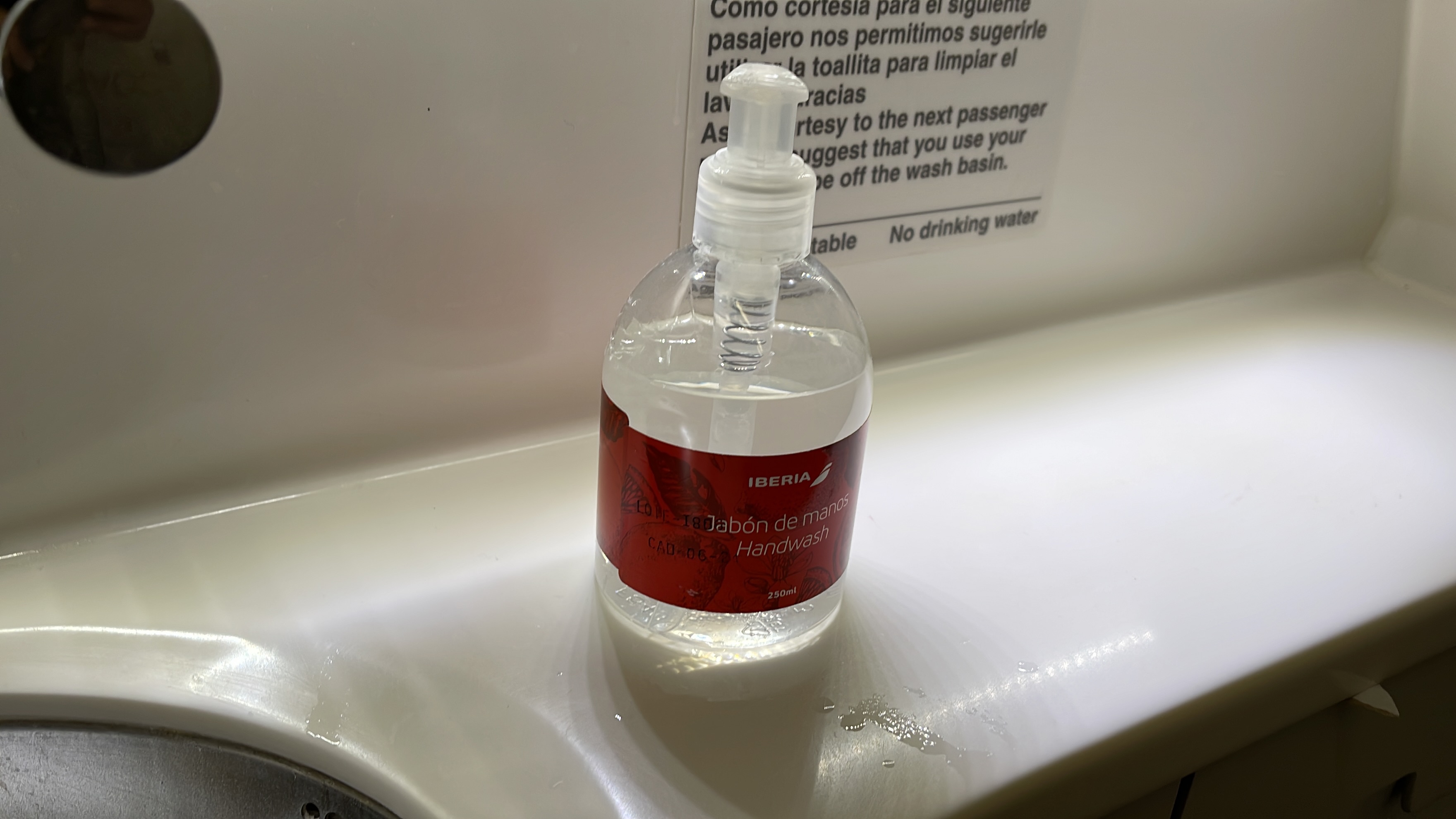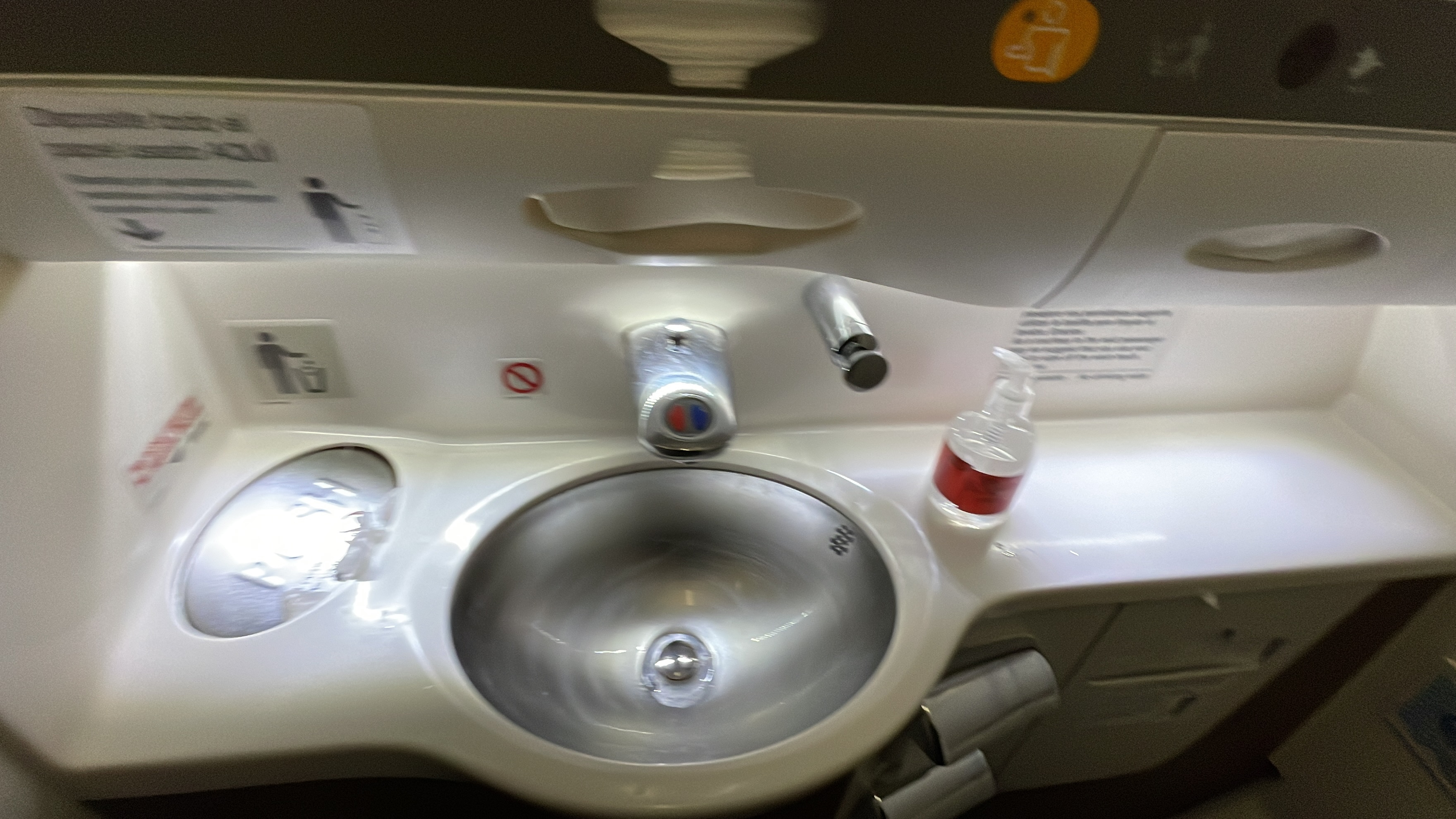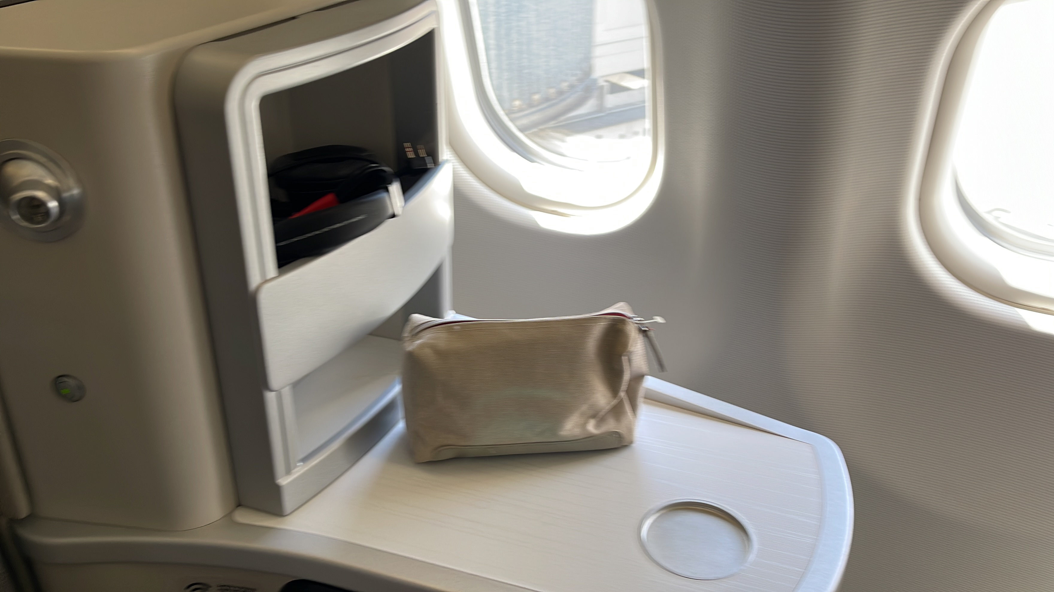 The Onboard amenities – A business class amenity amenity kit and noise canceling headphones were offered to all business class passengers, which is pretty standard nowadays. A full-size pillow, duvet, and mattress with good padding was also available at our seats. The lavatories, although very clean only offered a hand soap. No other toiletries were available in the lavatories.