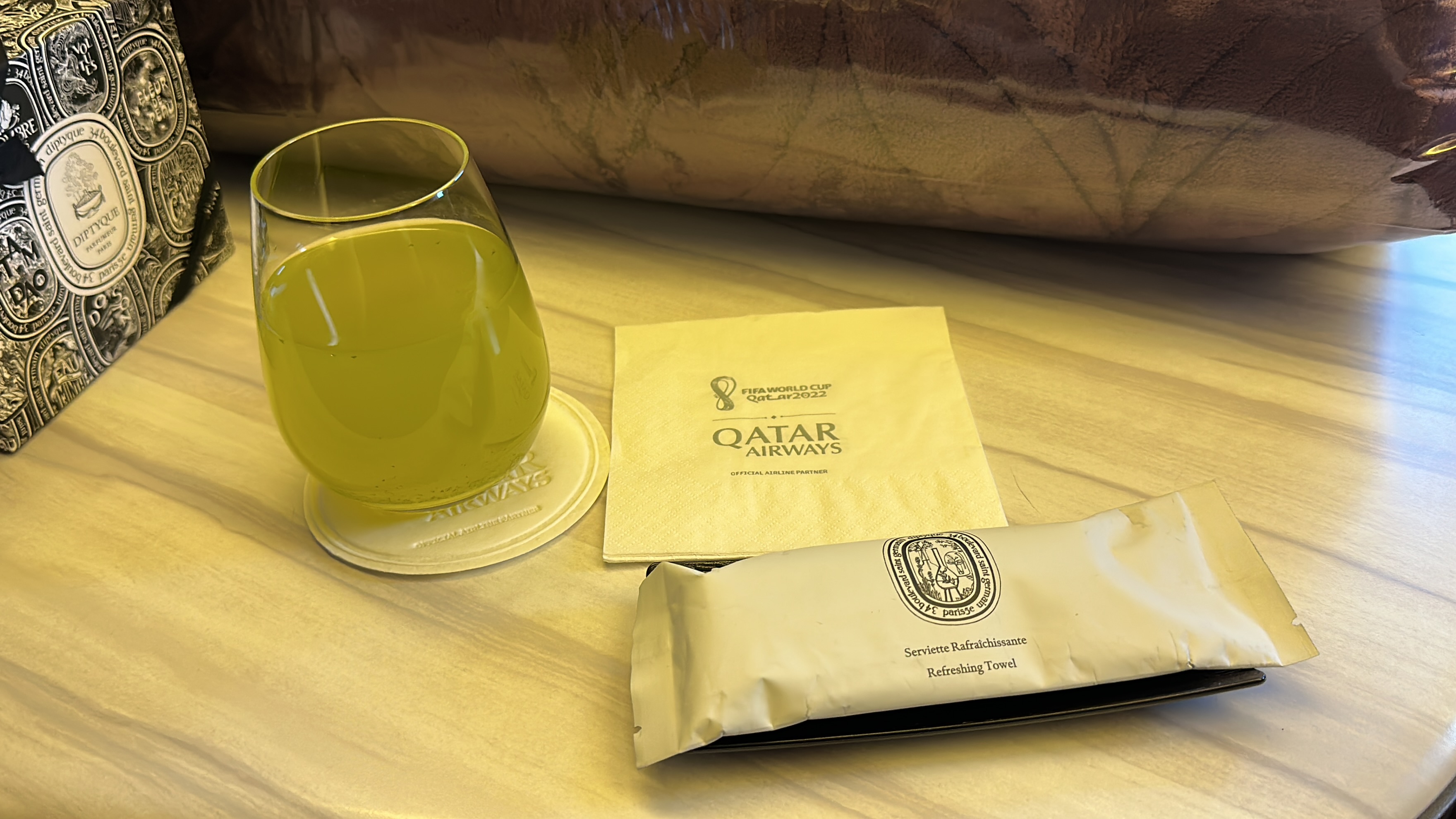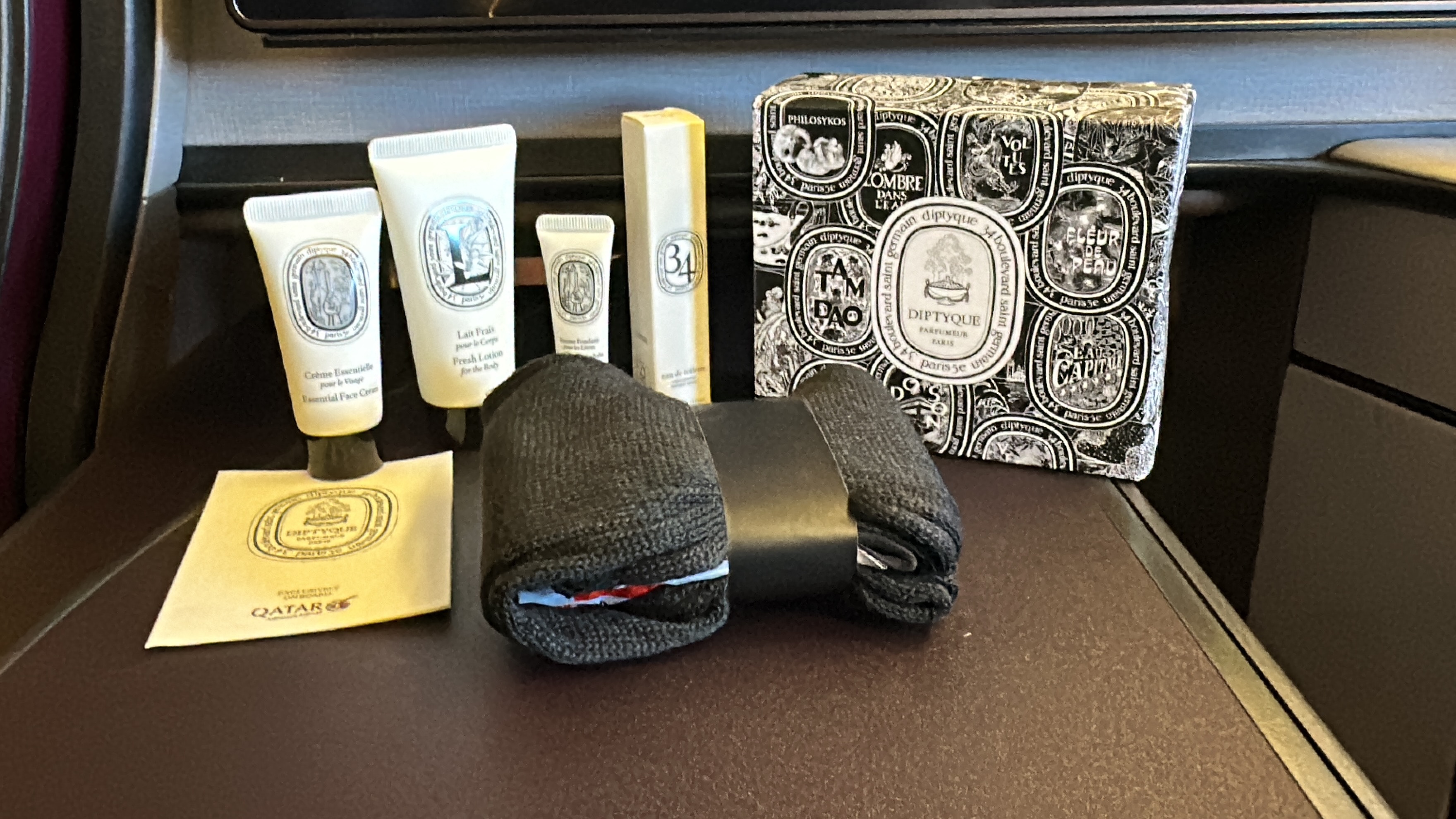 The amenities – Qatar offers excellent business class amenities. All passengers are offered a Diptyque amenity kit, and pajamas by The White Company London. A bottled water, and noise canceling headphones are available at each seat. A full-size pillow, a thick and comfortable duvet were also available at each seat, although I did notice that mattress pads were not available on this flight, and are only available for Ultra Long Haul flights. The lavatories are also very clean and fully stocked with toiletries, toothbrushes, and razors.