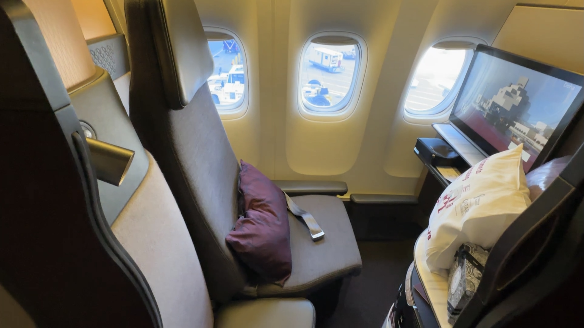 The seats – The seats (suites) on Qatar’s 777s are nearly identical to its Airbus counterparts. One thing that’s apparent to us was the moving map and IFE remote on the 777s are from a previous generation. The QSuite cabin also felt more spacious on the A350 due to the lack of center overhead bins. Otherwise, the seat is still very comfortable, spacious and well laid out. The seat controls, IFE, storage, and power outlets are all within an easy reach. And of course the QSuite also features a door that you can close in-flight for extra privacy.