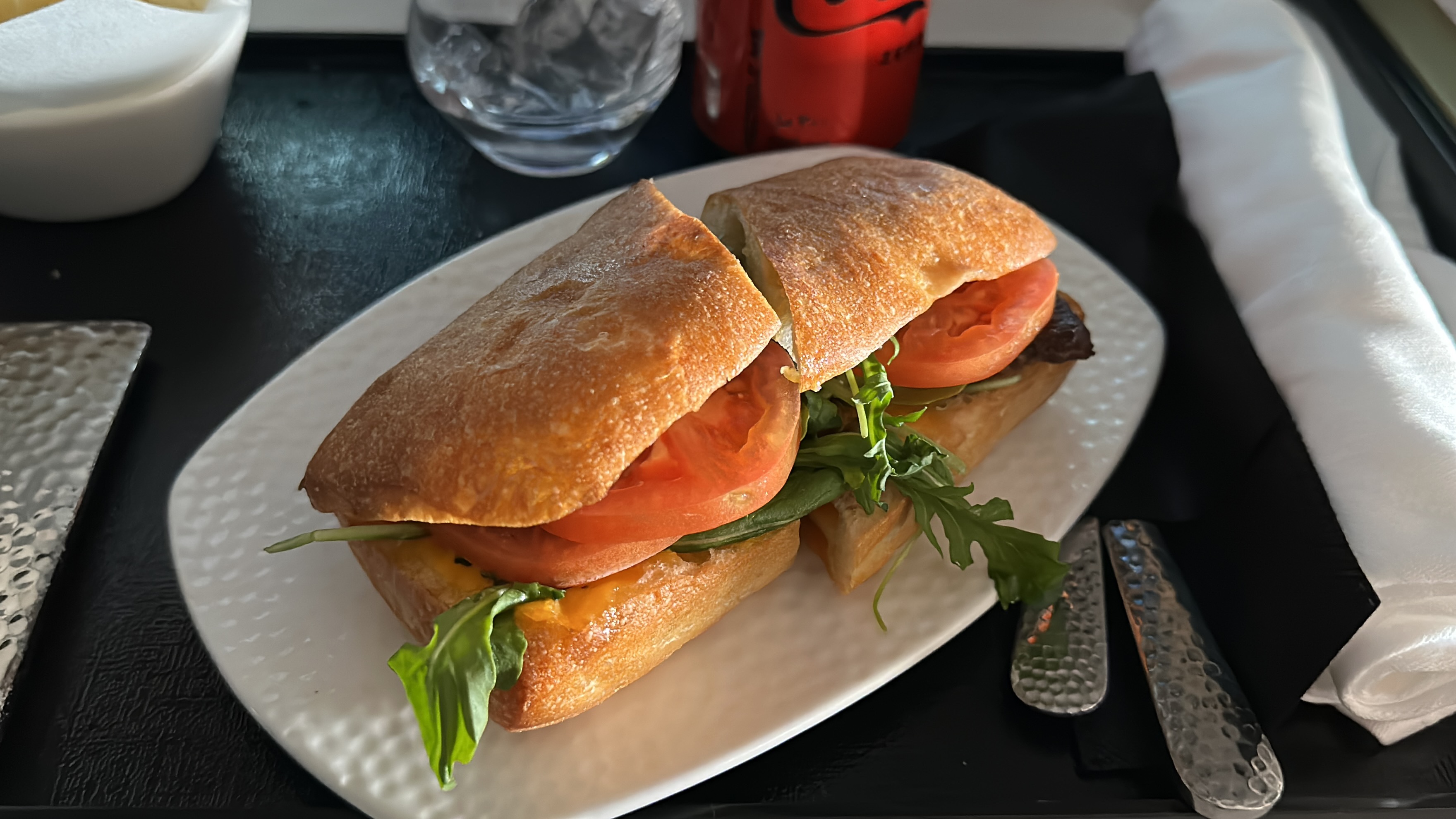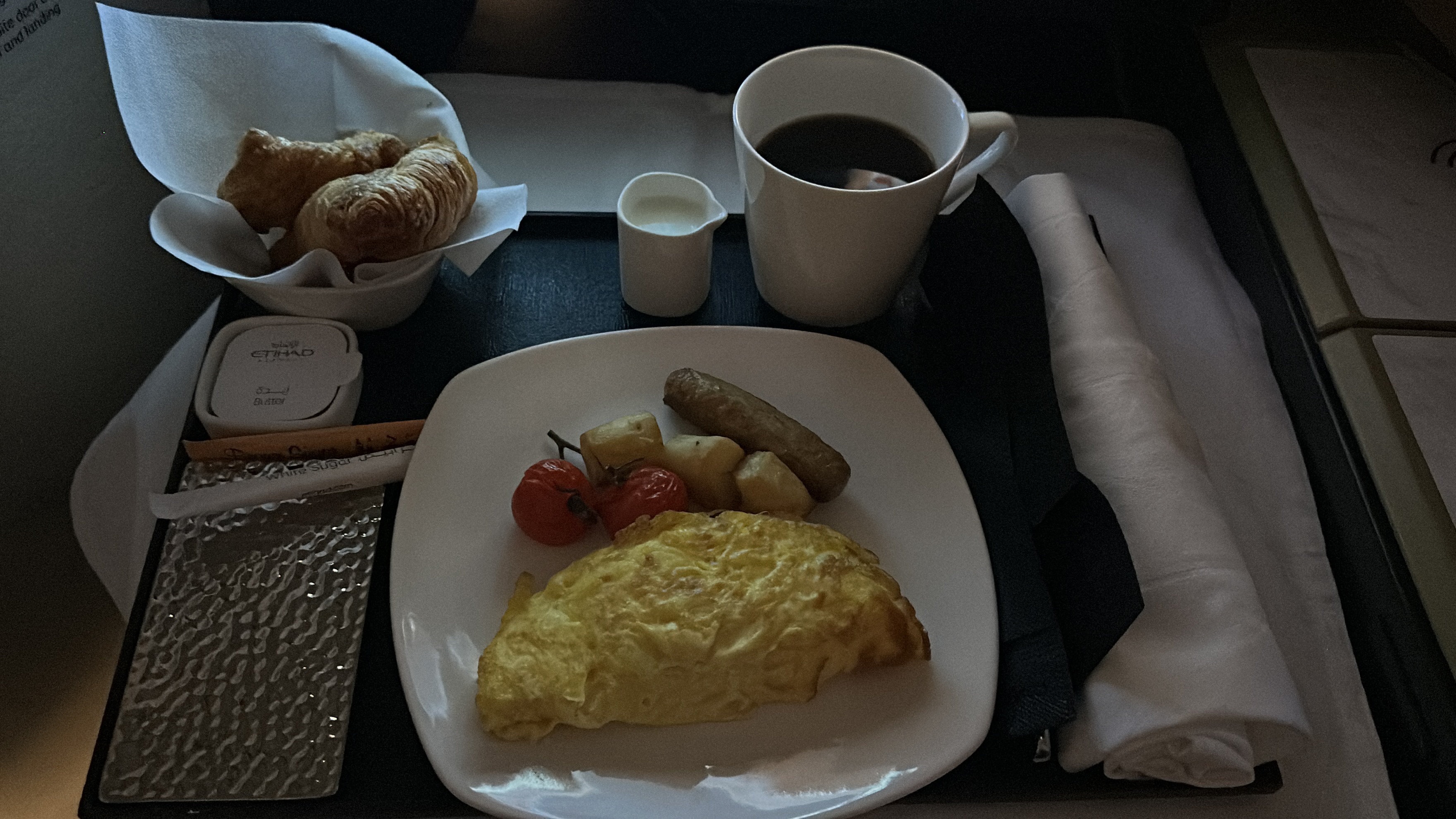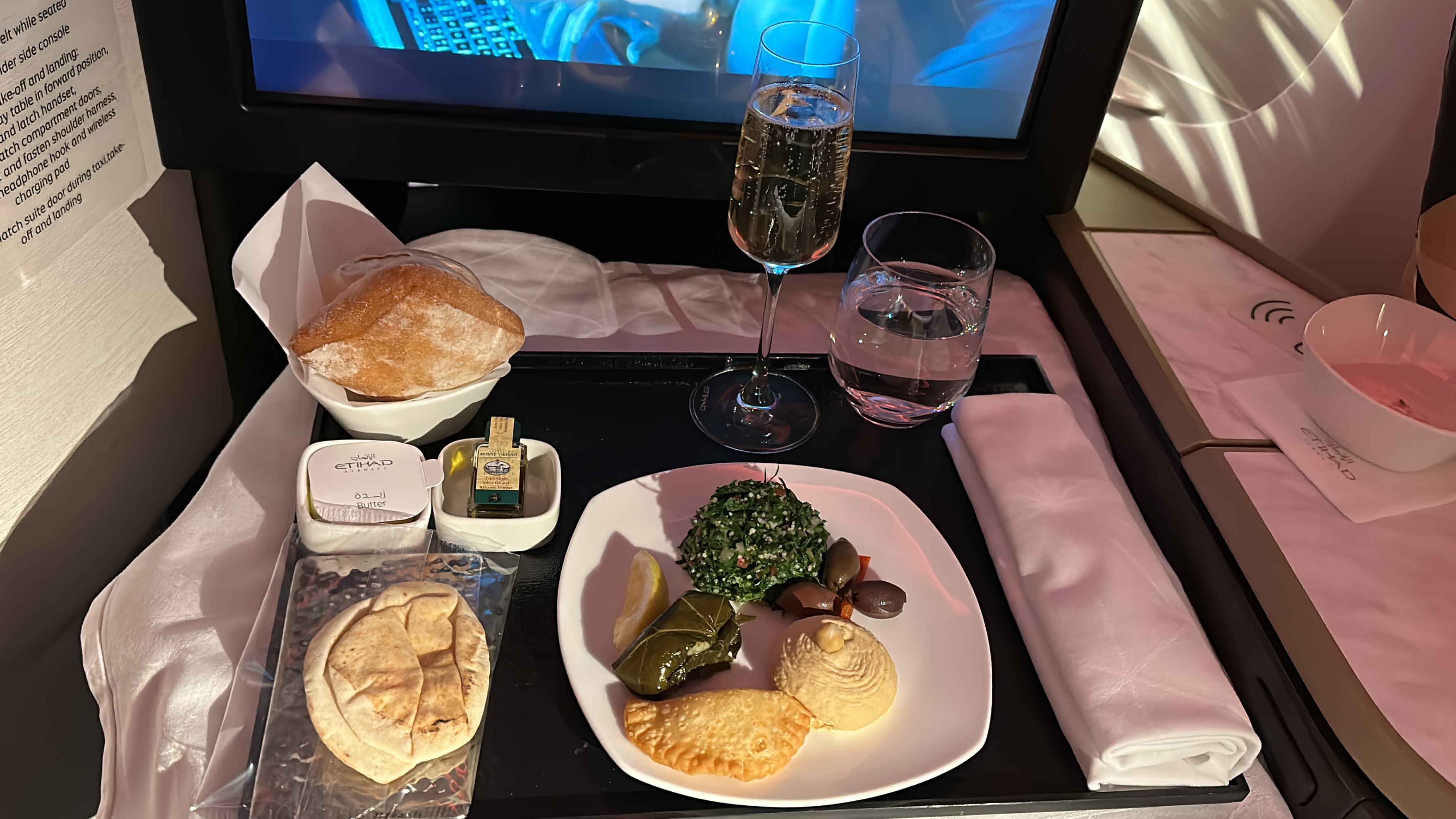 The Food – The Food – Etihad did not disappoint in terms of the in-flight cuisine. Our meals were delicious, starting with a tasty Arabic Mezze appetizer. The tuna tataki was also a delightful surprise, visually appealing and mouthwatering. The roast chicken main course was juicy and simply scrumptious. My companion’s Cajun prawns were a hit, perfectly seasoned with a spicy kick. The standout dish was undoubtedly the steak sandwich, with soft bread and a perfectly cooked medium steak. The pre-landing breakfast wasn’t mind-blowing, but still decent, with a cheese omelet with chicken sausage to end the flight.