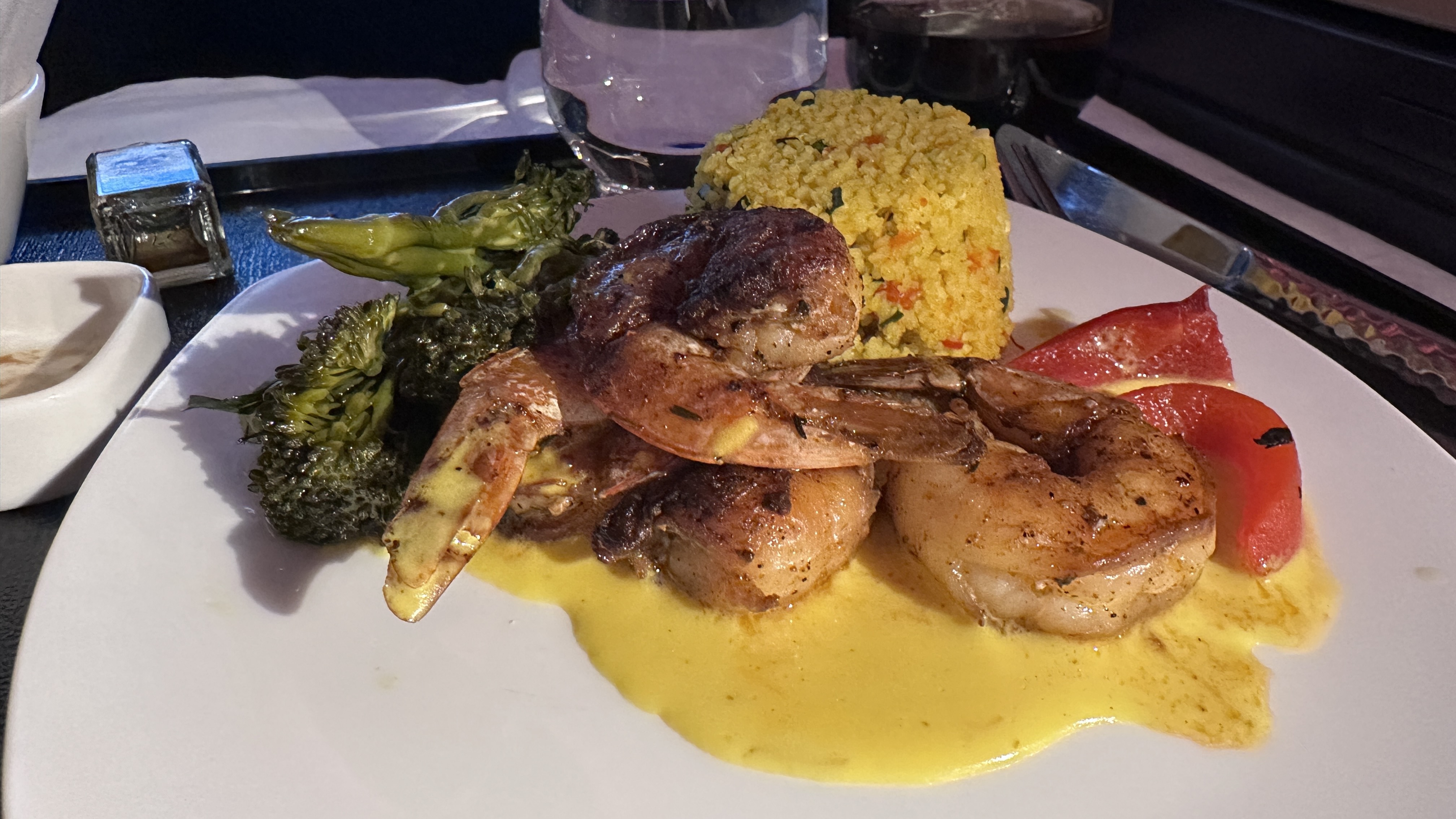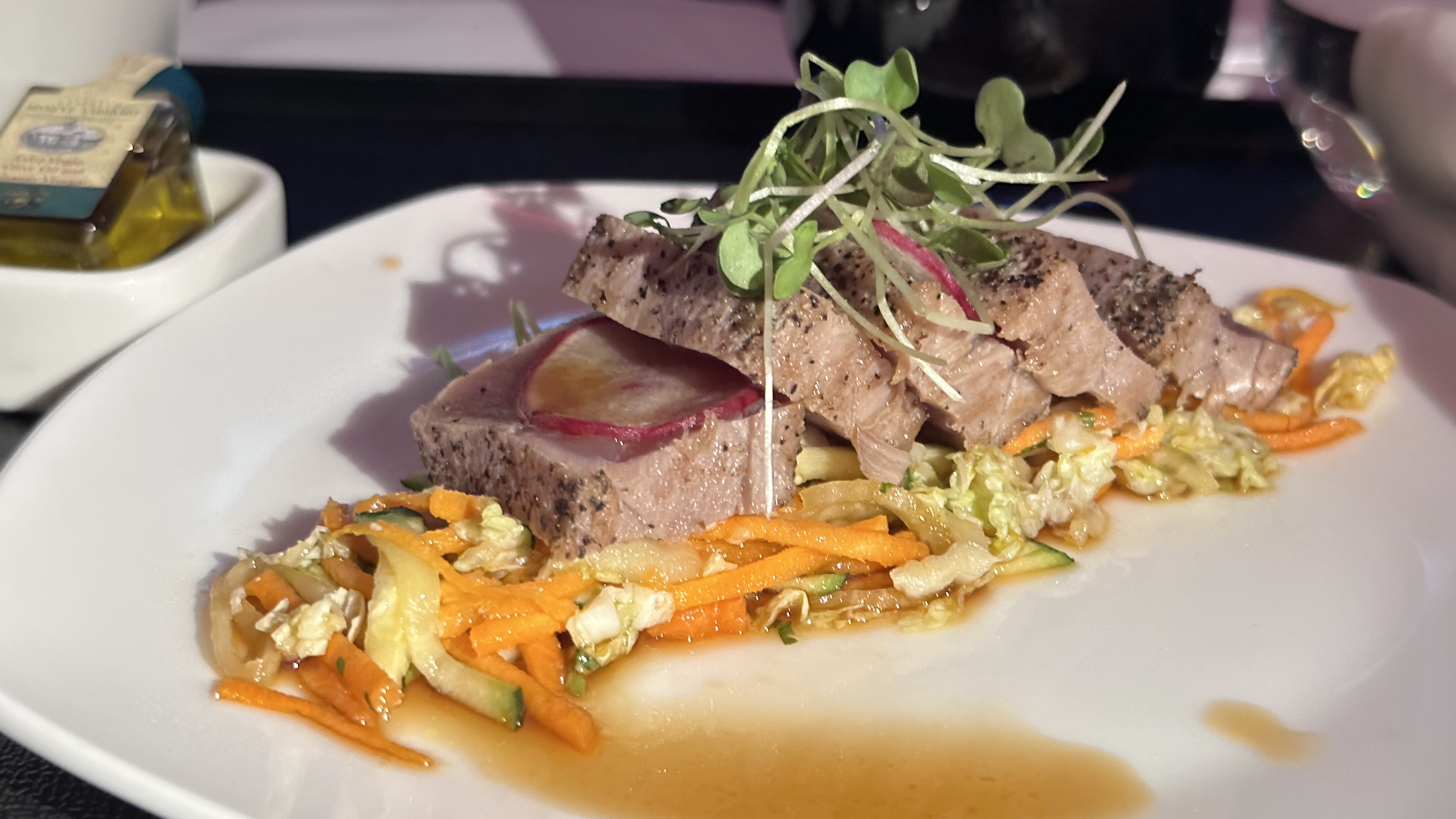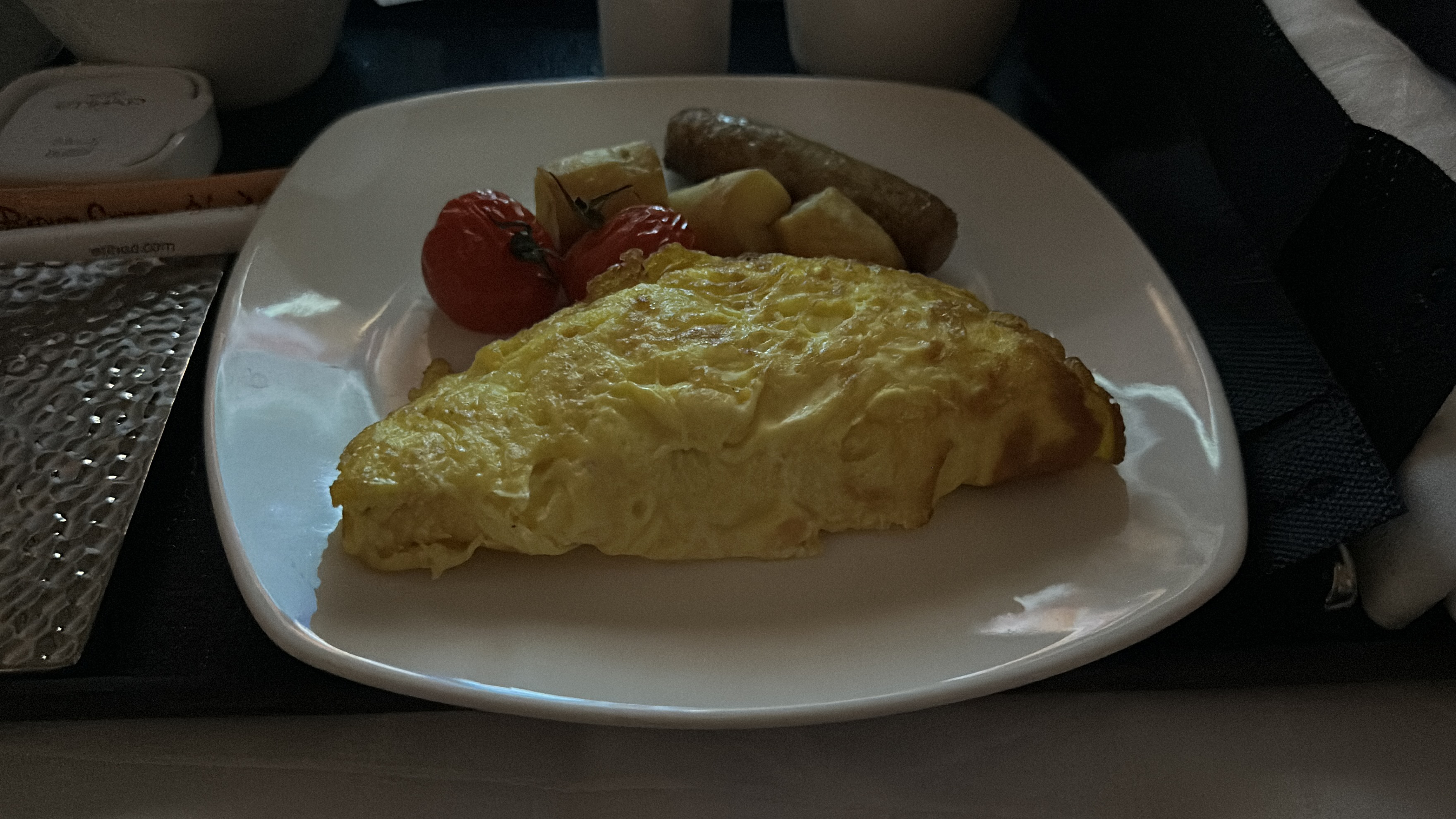 The Food – The Food – Etihad did not disappoint in terms of the in-flight cuisine. Our meals were delicious, starting with a tasty Arabic Mezze appetizer. The tuna tataki was also a delightful surprise, visually appealing and mouthwatering. The roast chicken main course was juicy and simply scrumptious. My companion’s Cajun prawns were a hit, perfectly seasoned with a spicy kick. The standout dish was undoubtedly the steak sandwich, with soft bread and a perfectly cooked medium steak. The pre-landing breakfast wasn’t mind-blowing, but still decent, with a cheese omelet with chicken sausage to end the flight.