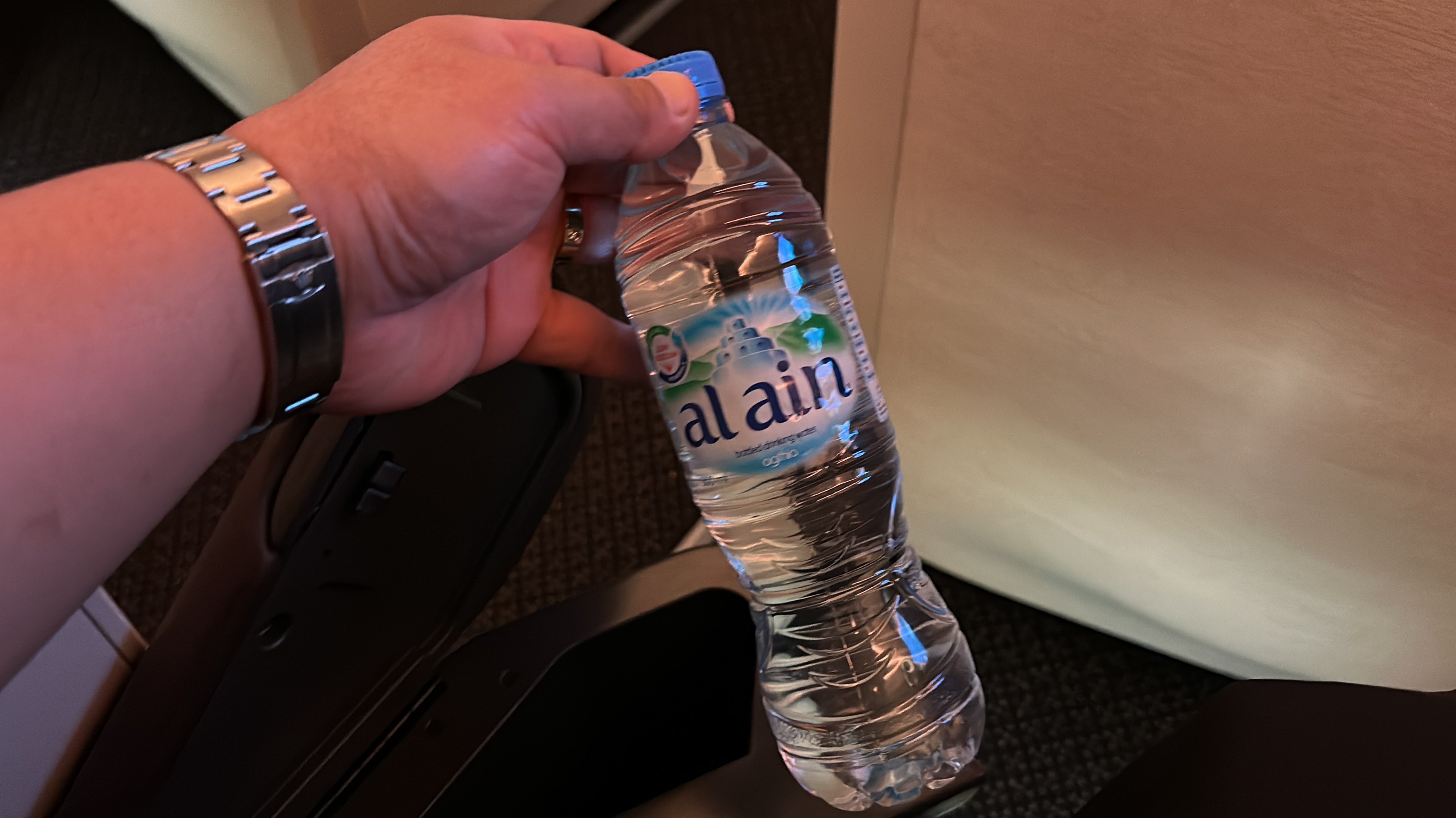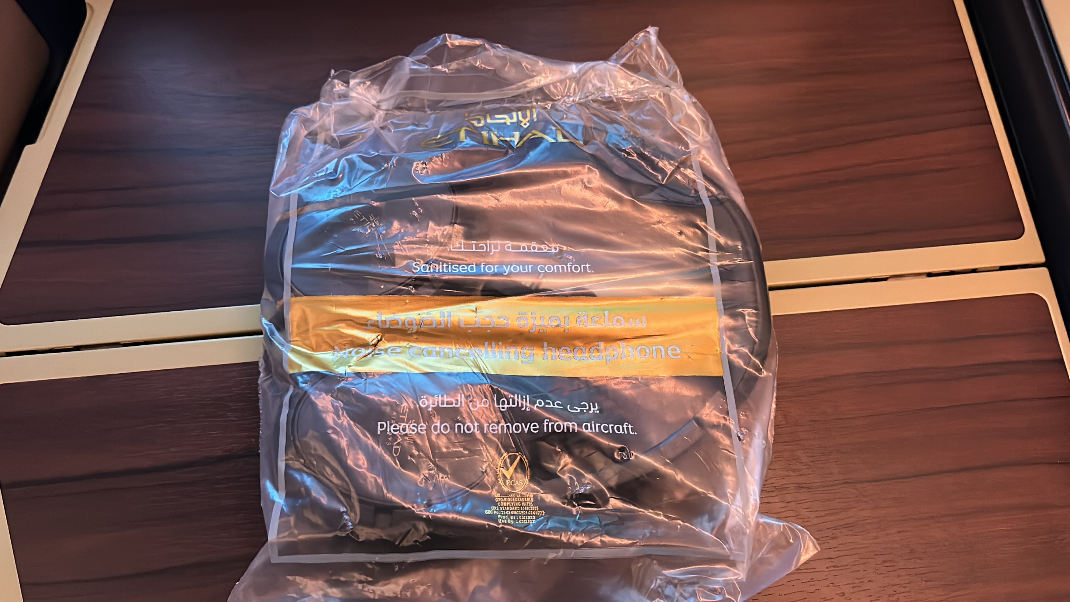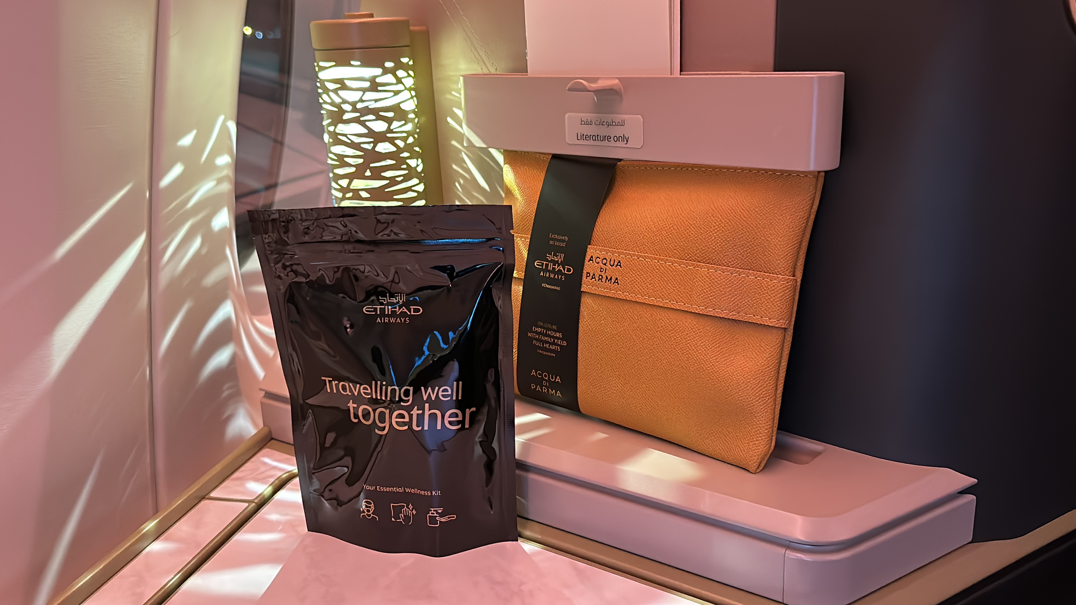 Amenities – Etihad provides a stylish Acqua di Parma amenity kit for business class passengers, complete with a good quality pouch. While the included items were appreciated, such as a sample bottle of cologne, dental kit, and eyeshades and socks, there were no additional items like lotion or lip balm included. The lavatories, while kept clean by the flight crew, were lacking in terms of offering any additional toiletries besides soap and hand sanitizer. A personal protection kit with hand sanitizer, gloves, and face mask was provided to all passengers during the flight. Unfortunately, Etihad no longer offers pajamas for business class passengers. A good size pillow and duvet were waiting at the seat along with bottled water, but sadly no mattress pad was available for the flight.