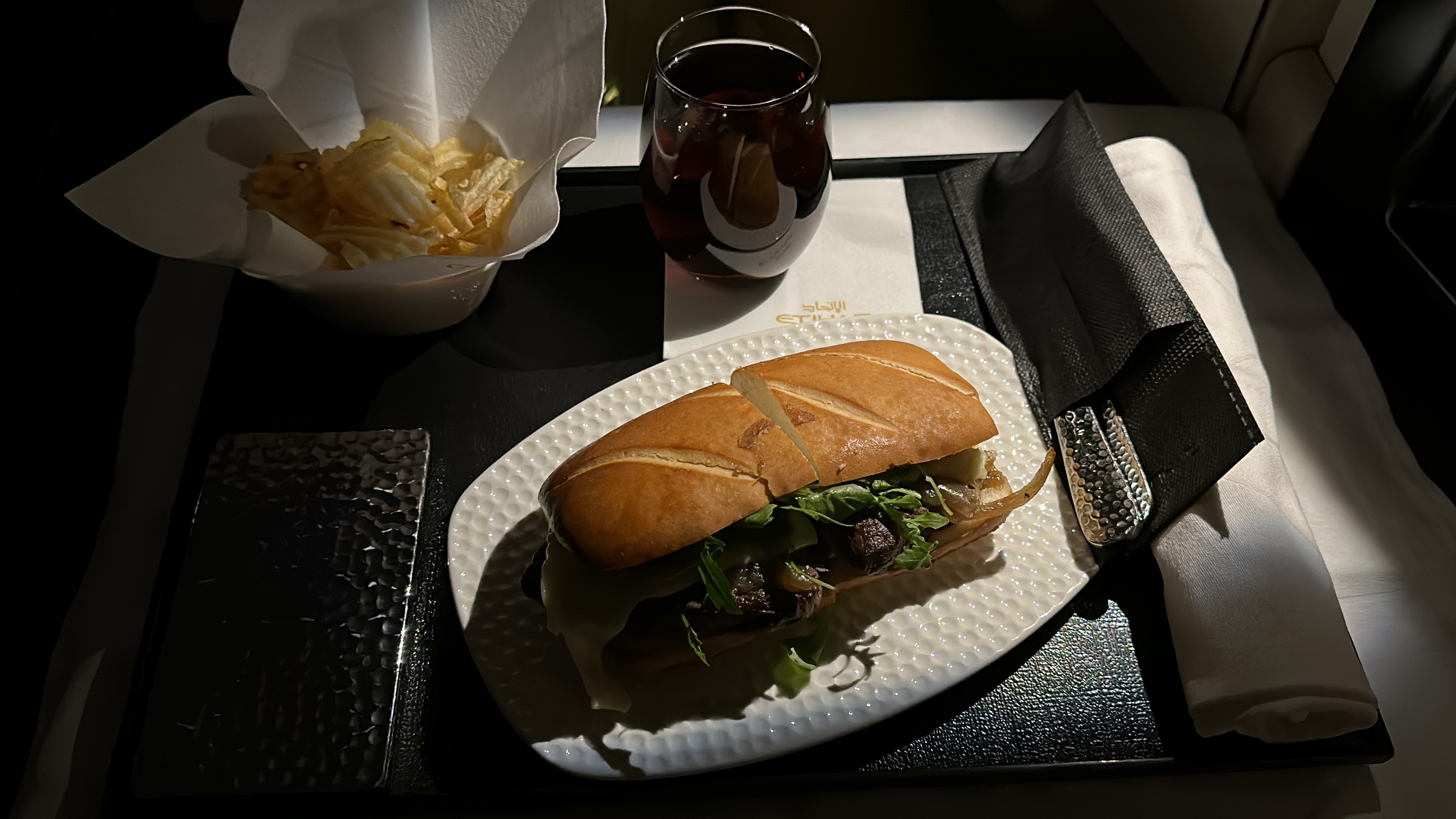The crew on this flight provided an impressive level of service, particularly the flight attendant assigned to our aisle. They were attentive and eager to please, offering pre-departure beverages and checking on us throughout the flight to ensure we had everything we needed. Despite the late night flight, the crew remained cheerful and professional, making the journey all the more enjoyable. The meal service was also noteworthy, with the Etihad steak sandwich being a standout dish, as always. Even the lighter options, like the pastrami wrap, were delicious and satisfying.