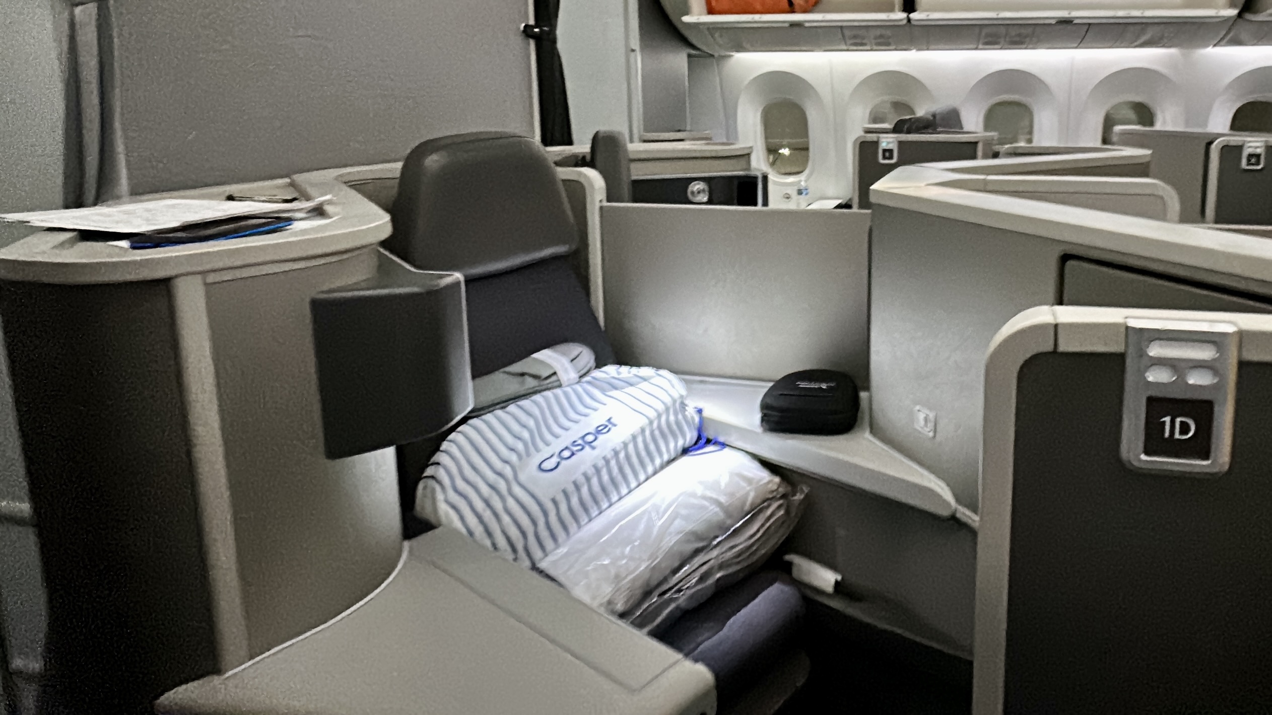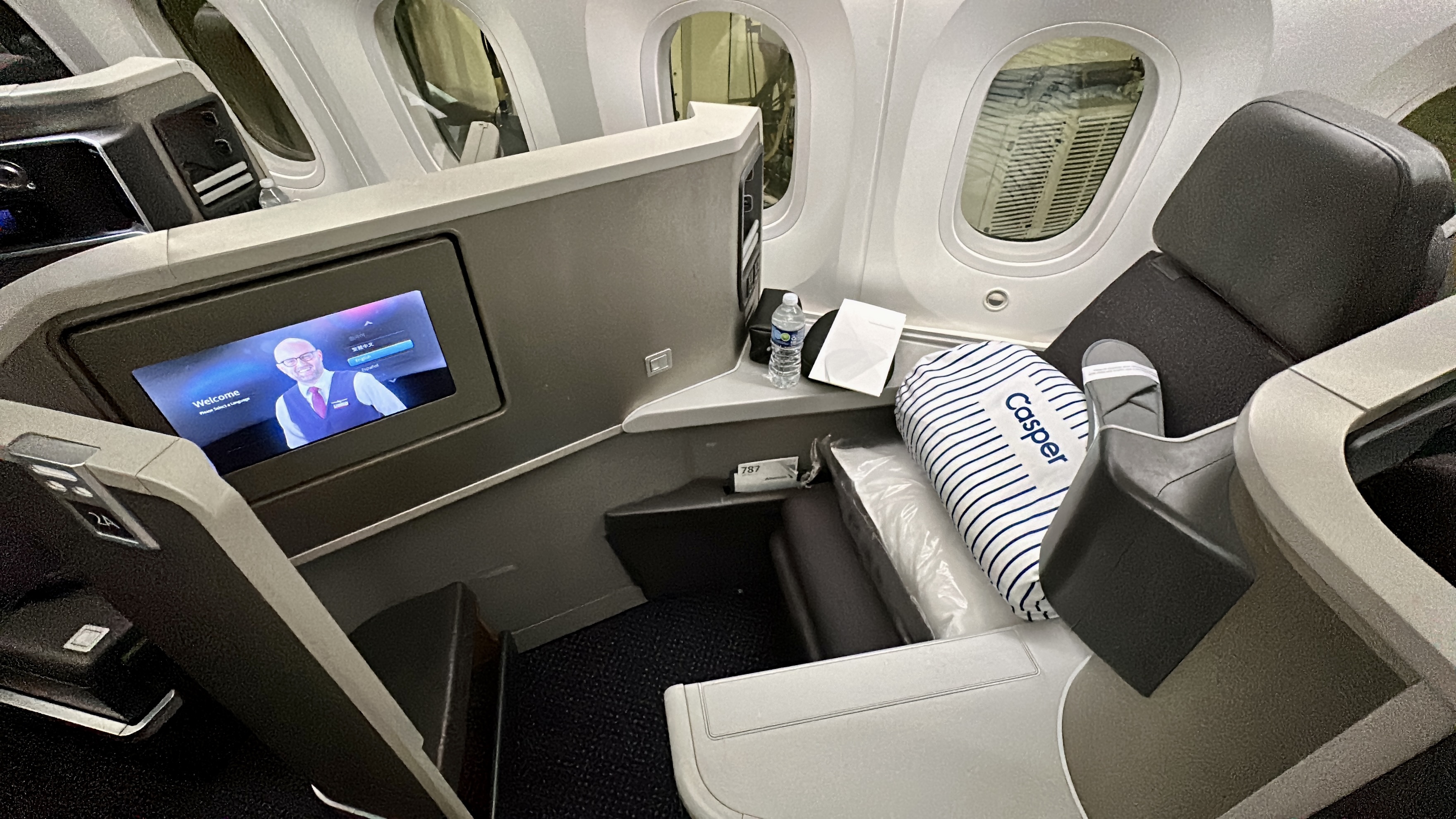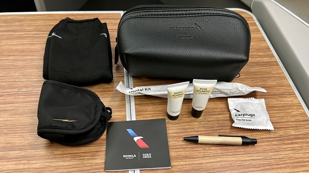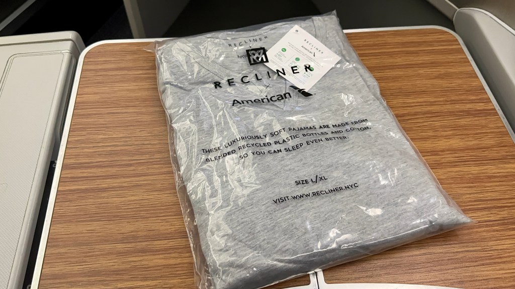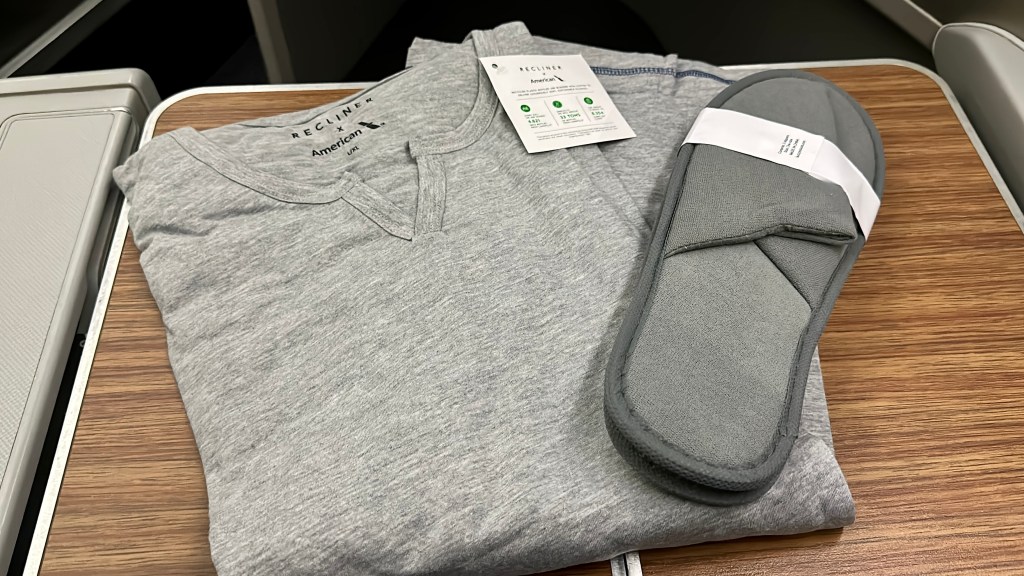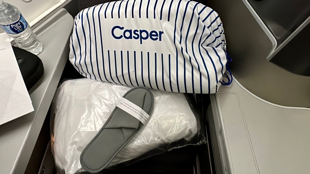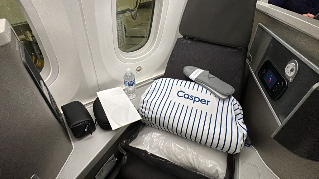 Business Class Amenities – AA provides an impressive range of amenities for its business class passengers. The Shinola-branded pouch amenity kit, Bang and Olufsen noise-canceling headphones, and bottled water are standard offerings. The Casper mattress pad in addition to the full-size pillow and duvet set add an extra level of comfort to the flight. Additionally, business class passengers receive slippers and pajamas, which are thoughtful additions that enhance the business class experience on this route.