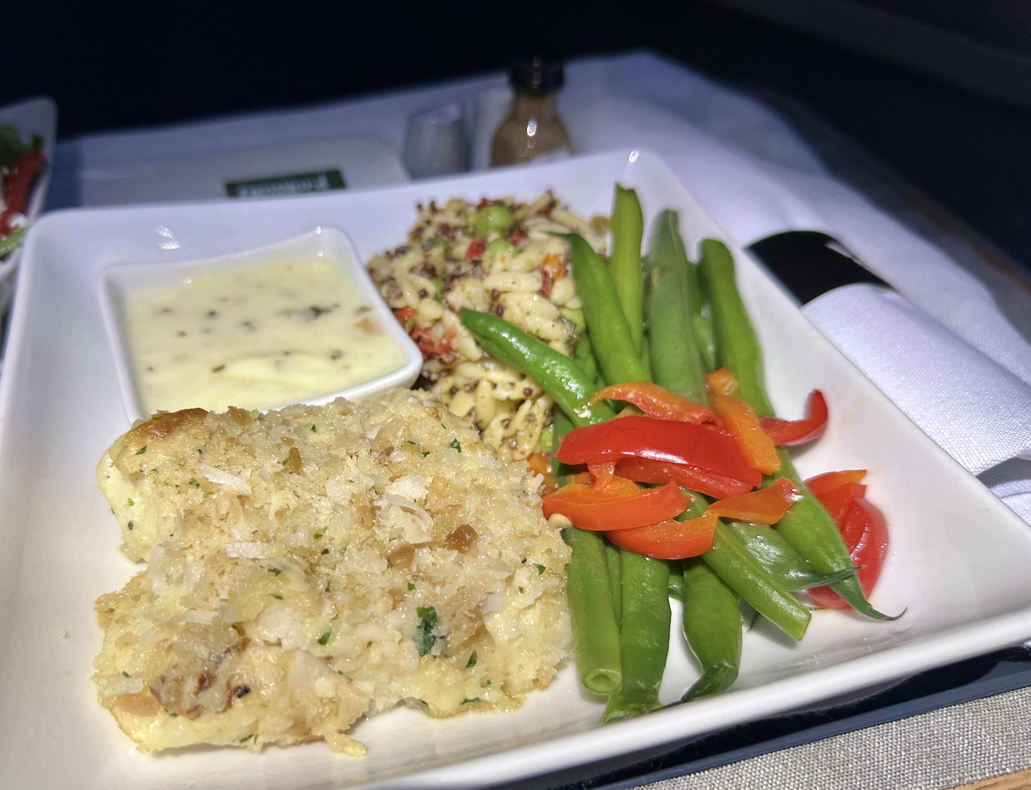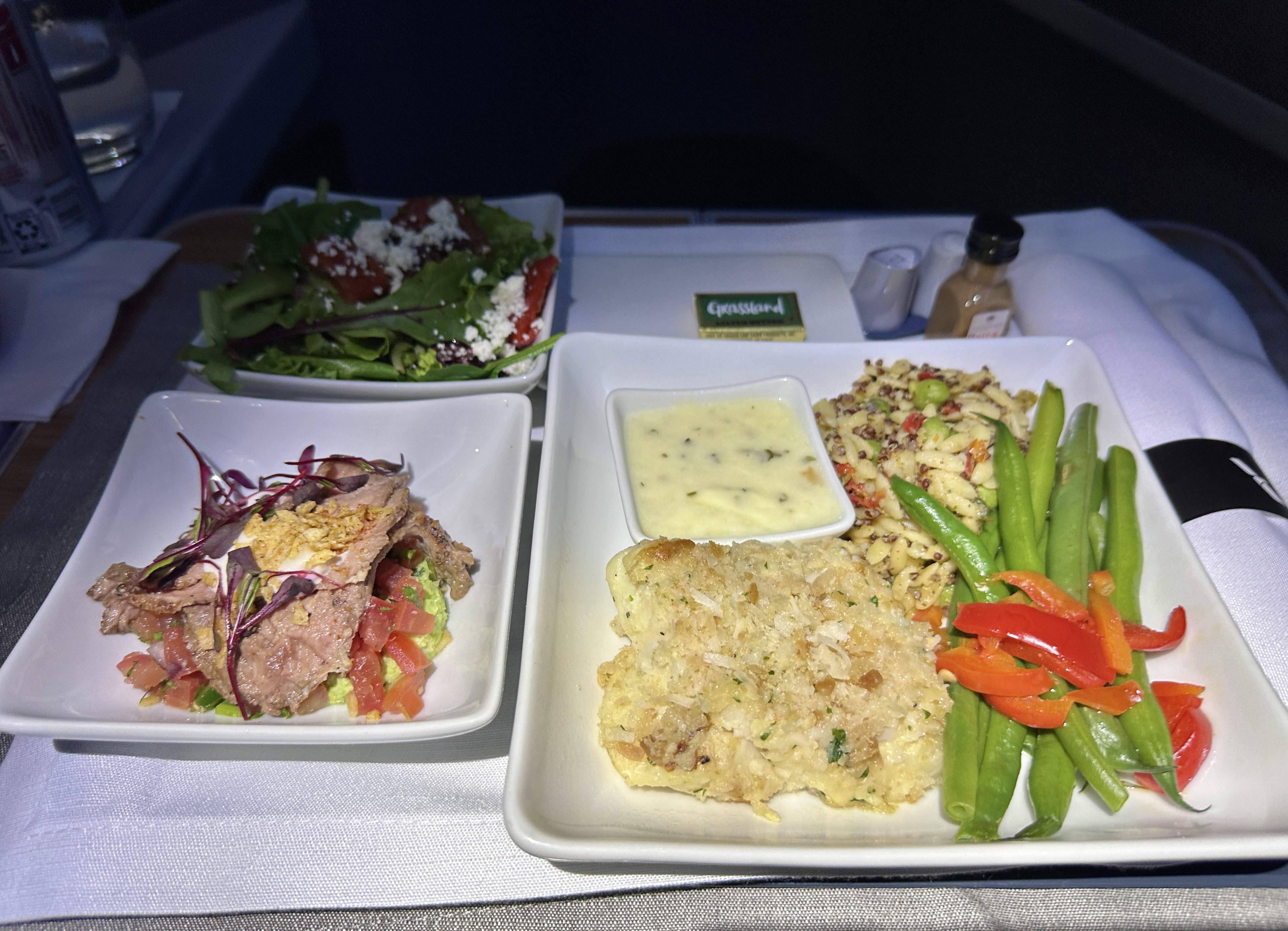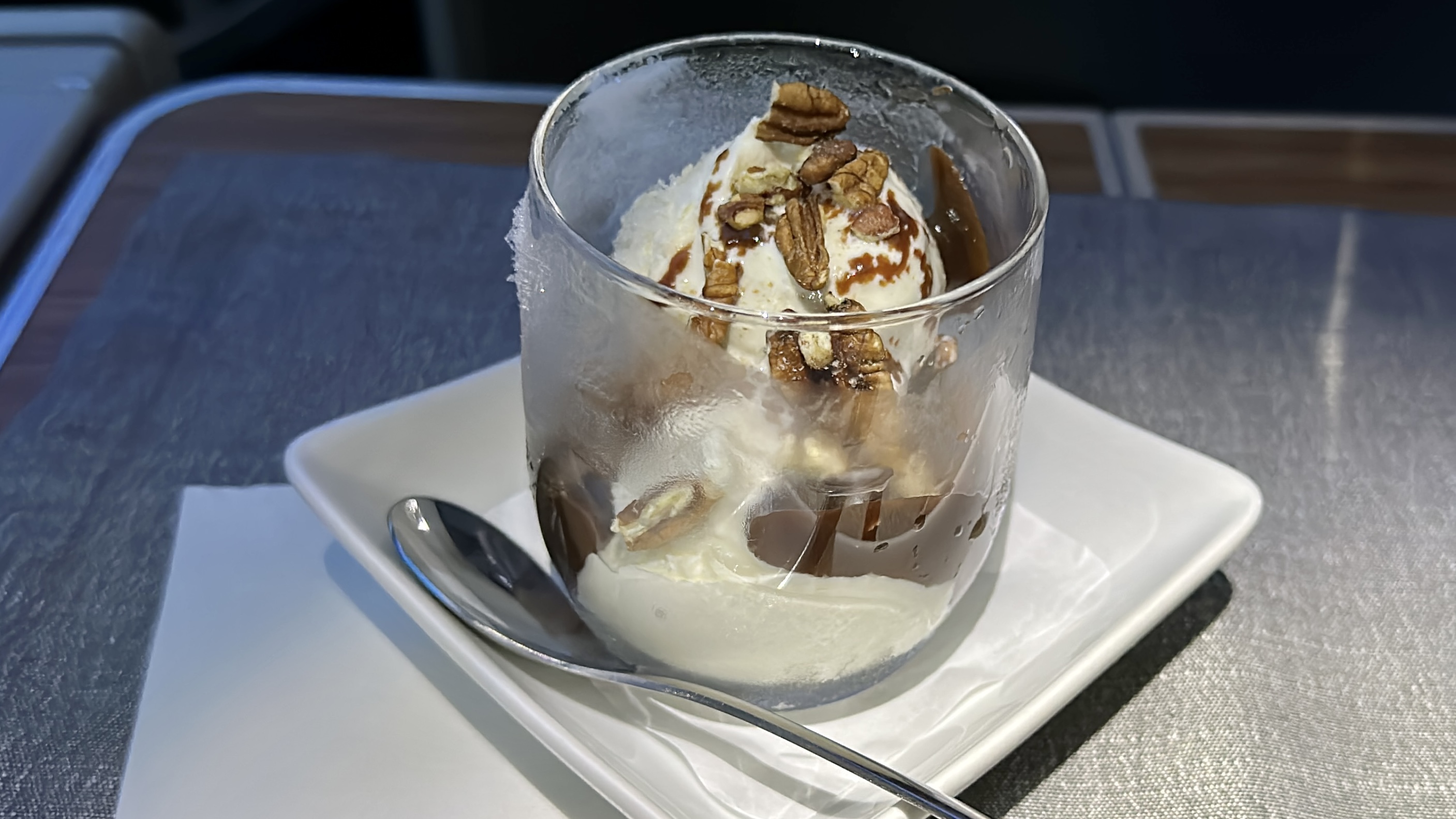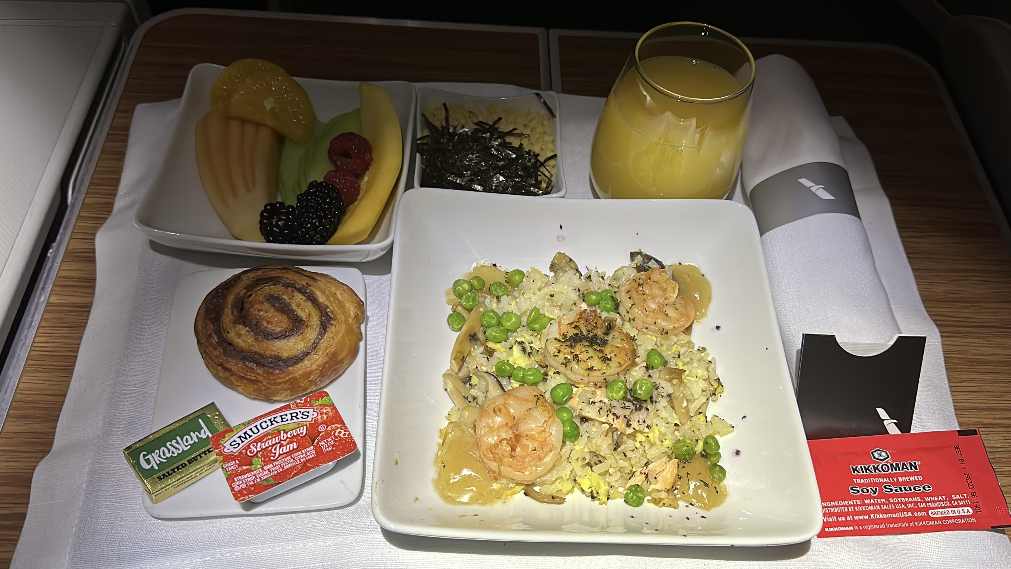 The catering – As previously mentioned, the catering on our AA flight out of LAX was generally good. The Japanese meal I ordered after takeoff was excellent, while my companion’s macadamia crusted sea bass was satisfactory. For the pre-arrival meal, the shrimp fried rice was delectable, though the cheese omelet was a bit dry and bland. However, the ice cream sundae for dessert certainly did not disappoint . The crew also thoughtfully provided a mid-flight snack basket for a quick bite, which was a nice touch.