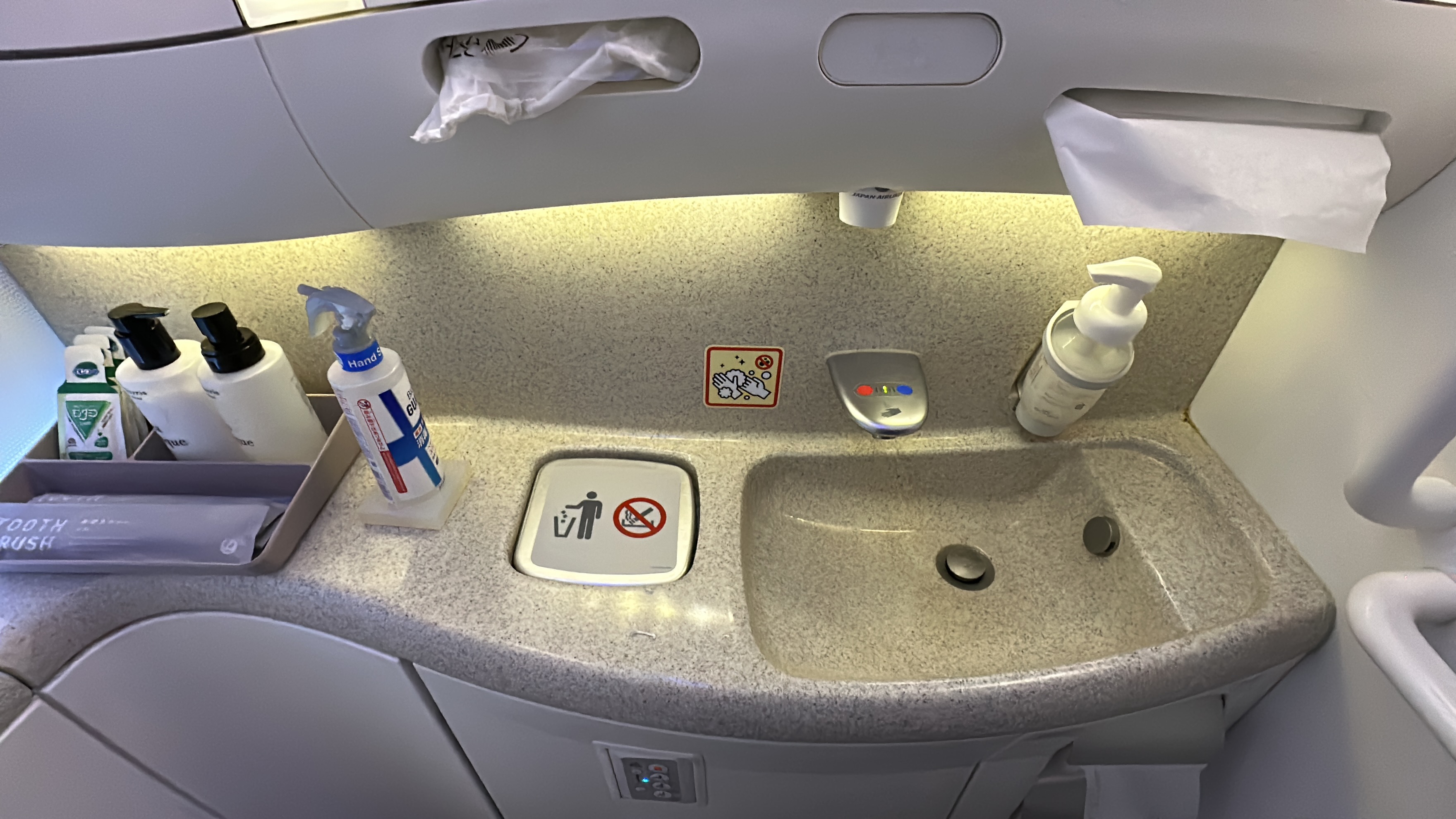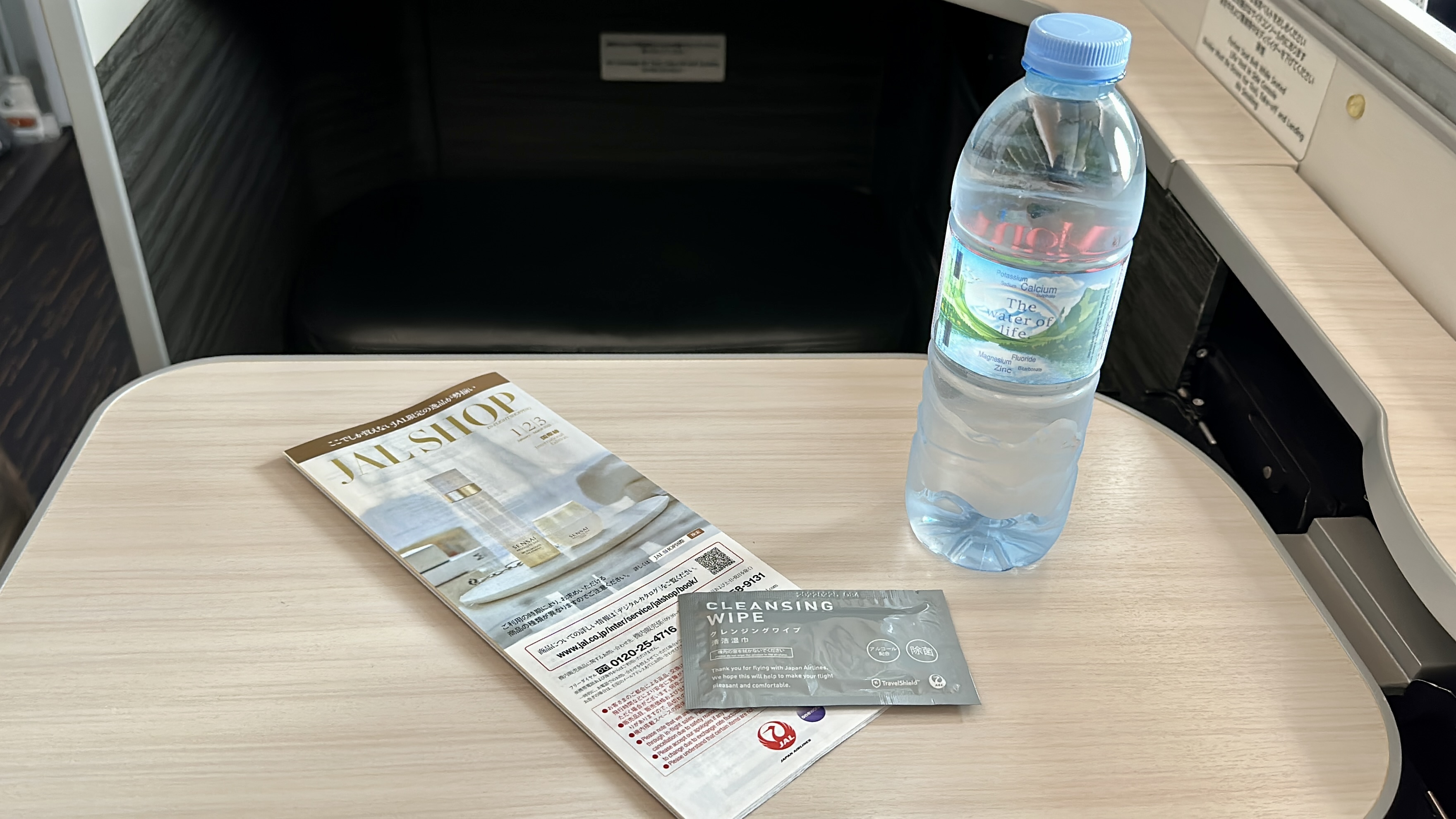 The Amenities – As this was a medium-haul flight, the amenities provided at our seats were somewhat limited. Passengers were provided with slippers, a pillow and duvet set, bottled water, noise-canceling headphones, and a JAL mini amenity kit. While these amenities were adequate for the length of the flight, they were relatively basic compared to what other airlines may offer on longer journeys. The business class lavatories, however, featured a toto bidet washlet as well as some toiletries.