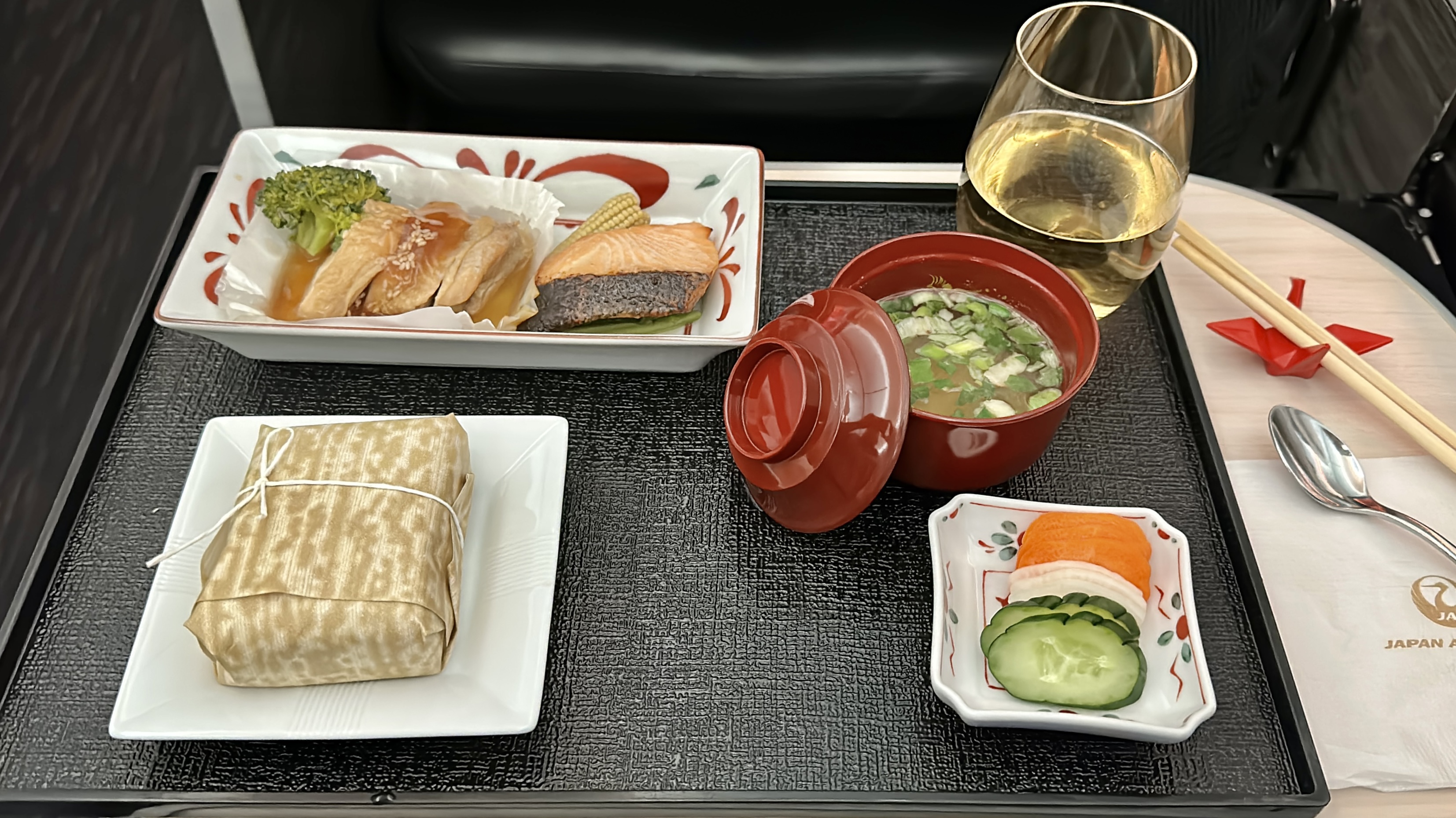 The Catering – When it comes to catering in business class, Japan Airlines never disappoints. On this flight, I had the pleasure of trying the Japanese Meal, which began with a delightful assortment of appetizers followed by a main course of simmered chicken and saikyo style salmon served with rice, pickles, and miso soup. The meal was not only delicious but beautifully presented as well. My companion opted for the western meal, which was equally impressive, starting with an hors d’oeuvres plate accompanied by bread service, followed by a grilled sea bass entrée. We concluded our meal with a matcha mousse, which was a sweet and satisfying way to wrap up our dining experience. Overall, the catering on this flight was exceptional.