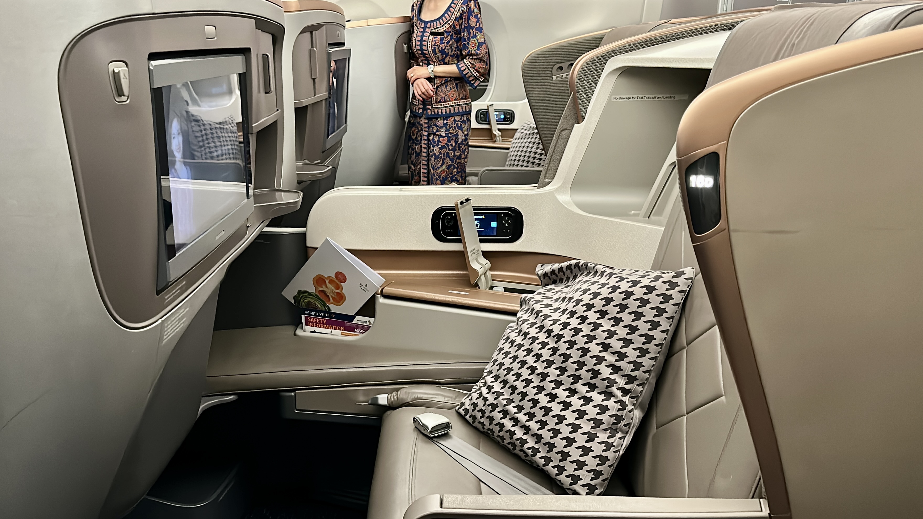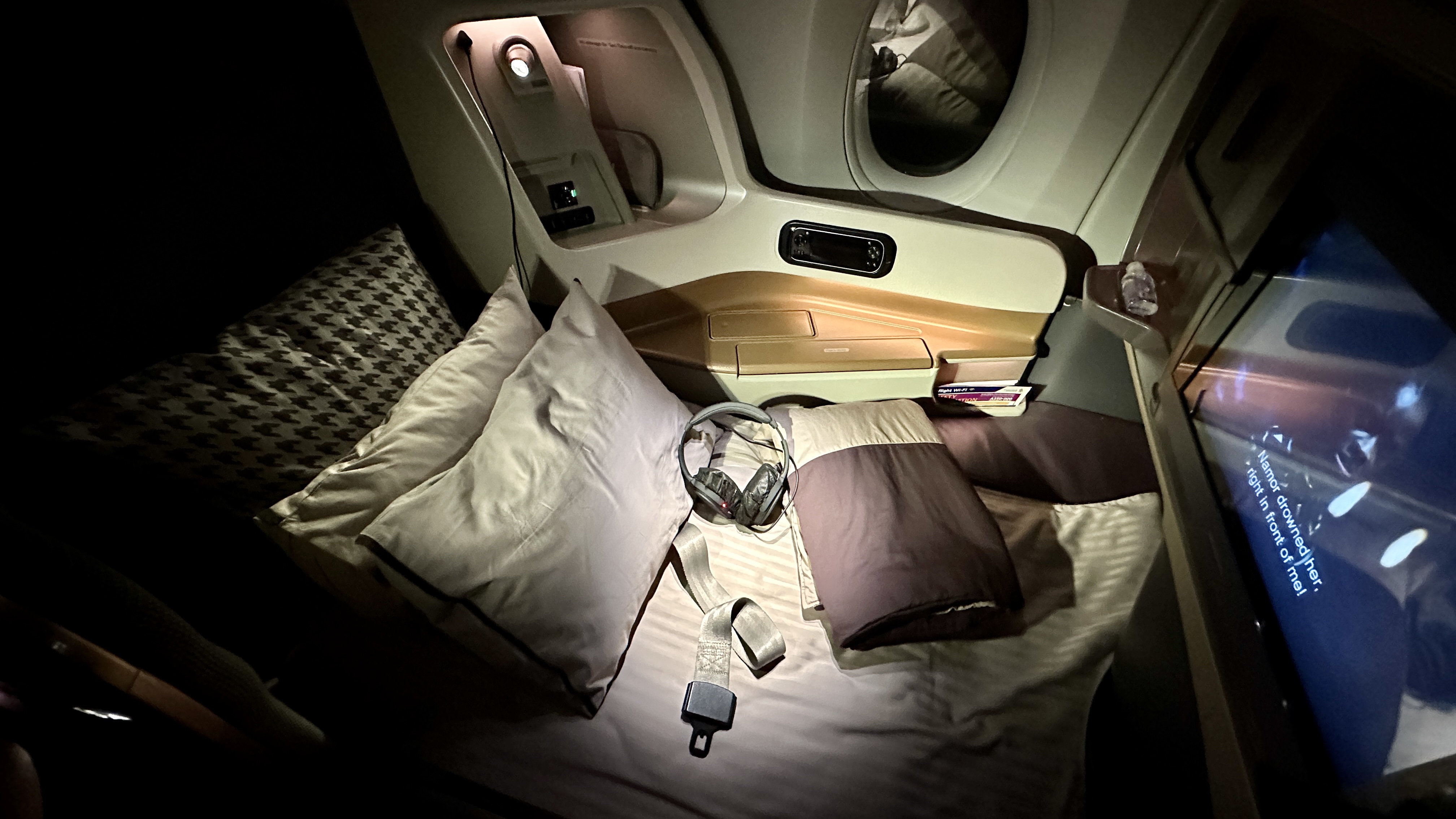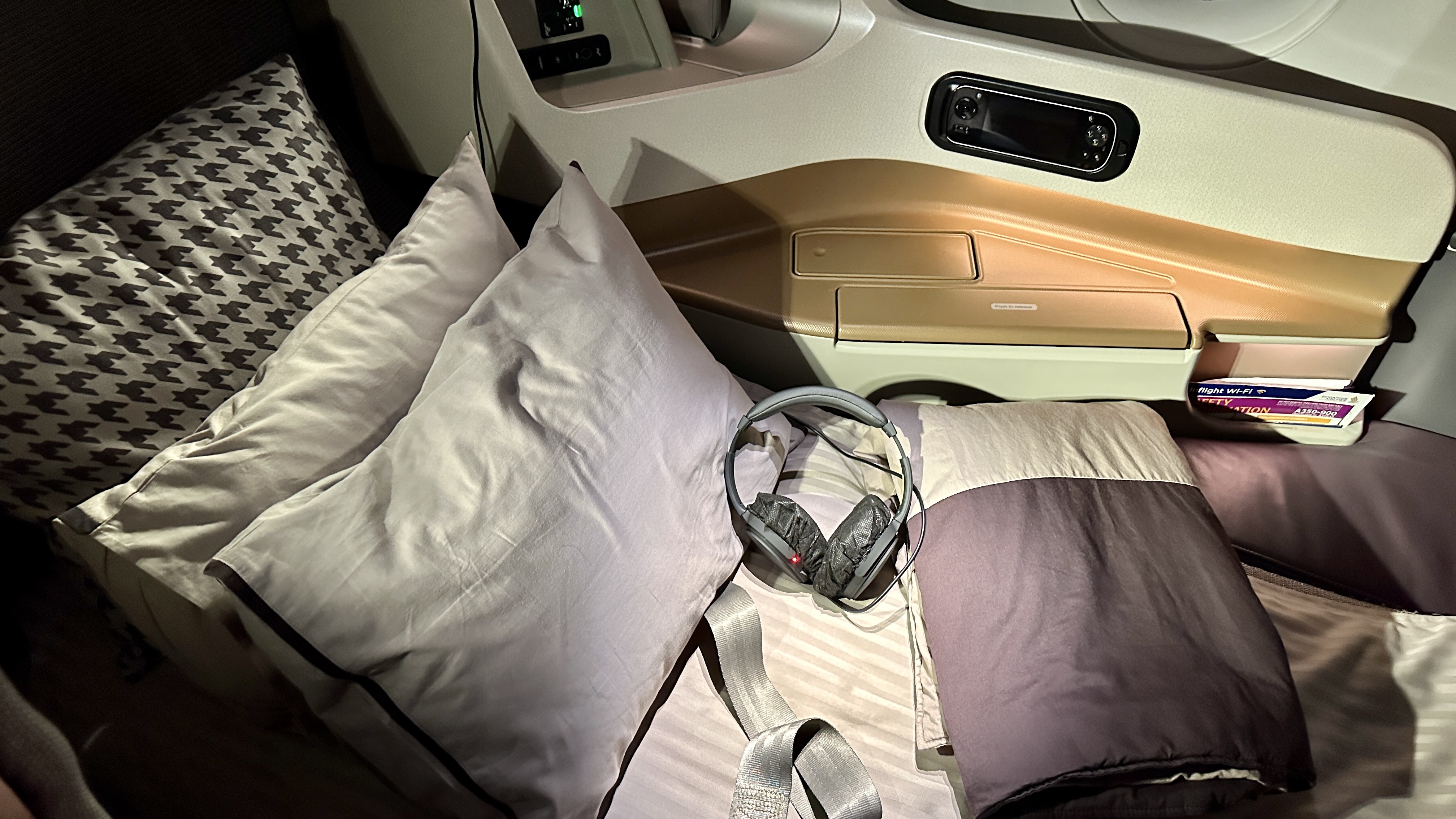 The Seat – The business class seat on SQ’s A350-900ULR is impressively wide and comfortable for sitting, lounging, and dining. However, I found the seat a little cumbersome as it requires getting up to convert it into a bed. Additionally, the seat pitch is a bit tight, so lying down diagonally is necessary for your feet to fit comfortably in the foot well.