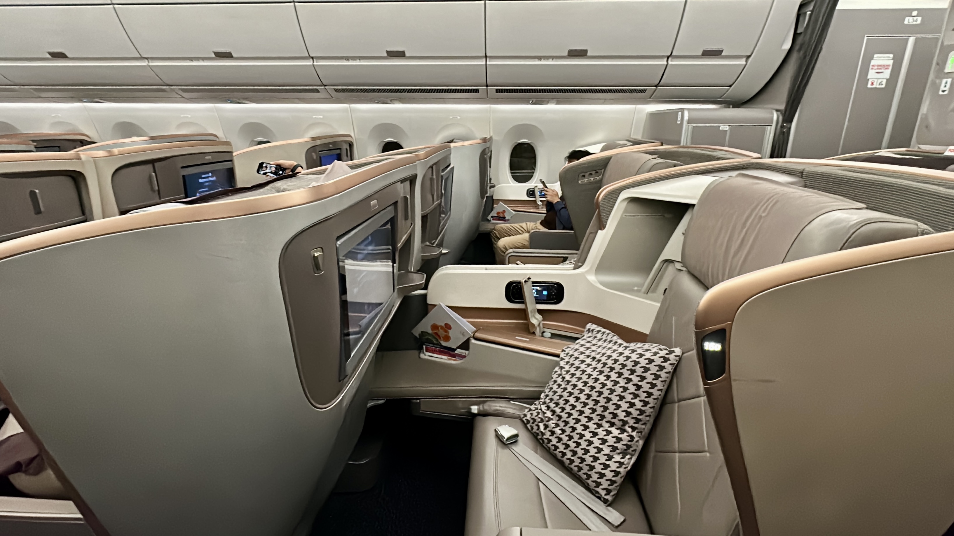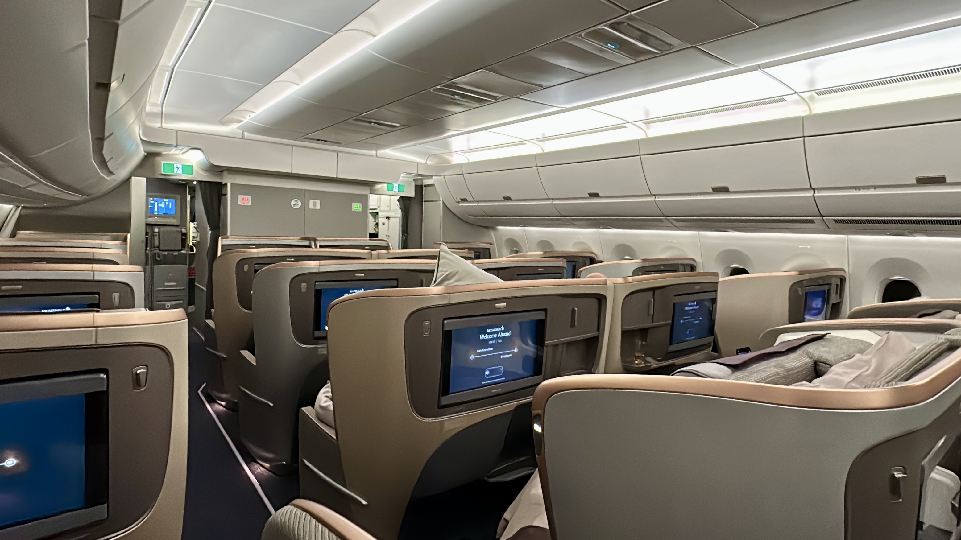 We were thrilled to have the opportunity to fly business class on one of Singapore Airlines’ (SQ) ultra long haul routes. SQ is widely recognized as one of the top airlines in the industry, and we were curious to see how their business class experience compared to other carriers. Overall, our experience was positive, although not flawless. The A350-900ULR planes that SQ uses for long haul flights have a 2-class configuration, with 67 business class and 94 premium economy seats; there is no economy class cabin on this plane. The business class cabin is divided into a forward and aft section, featuring SQ’s proprietary seats arranged in a 1-2-1 configuration. While the seats are comfortable for dining and lounging, they are a bit quirky, requiring passengers to get up to convert them into a bed.