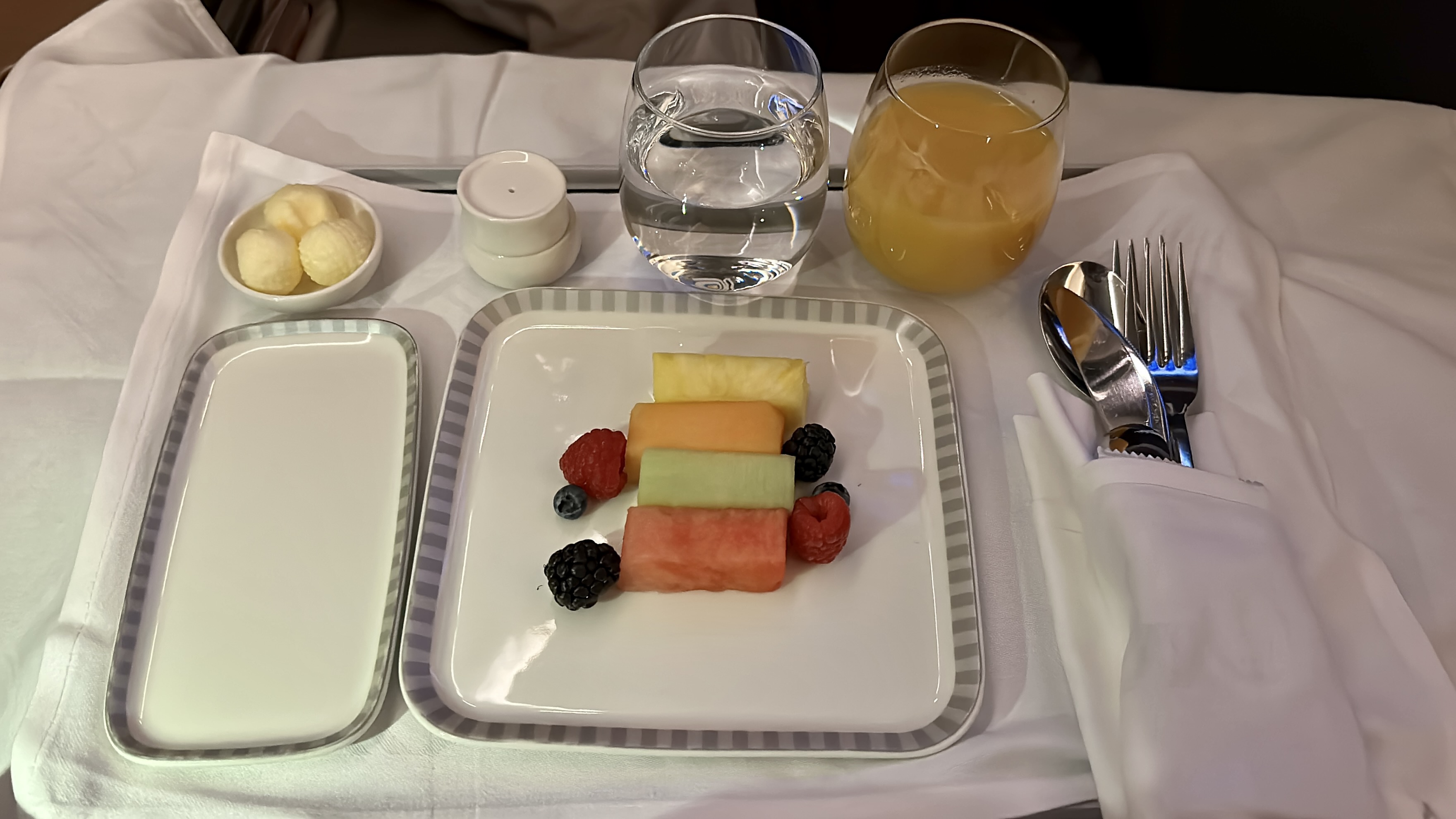 The in-flight service – Our in-flight experience on this recent flight was positive overall. The crew displayed attentiveness to our needs during meal service and even personalized their service by addressing us by name. Although there were some moments where their demeanor seemed robotic, it did not diminish the overall quality of their service. Moreover, the crew was responsive and mindful, checking in with us regularly to ensure that all our needs were met including a pre-departure beverage and turndown service.