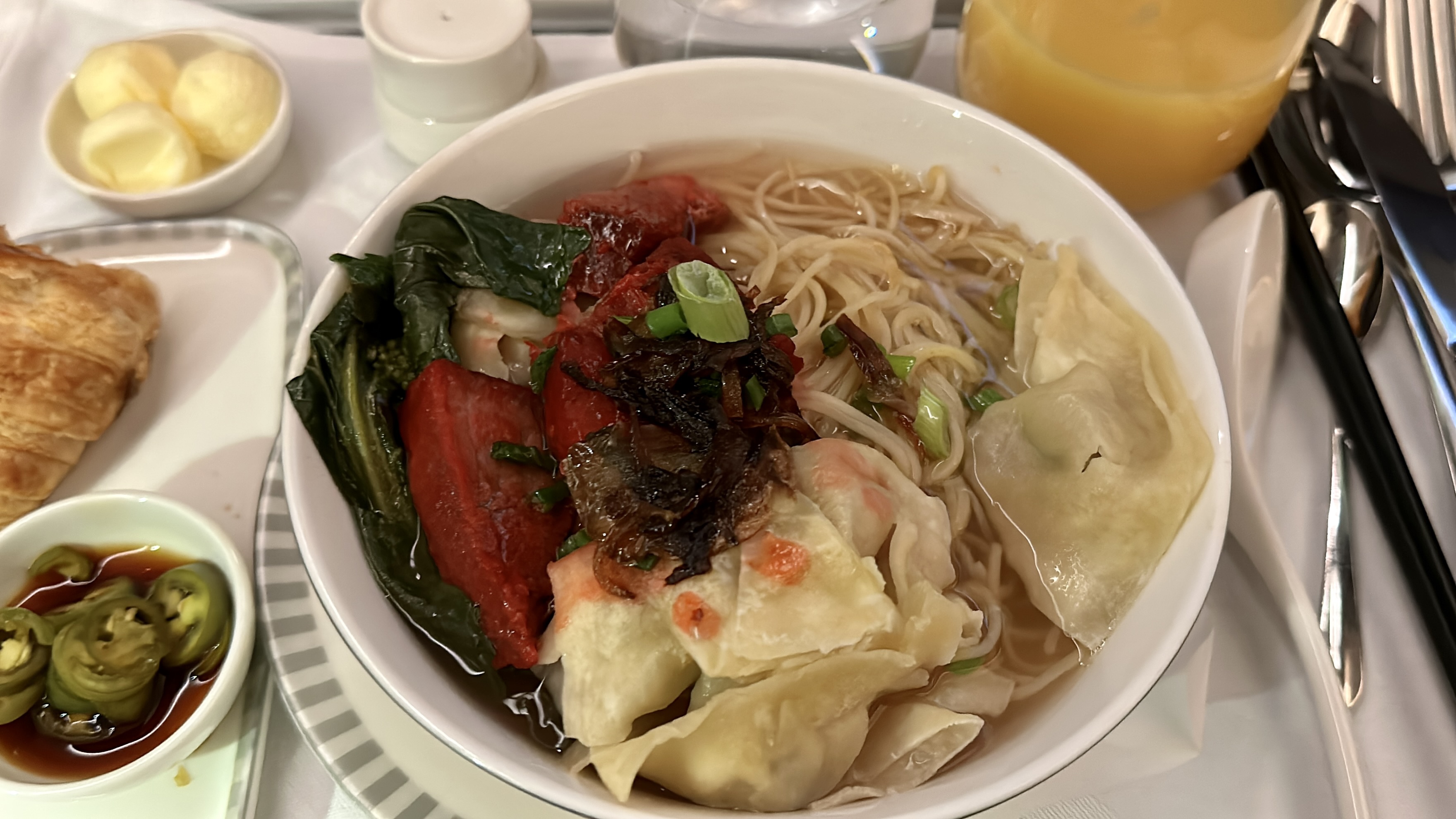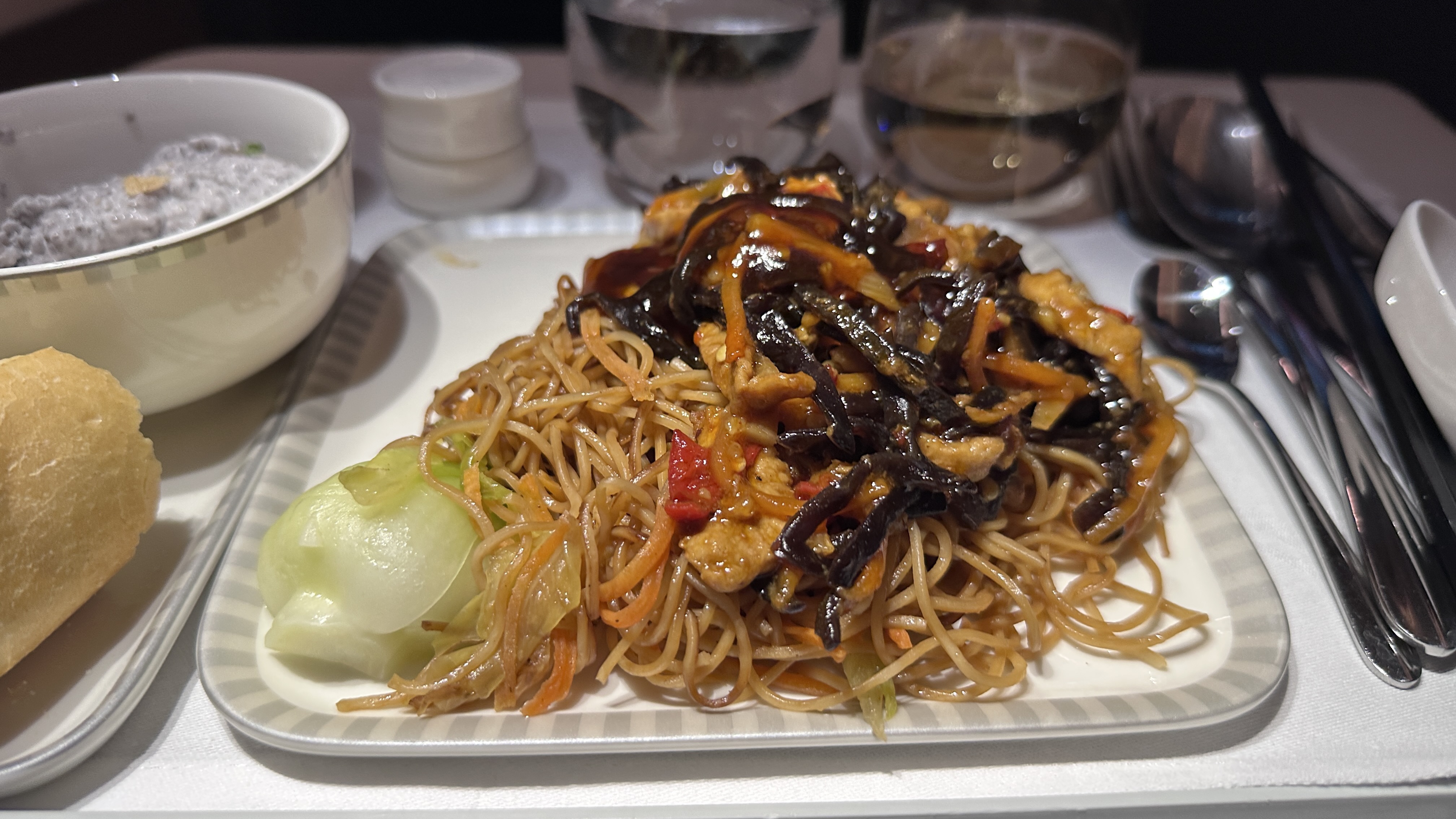 The Catering – The catering on this flight was satisfactory, although it didn’t quite measure up to the high standards set by airlines like JAL or Qatar. While there was a wide variety of beverages available, the food selection was rather limited. Unfortunately, the beef short rib main dish I ordered for dinner was overly salty and my companion’s baked lobster was overcooked and tough. However, the wonton noodle soup and egg noodles with Yu Xiang Pork that we ordered for breakfast were delicious. Overall, while the catering didn’t exceed our expectations, it was still decent and provided a good dining experience.