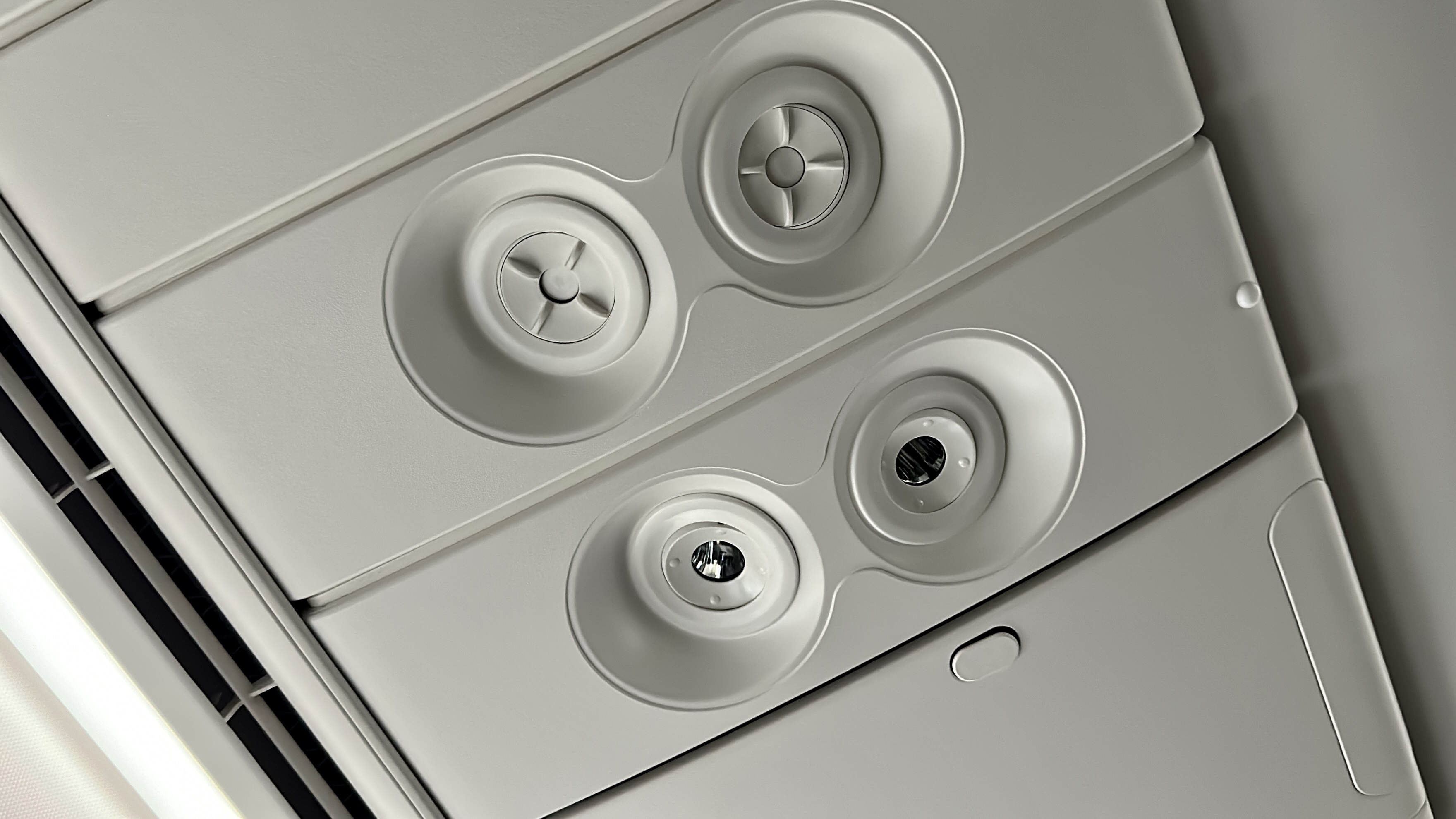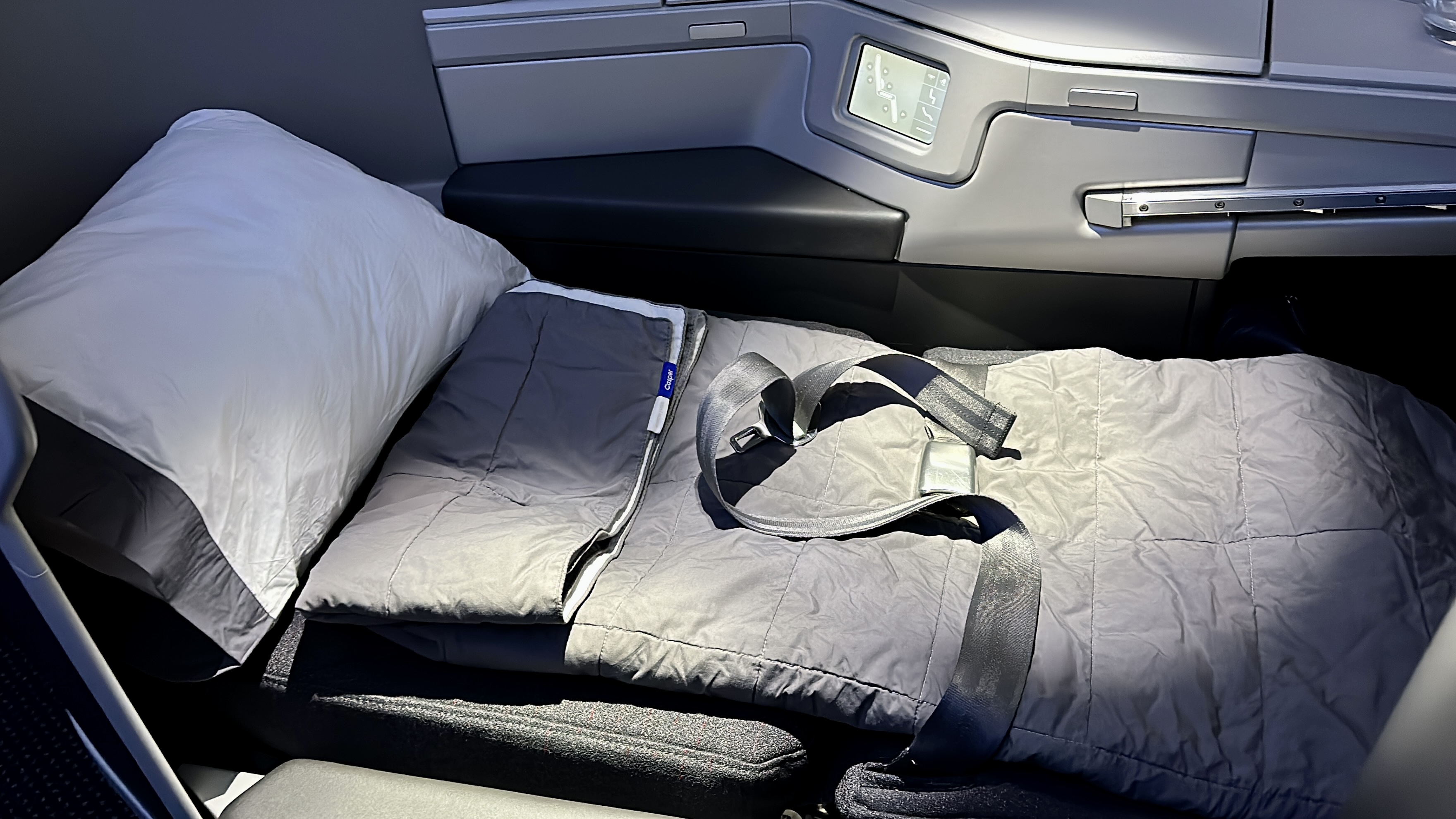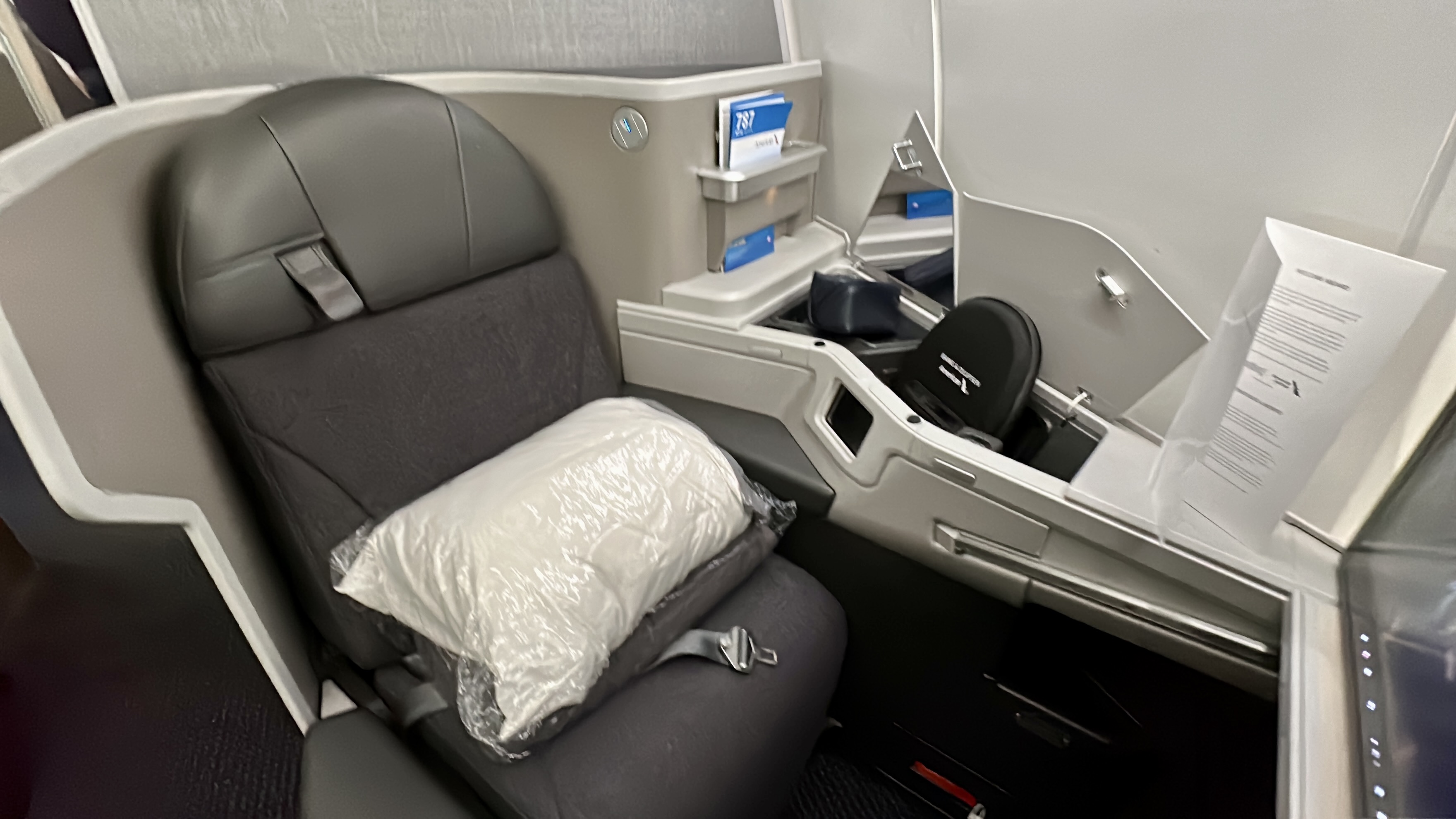 The Seats – The updated Collins Aerospace Super Diamond Seats on this flight are easily one of my favorite business class seats. They are incredibly comfortable for sitting, lounging, and sleeping, and all the seat controls and storage spaces are within easy reach. I had previously experienced issues with other versions of these seats, where my knees would hit the pull-out table in bed mode, but this updated version has resolved that issue. The seat provided excellent comfort and support for laying down and sleeping throughout the flight. I was also delighted to find that personal air nozzles were available, which allowed me to remain cool and comfortable throughout the journey.