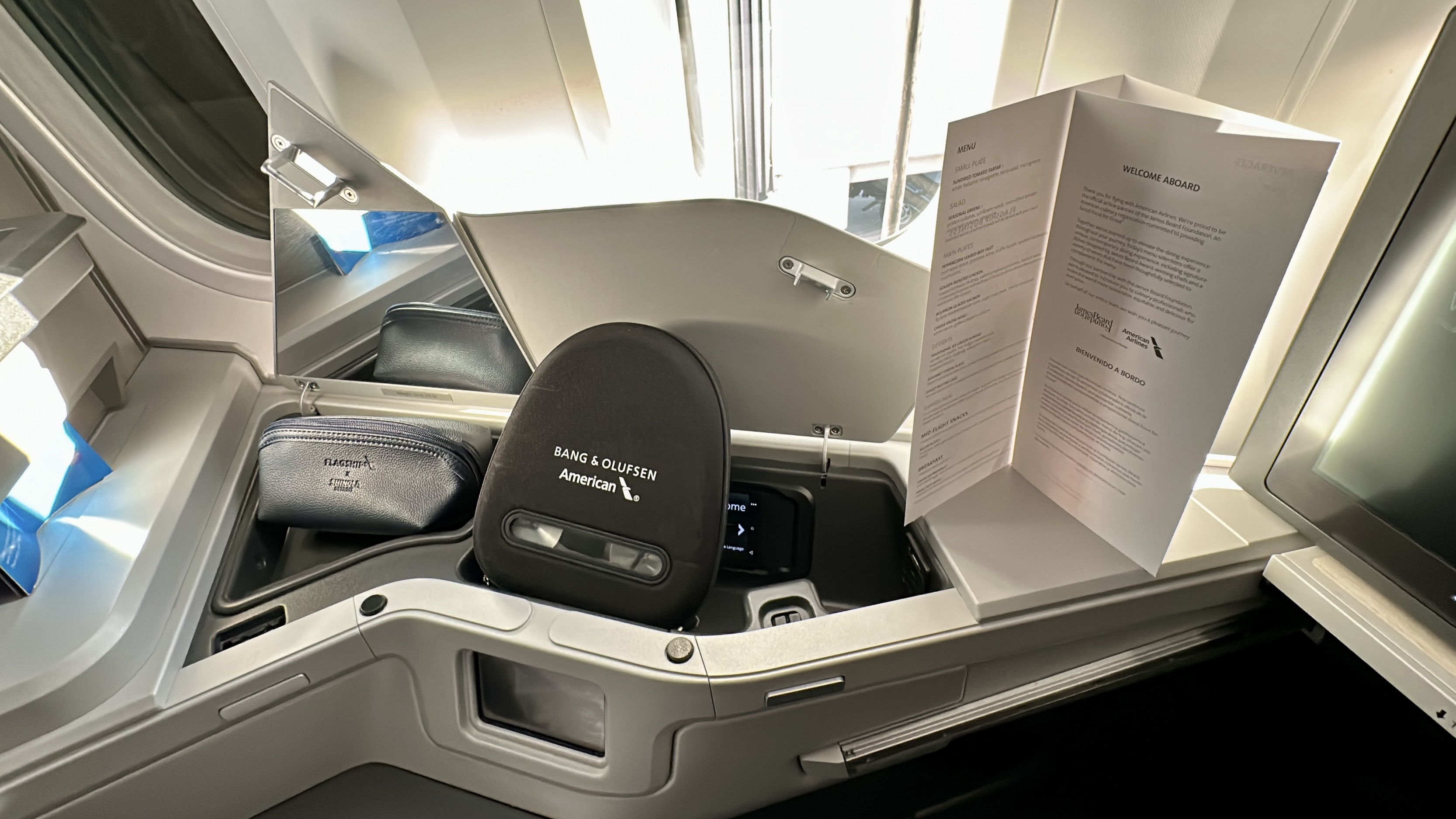 The Amenities – AA’s business class amenities are pretty standard. They provide passengers with a Shinola-branded pouch amenity kit, Bang and Olufsen noise-canceling headphones, a full-sized pillow and duvet set, and bottled water. However, it’s worth noting that they do not offer pajamas or mattress pads on this route.