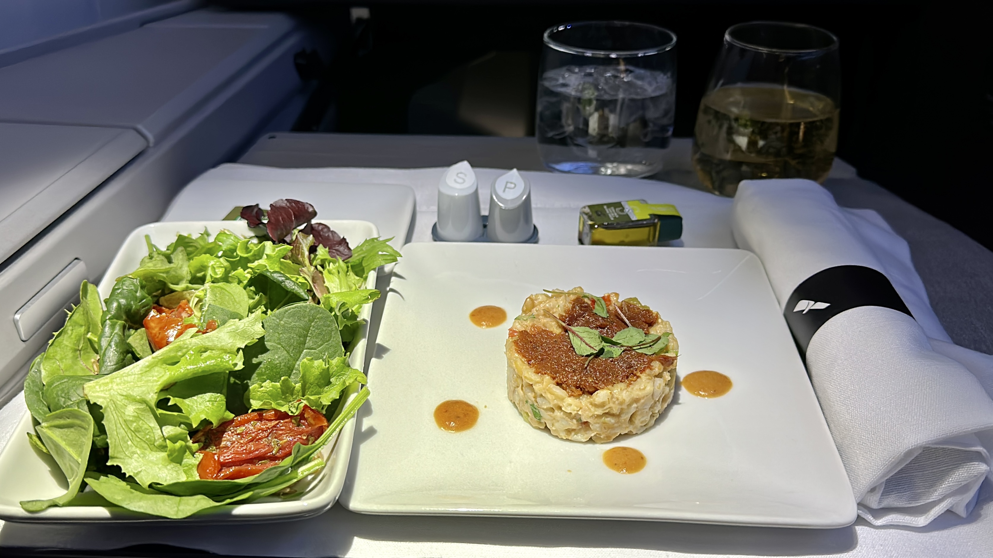 Our flight on one of American’s newest 787-8 Dreamliner, equipped with the updated Collins Super Diamond Business Class seats, was a stroke of luck. The seats reminded me of British Airways’ Club Suite, but without the sliding door. Throughout the flight, I found the seat to be comfortable for both lounging and sleeping. The in-flight service was excellent. The crew addressed us by name and was friendly, eager to please, and attentive. Before takeoff, we were offered pre-departure beverages and refills. However, the catering out of Dallas was somewhat of a mixed bag. Although my beef filet was cooked to perfection and delicious, my companion’s salmon was tough and overcooked. The business class amenities were standard, but I would have appreciated additional toiletries in the lavatories. Overall, I enjoyed a comfortable flight thanks to the seats and attentive service.