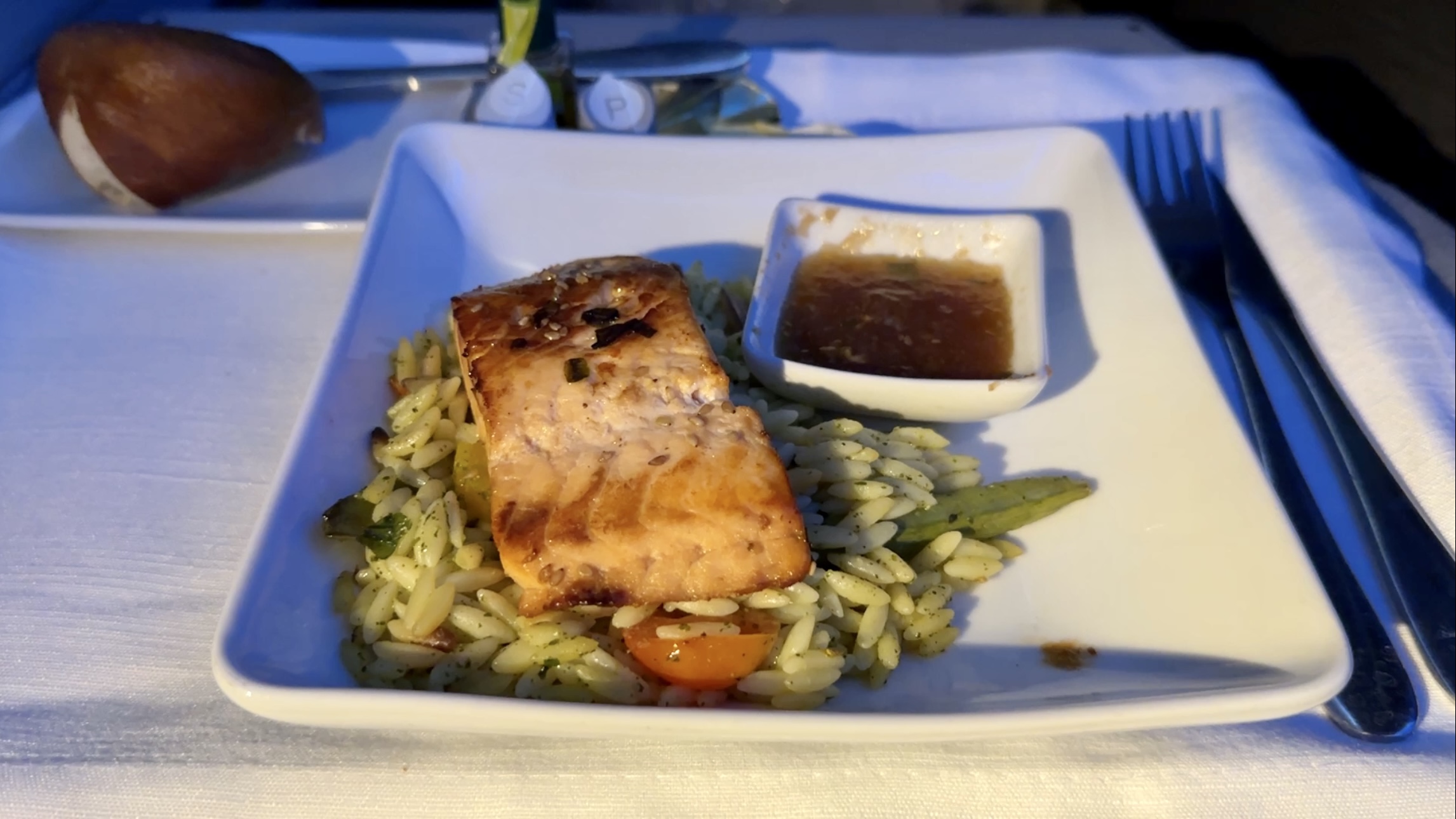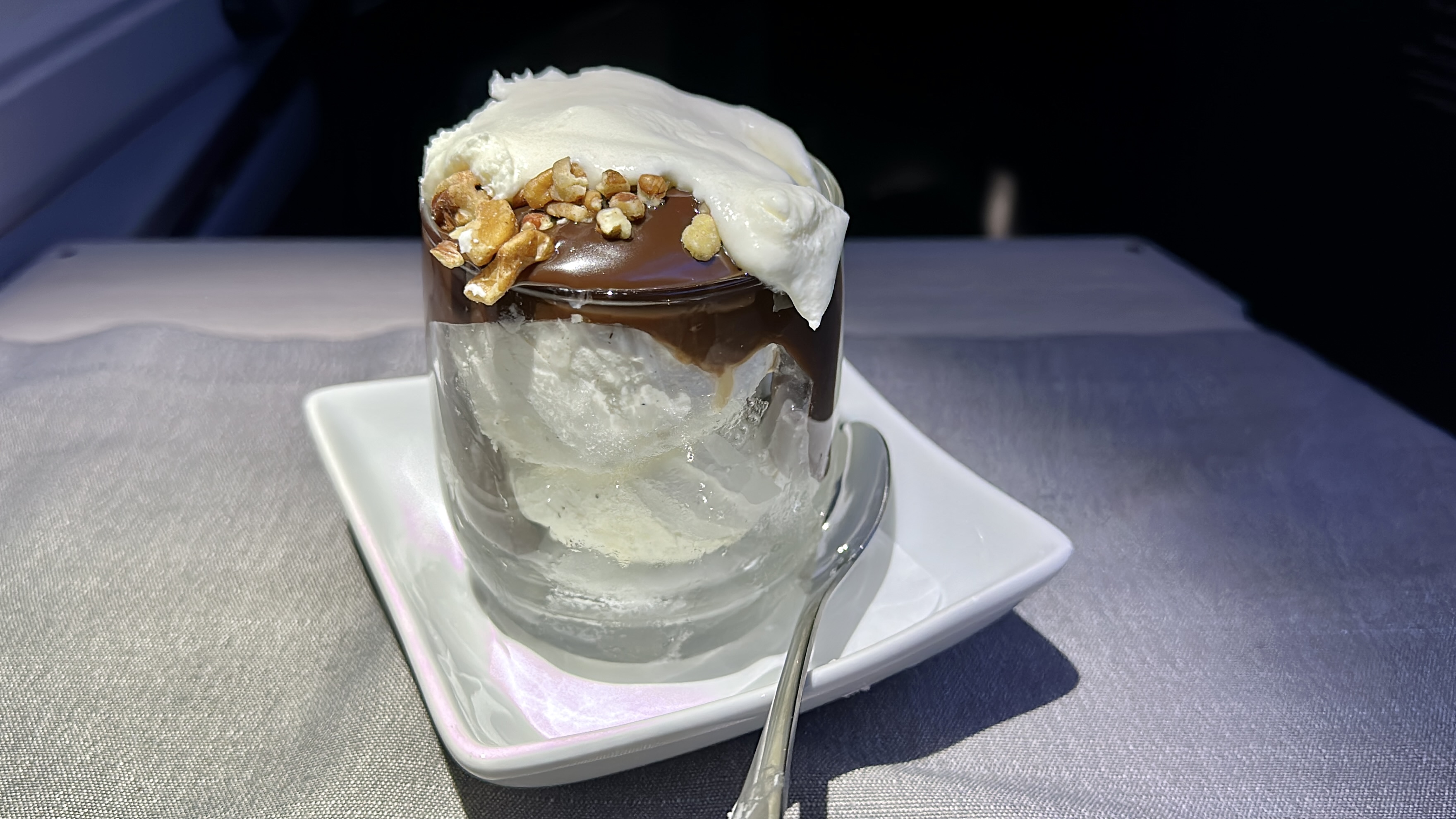 The Catering – The catering on our AA flight from DFW was satisfactory overall. The starter tray, which consisted of seasonal greens and sundried tomato tartar, was fresh and light, but lacked any standout flavors. The peppercorn crusted beef filet that I ordered was excellent and cooked to perfection, but unfortunately, the bourbon-glazed salmon dish my companion ordered was overcooked and tough. Dessert options were better, with the traditional fudge ice cream sundae being a highlight, while the gooey butter cake was a bit lackluster. For breakfast, we both opted for the Traditional American Breakfast with scrambled eggs and Canadian bacon. The eggs were well-prepared, but the Canadian bacon slices were rubbery and hard. As a consolation, the crew was kind enough to setup a walk-up snack bar in the front galley mid-flight, which was a thoughtful touch.