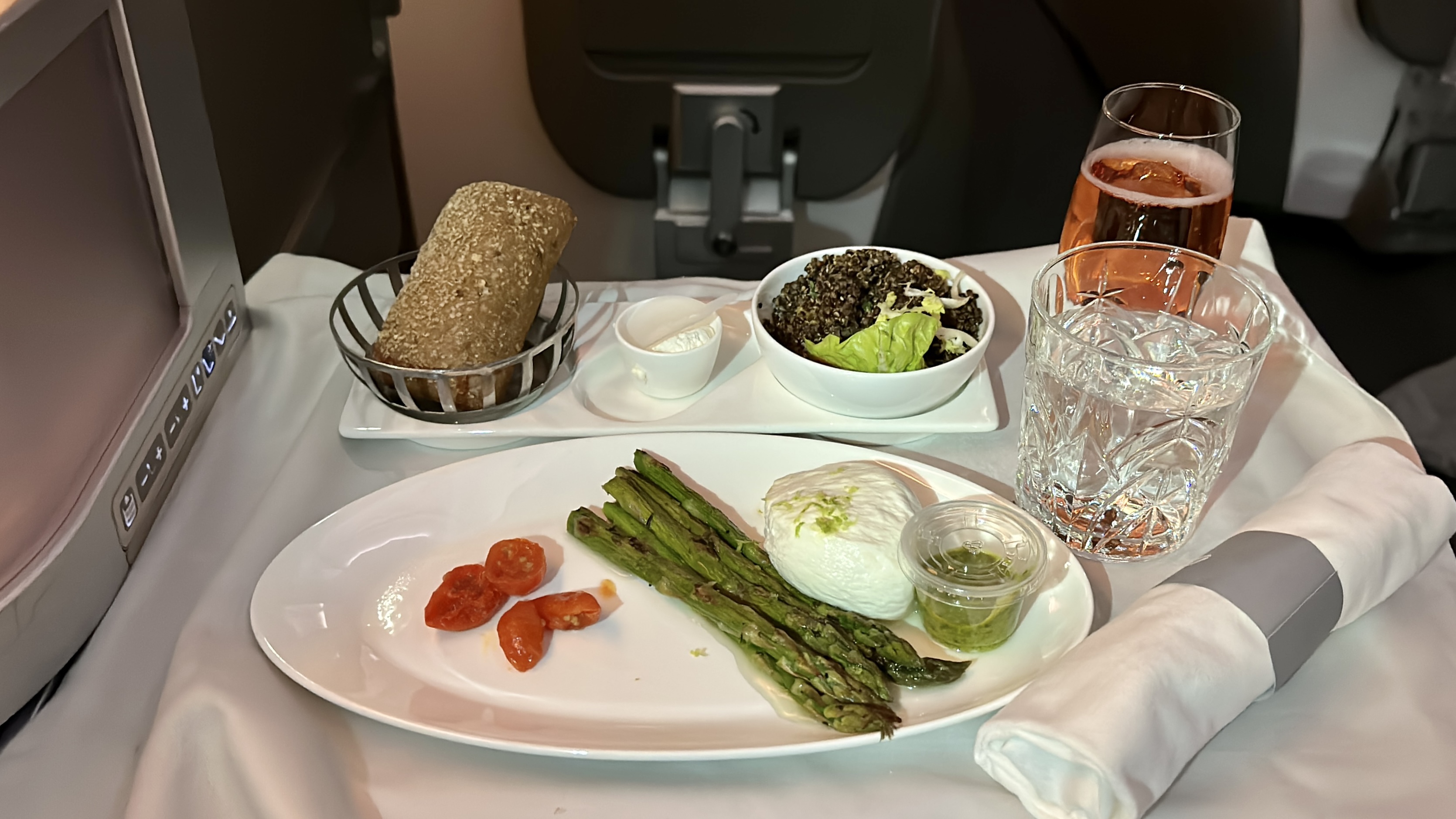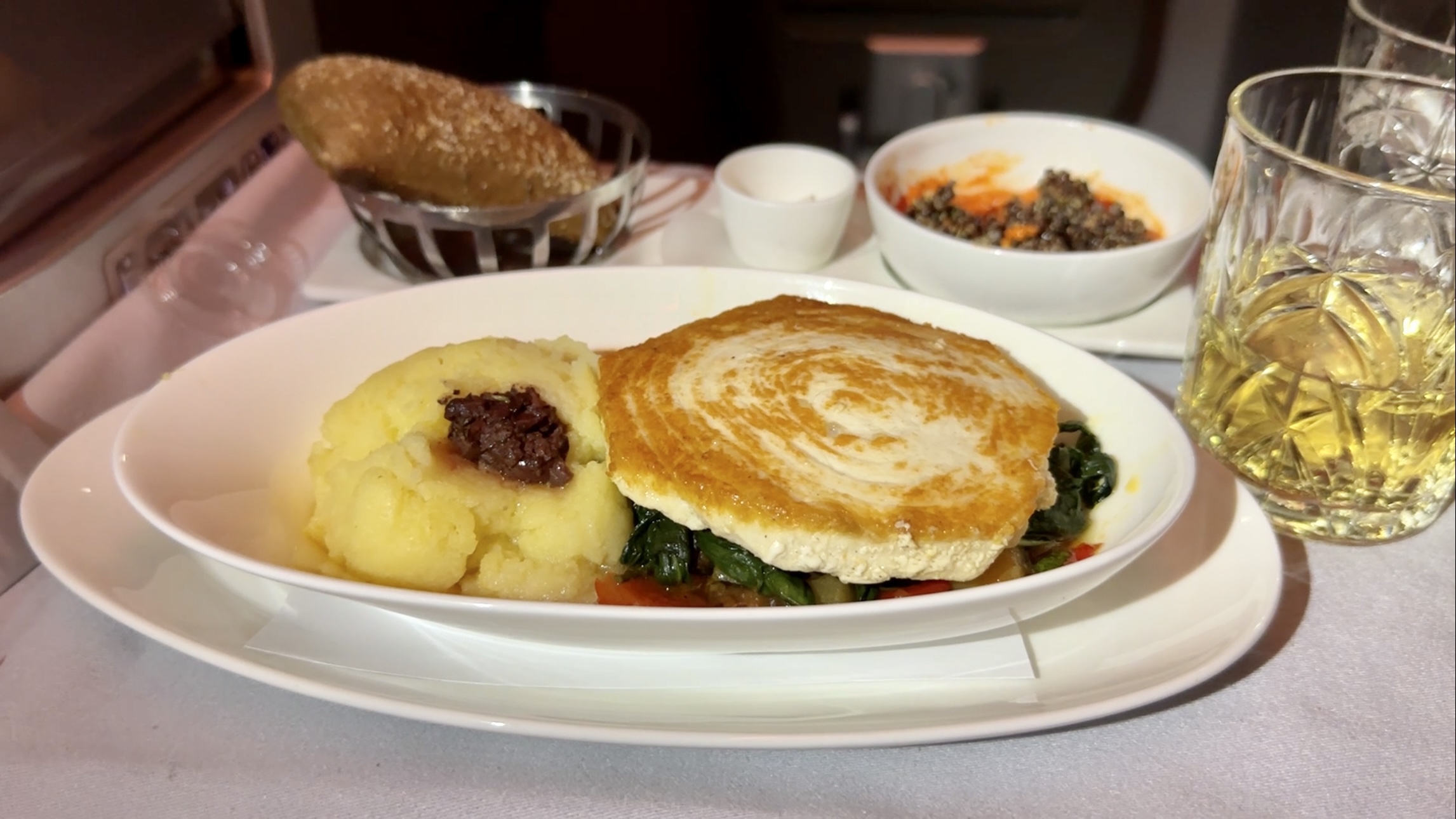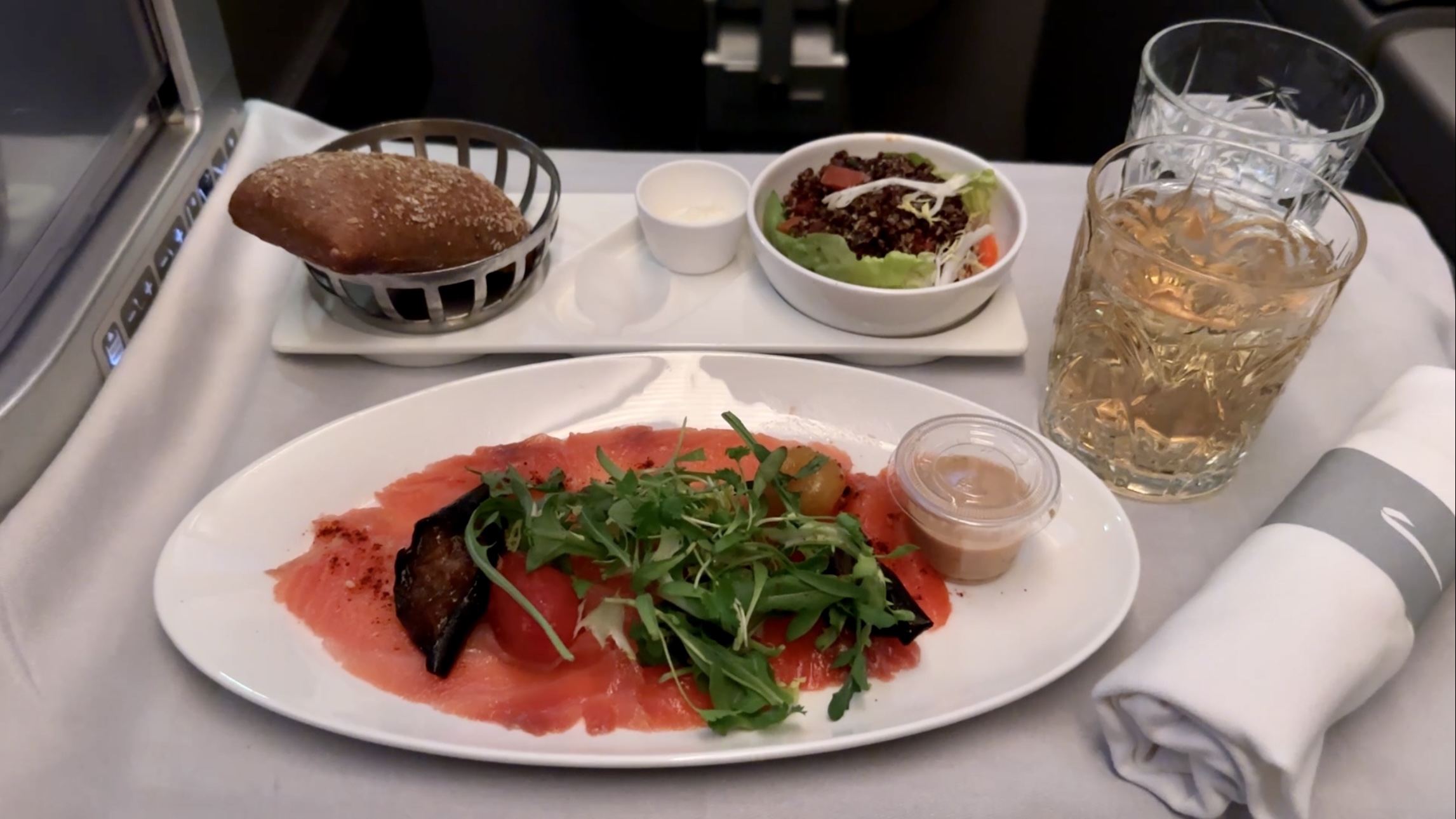 Flying in British Airways’ Club World Business Class is not an experience I particularly look forward to. The Club World seats are cramped and uncomfortable, particularly on a long-haul flight lasting over 10 hours. Unfortunately, BA still uses these outdated seats on their Airbus A380s, and they have no plans to replace them with the newer Club Suite seats. Although the crew working in business class were friendly and courteous, there was nothing particularly exceptional about the service on this flight. The first meal service was served in courses, which has improved from our previous long-haul flight with BA, where everything was served on a single tray. Due to the flight’s late departure, the usual after-takeoff bar service was absent. The in-flight meals, which were catered by DO&CO, were of high quality and consistent with our previous flights with BA.