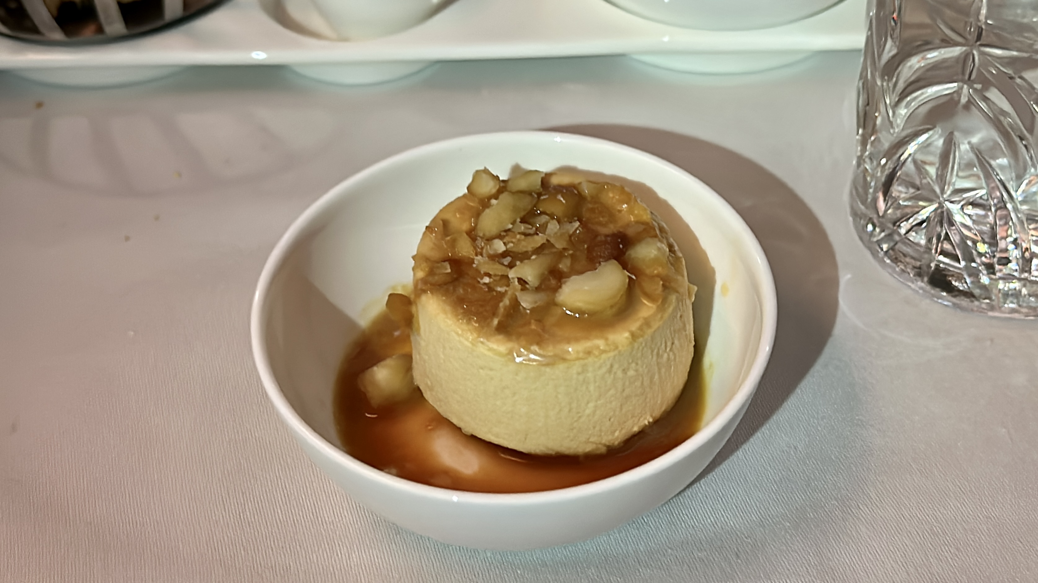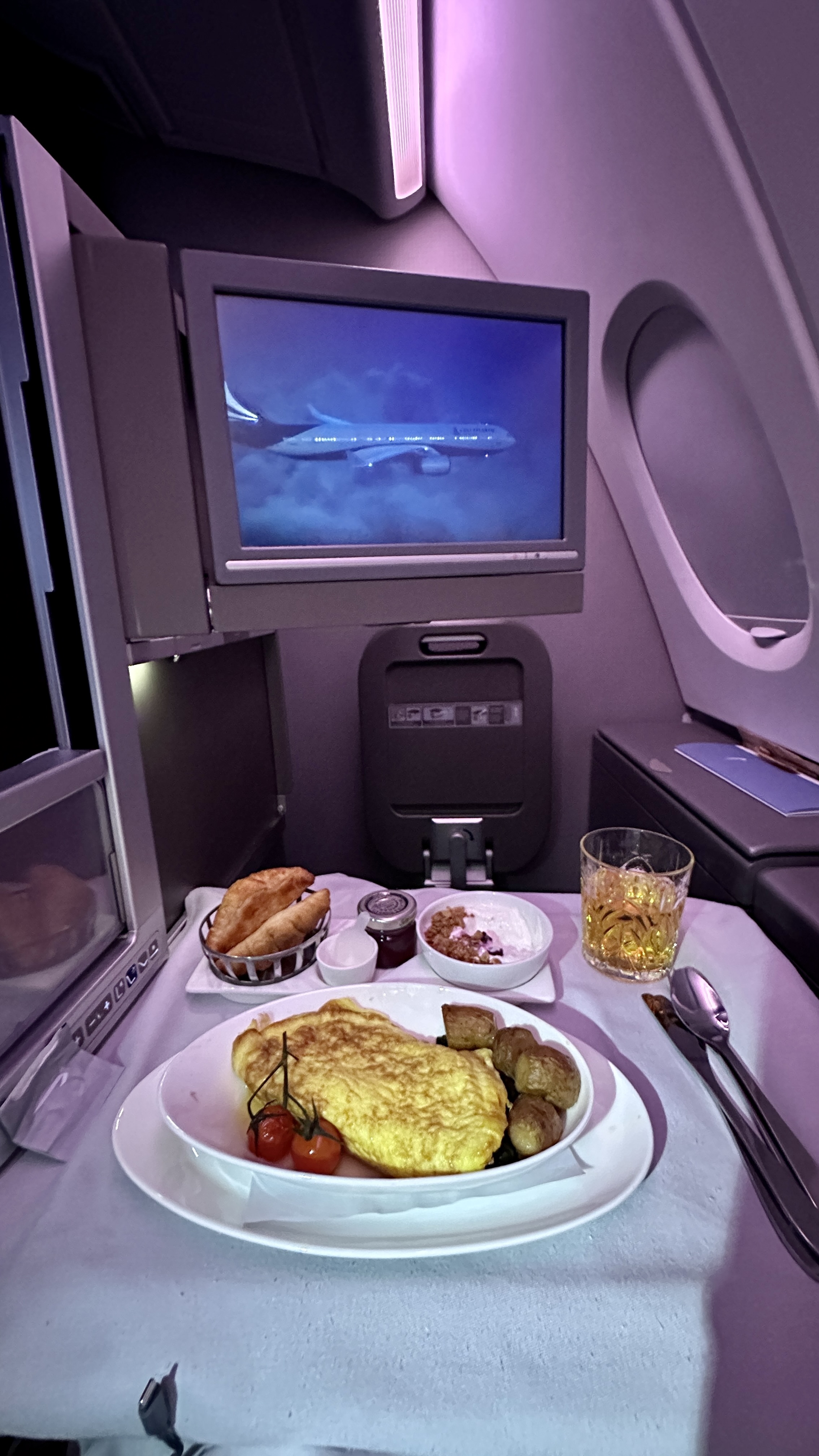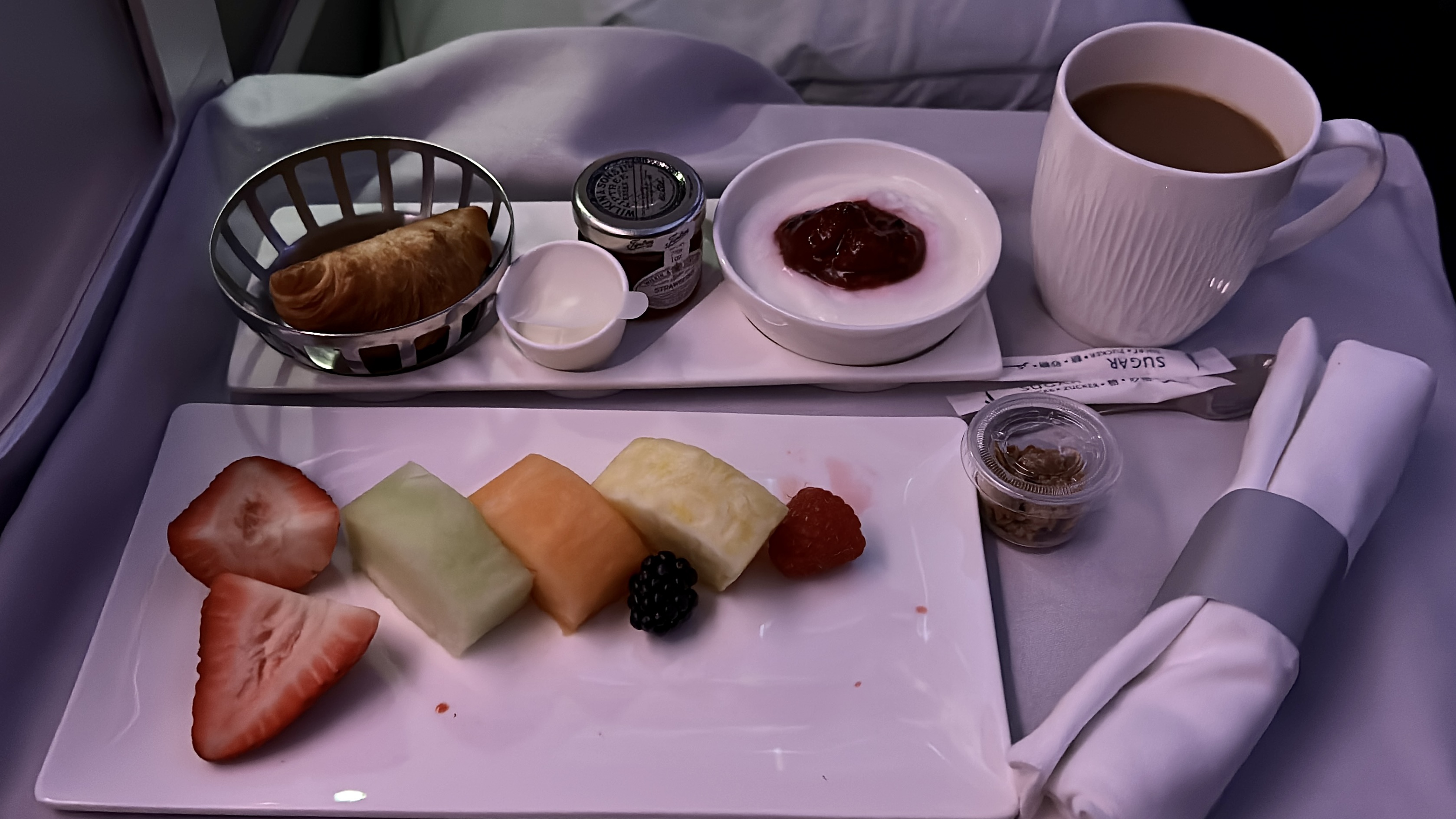 The Food – The catering provided by DO&CO on this flight was excellent. The food tasted fresh and delicious, and the starter dishes we ordered were particularly noteworthy. The Chicken Malai Korma and grilled swordfish we had for our main course during the dinner service were both scrumptious and flavorful. To cap off the meal, the toffee tart and sweet crepe we ordered for dessert were a decadent way to indulge our sweet tooth. The pre-arrival Full Breakfast dish that I had was generously portioned and equally delicious, while my companion enjoyed the ricotta omelet. Although there was no mid-flight meal service, the crew kind enough to set up the “Club Kitchen” snack bar near the galley, which offered a wide selection of snacks to choose from. Overall, the catering on this flight exceeded our expectations and made the journey more enjoyable.