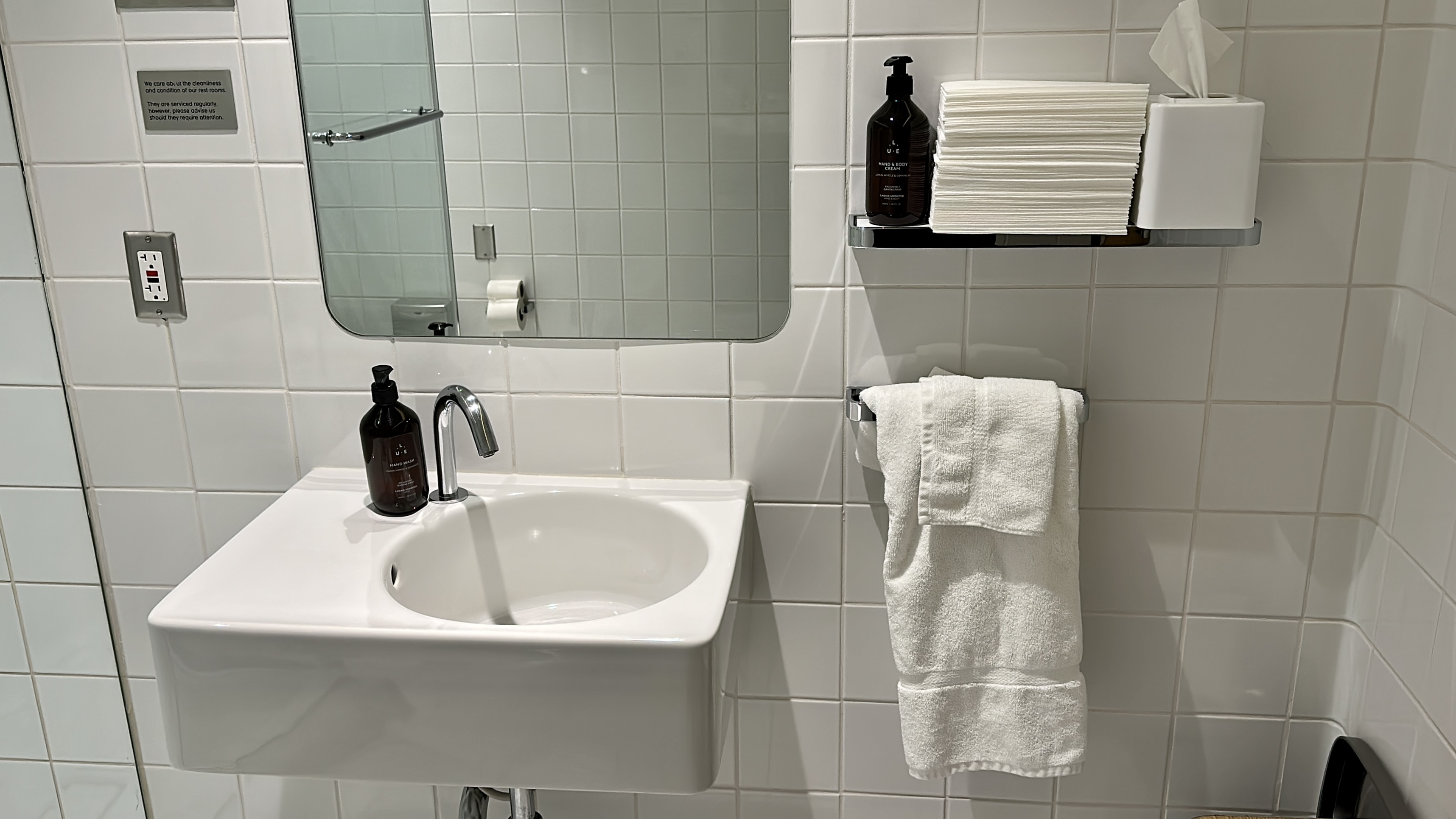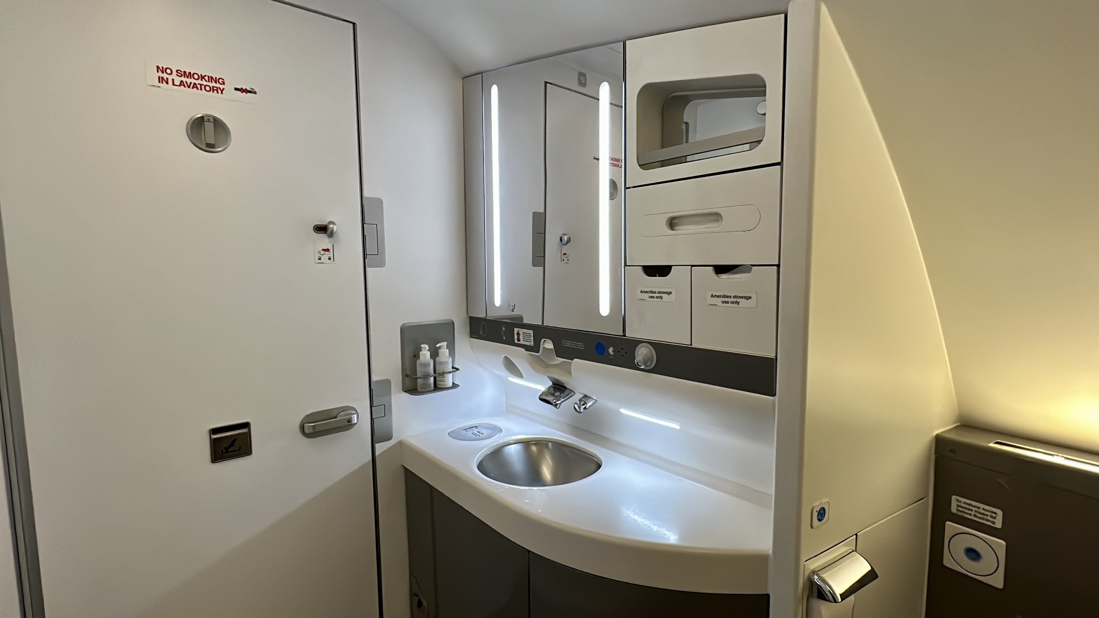 The Amenities – It is worth noting that British Airways does not provide pajamas or slippers for business class passengers, which may be disappointing to some travelers. However, I appreciated the black mini leather pouch provided by The White Company London. The bedding was also of high quality and included a comfortable mattress pad for making the bed. Additionally, the lavatories located in the front of the upper deck cabin were spacious and kept clean, with a good supply of toiletries available.