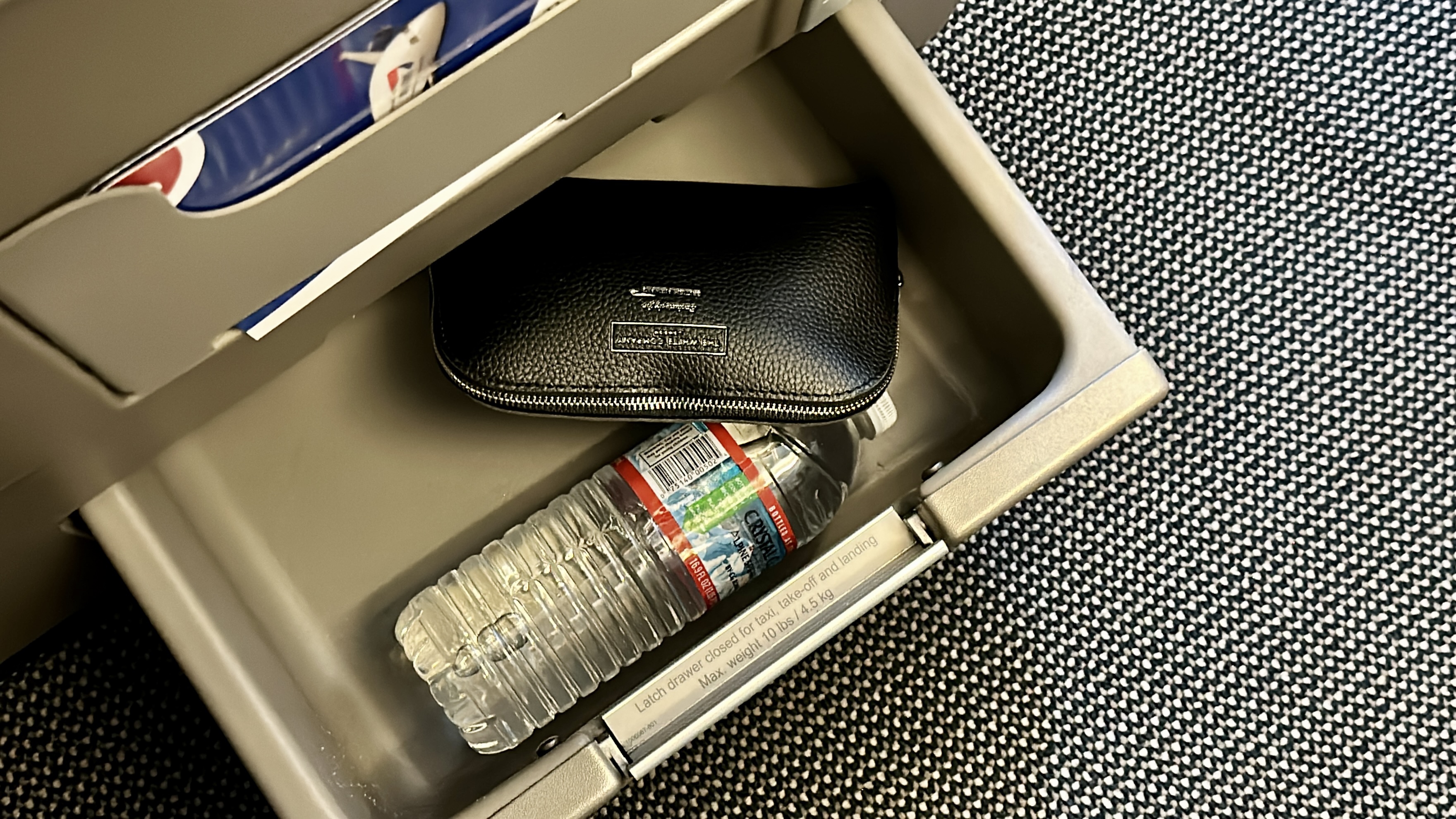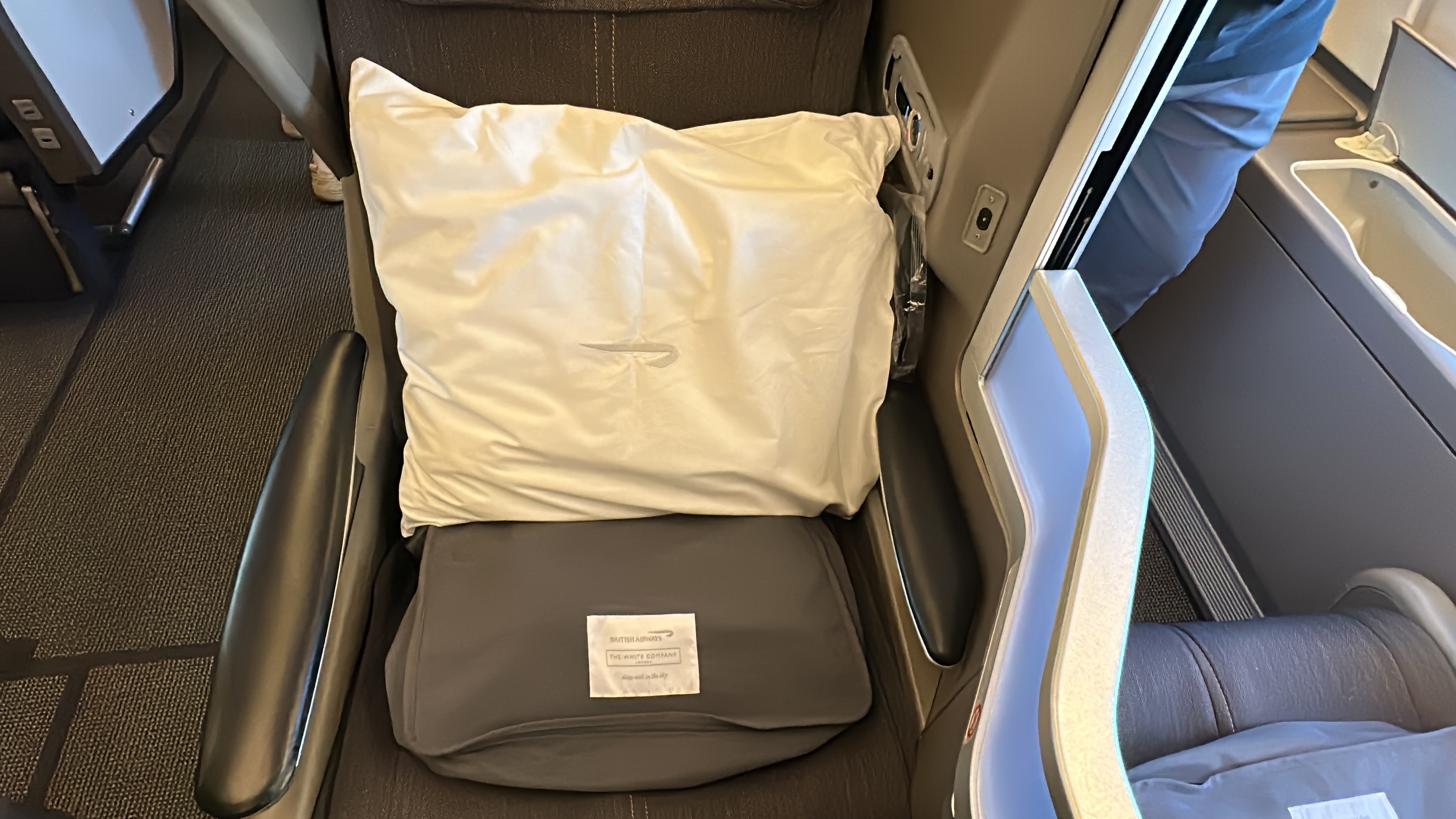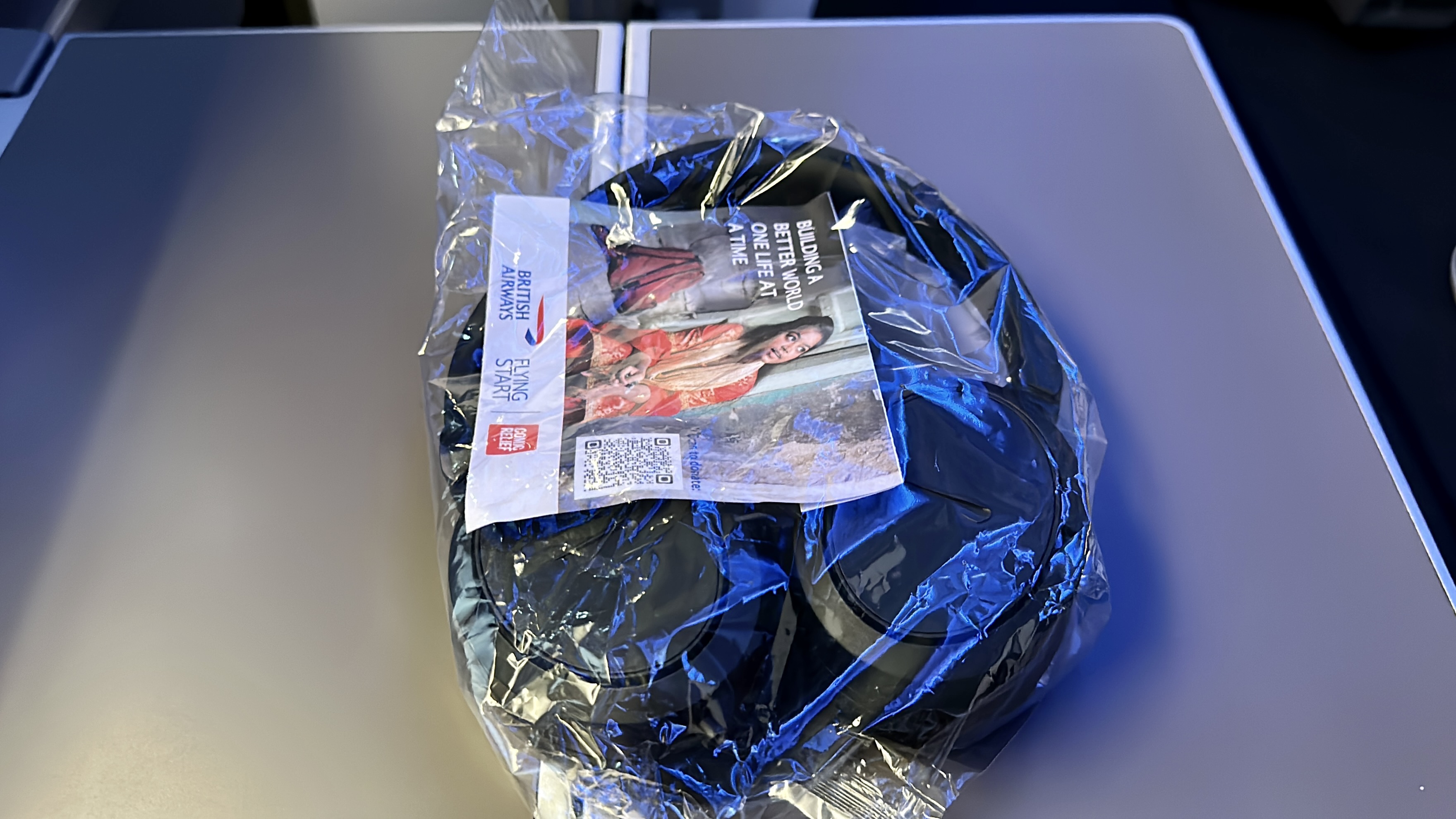 The business class amenities – While British Airways may not provide pajamas or slippers for business class passengers, they do offer some standard amenities. A black leather pouch provided by The White Company London, was waiting at our seats along with noise canceling headphones and bottled water. The bedding and pillow offered are of good quality, and the inclusion of a mattress pad made the seat comfort a little bit more bearable. Additionally, the lavatories located in the front of the upper deck cabin are spacious, regularly cleaned, and stocked toiletries.