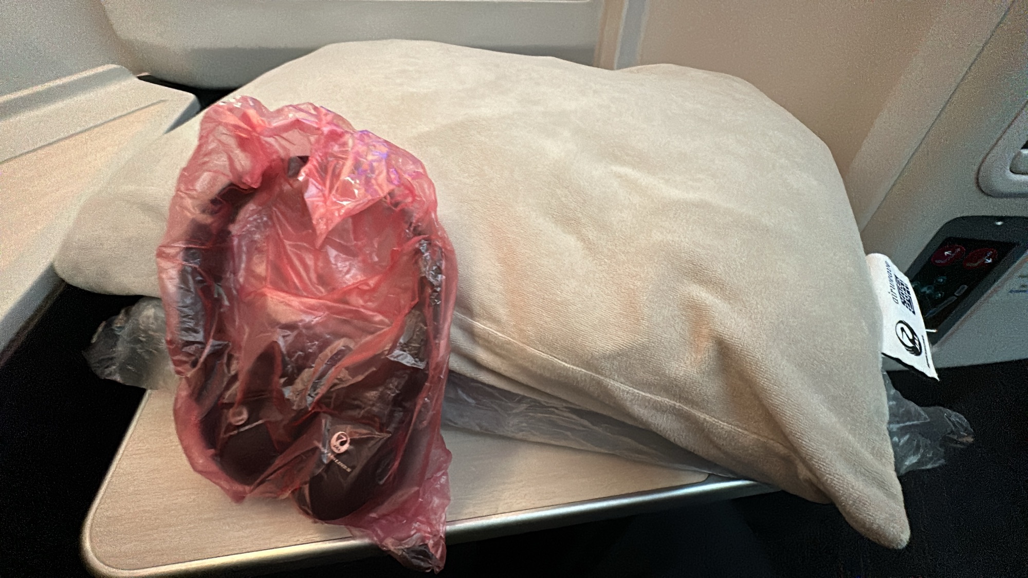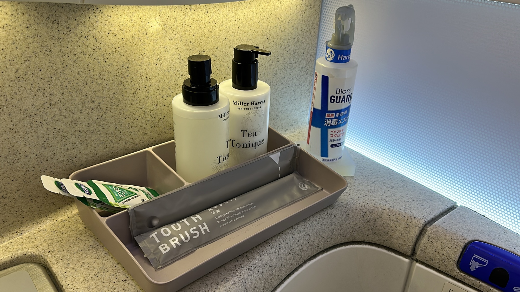 The Amenities: While JAL’s business class amenities weren’t extravagant, they were functional. While the absence of pajamas was notable, the provision of slippers, cardigans, and Maison Kitsune amenity kits, along with clean lavatories equipped with Toto washlets, added to the overall comfort of the flight.
