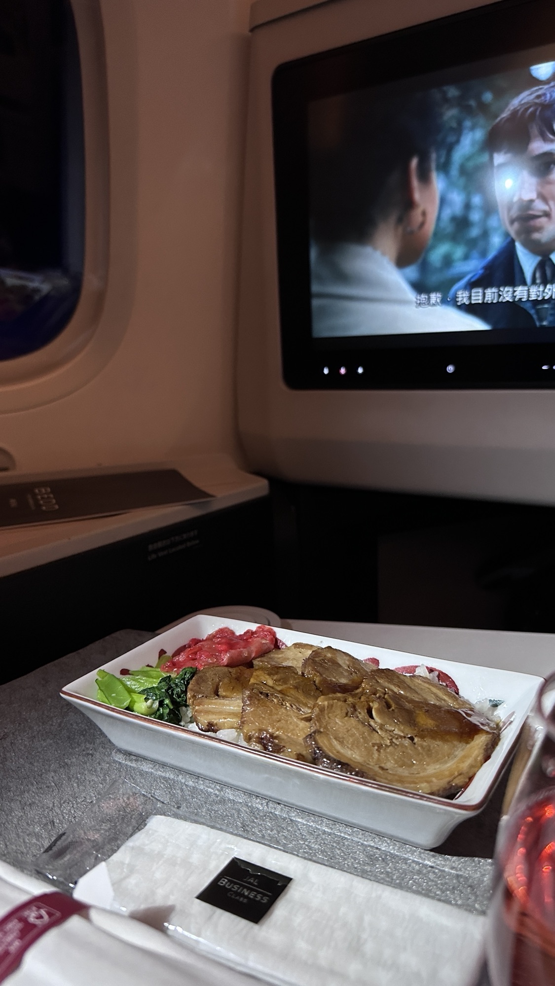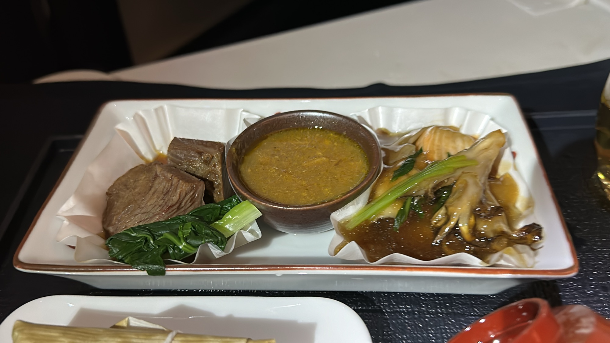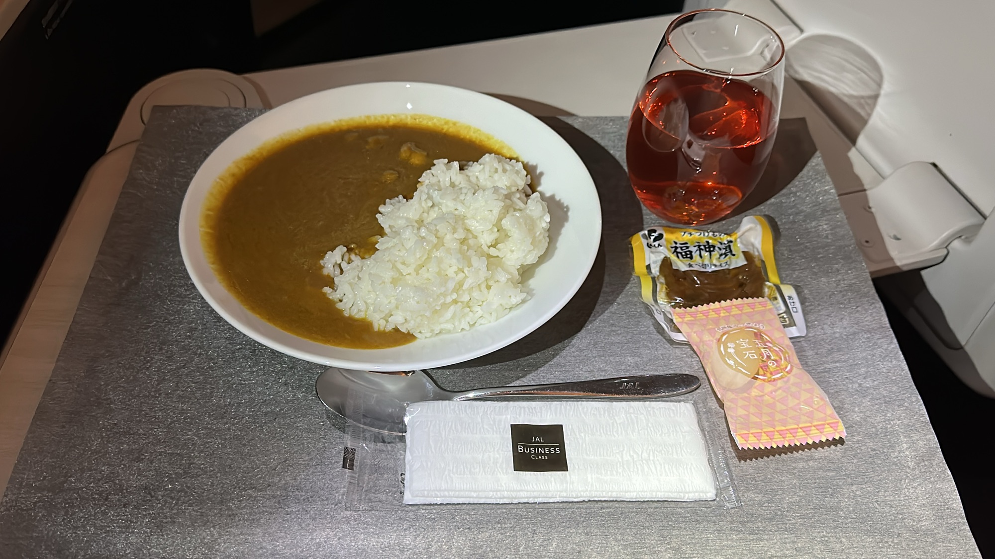 The in-flight Catering : Our dining experience on the Tokyo flight was nothing short of exceptional. From restaurant-quality meals to the flexibility of the dine-on-demand service, JAL sets a high standard. The Japanese meal was a delightful blend of freshness and elegance, while the wagyu sirloin was a testament to culinary expertise. As a perfect conclusion, the Miyazaki Wagyu Beef Curry and char siu rice bowl for our pre-landing meal were hearty and flavorful.