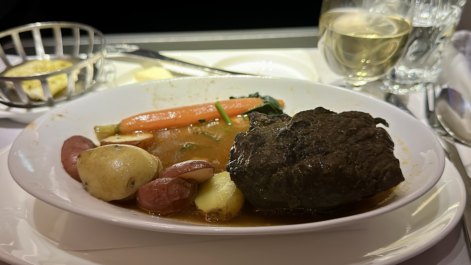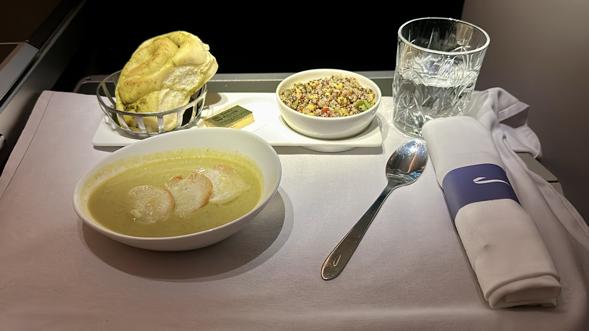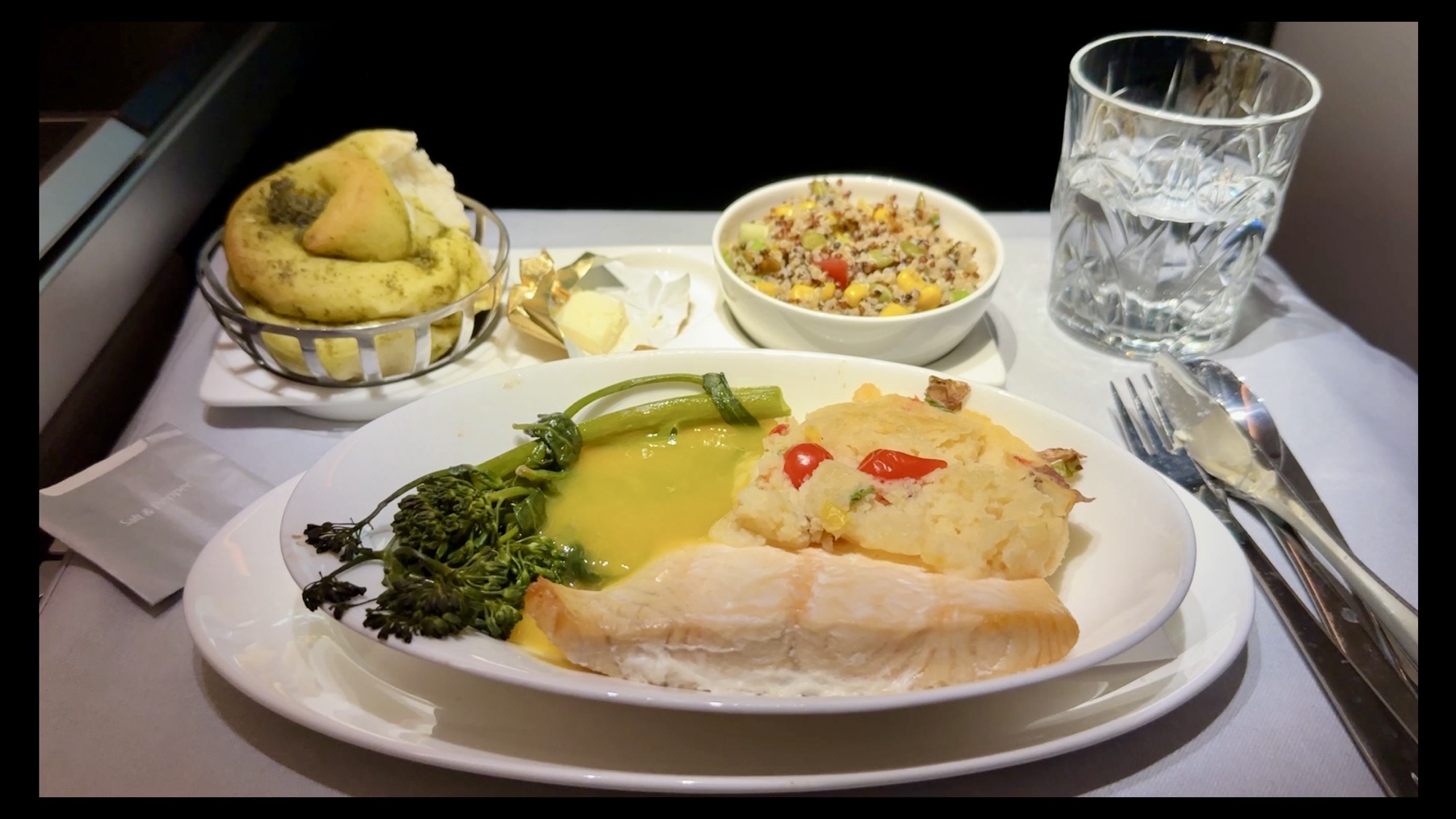 The Food – The catering on this flight, was exceptional and far exceeded our expectations. Every dish was fresh, flavorful, and beautifully presented. For starters, my companion enjoyed the beef bresaola plate, while I opted for the broccoli and cheddar soup—both dishes were served with warm artisan bread and a side of quinoa salad. For the main course, I had the beef short rib, which was incredibly tender and packed with flavor, while my companion’s honey-roasted salmon was light, flaky, and perfectly cooked. We both chose the banana caramel bread pudding for dessert, which was decadent and a perfect way to end the meal. Although there was no mid-flight meal service, the crew set up the Club Kitchen snack bar near the galley for those looking for a quick bite. About an hour and a half before landing, a pre-arrival meal was served, starting with a plate of fresh fruit and followed by a hearty full English breakfast. Overall, the catering on this flight not only surpassed our expectations but also played a significant role in making the journey more enjoyable.
